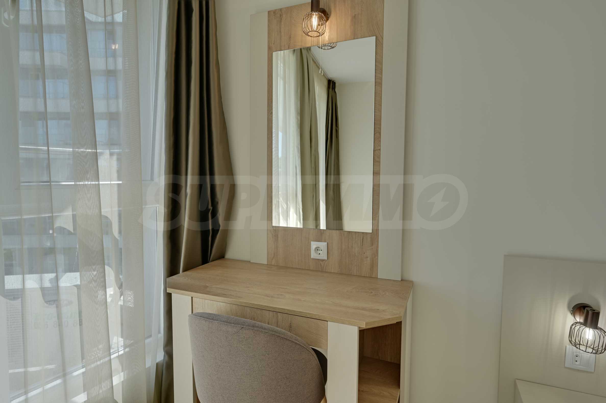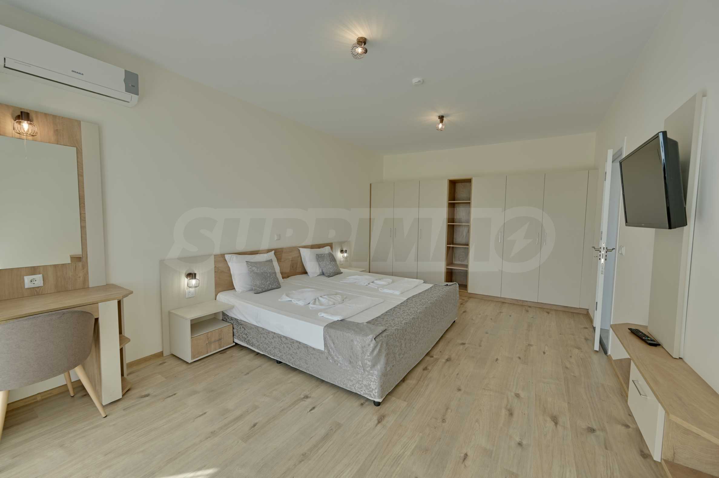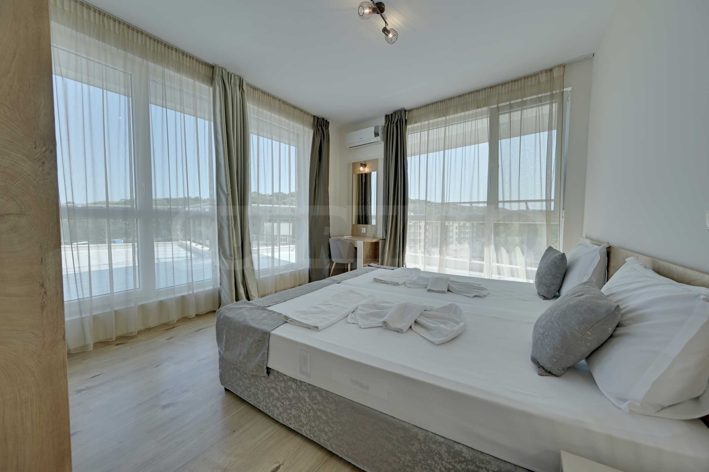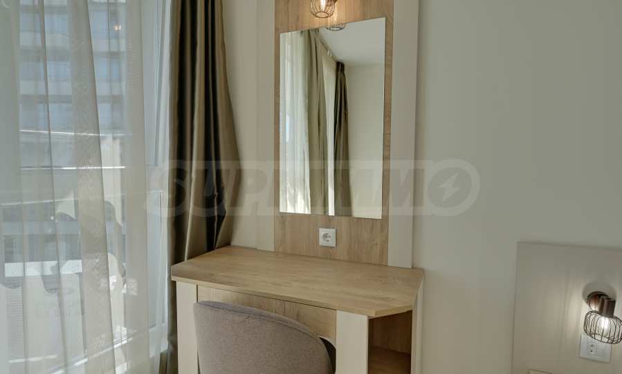Жилището се продава напълно обзаведено, с внимание към всеки детайл, и е готово за нанасяне или отдаване под наем. Сградата разполага с отлично поддържани общи части, басейн, рецепция и допълнителни удобства, характерни за високия клас на хотела.