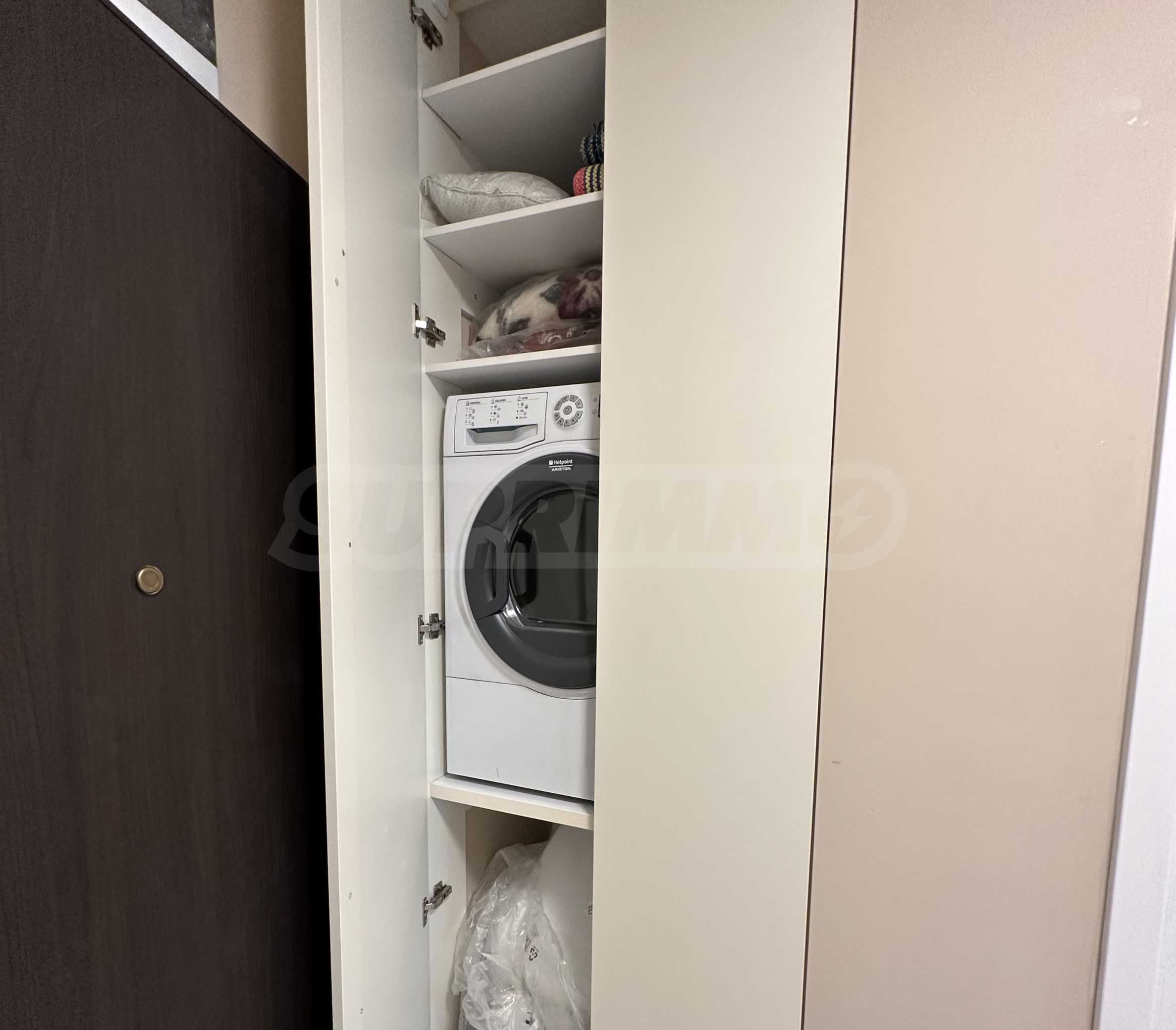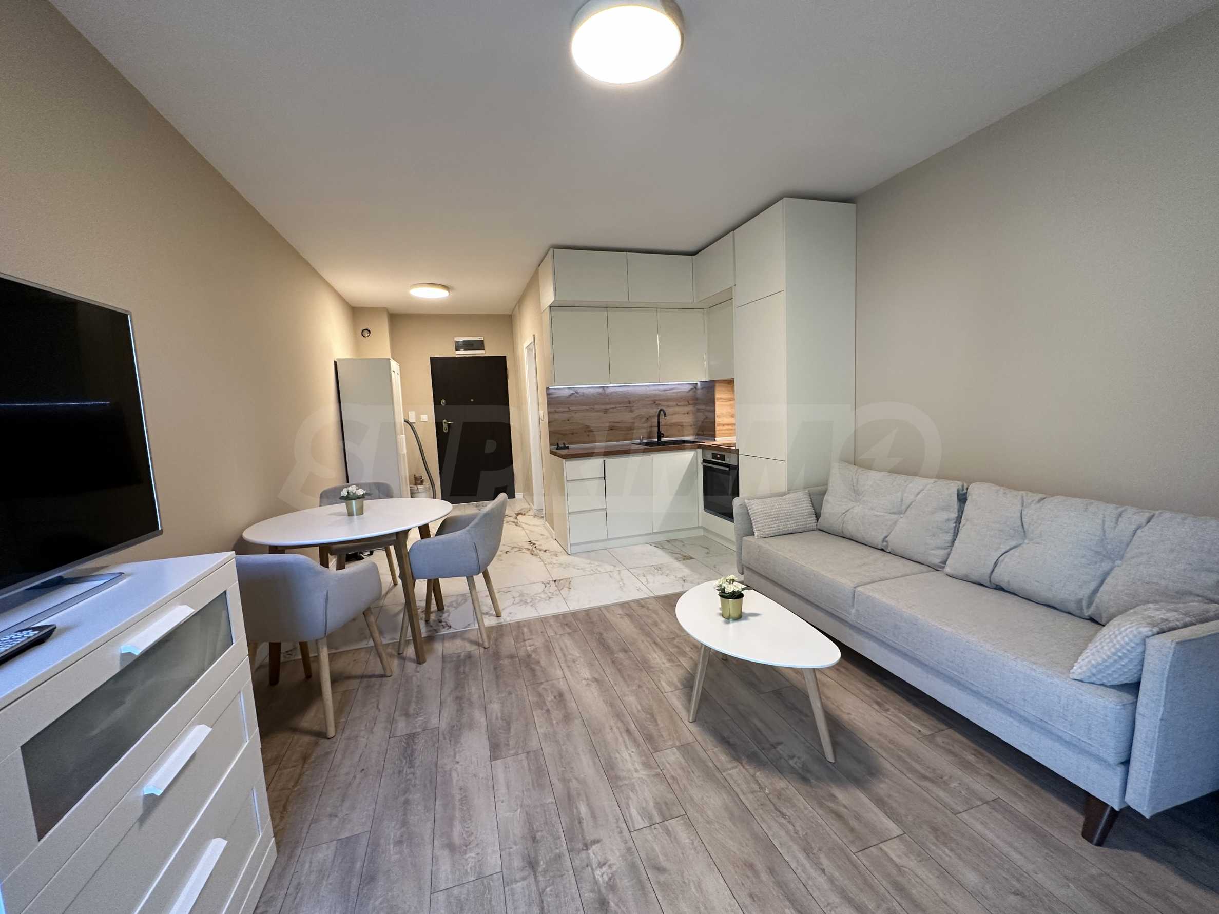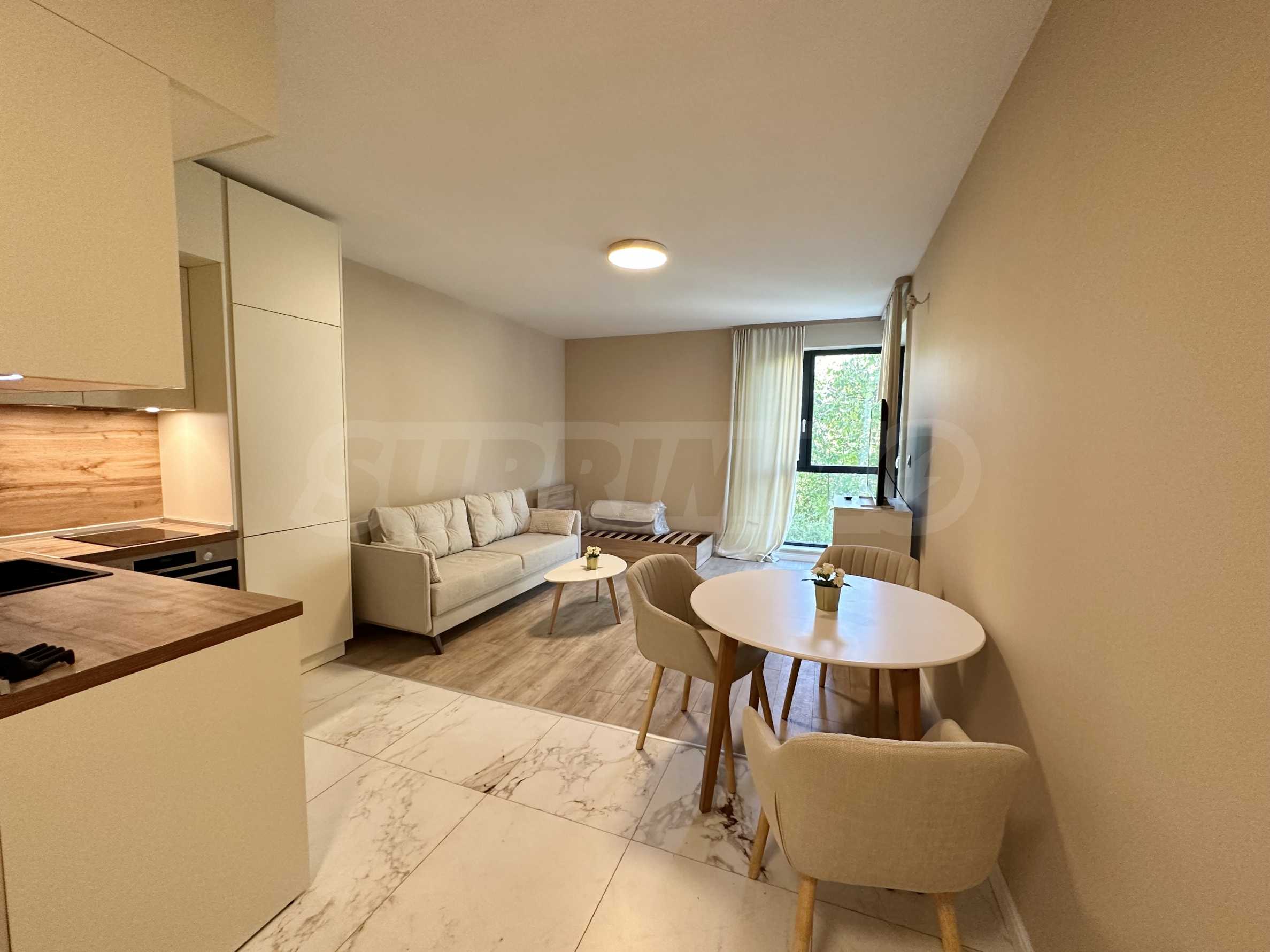 Апартаментът е с изложение юг-изток, изключително слънчев и светъл, обзаведен с много вкус и внимание към всеки детайл. Кухнята е от висок клас, изработена от МДФ, с италиански механизми и оборудвана с електроуреди Bosch.