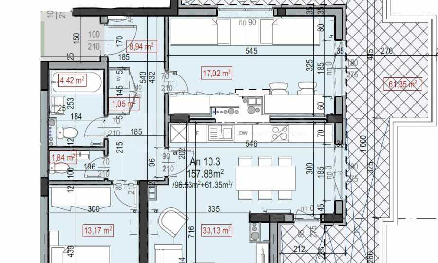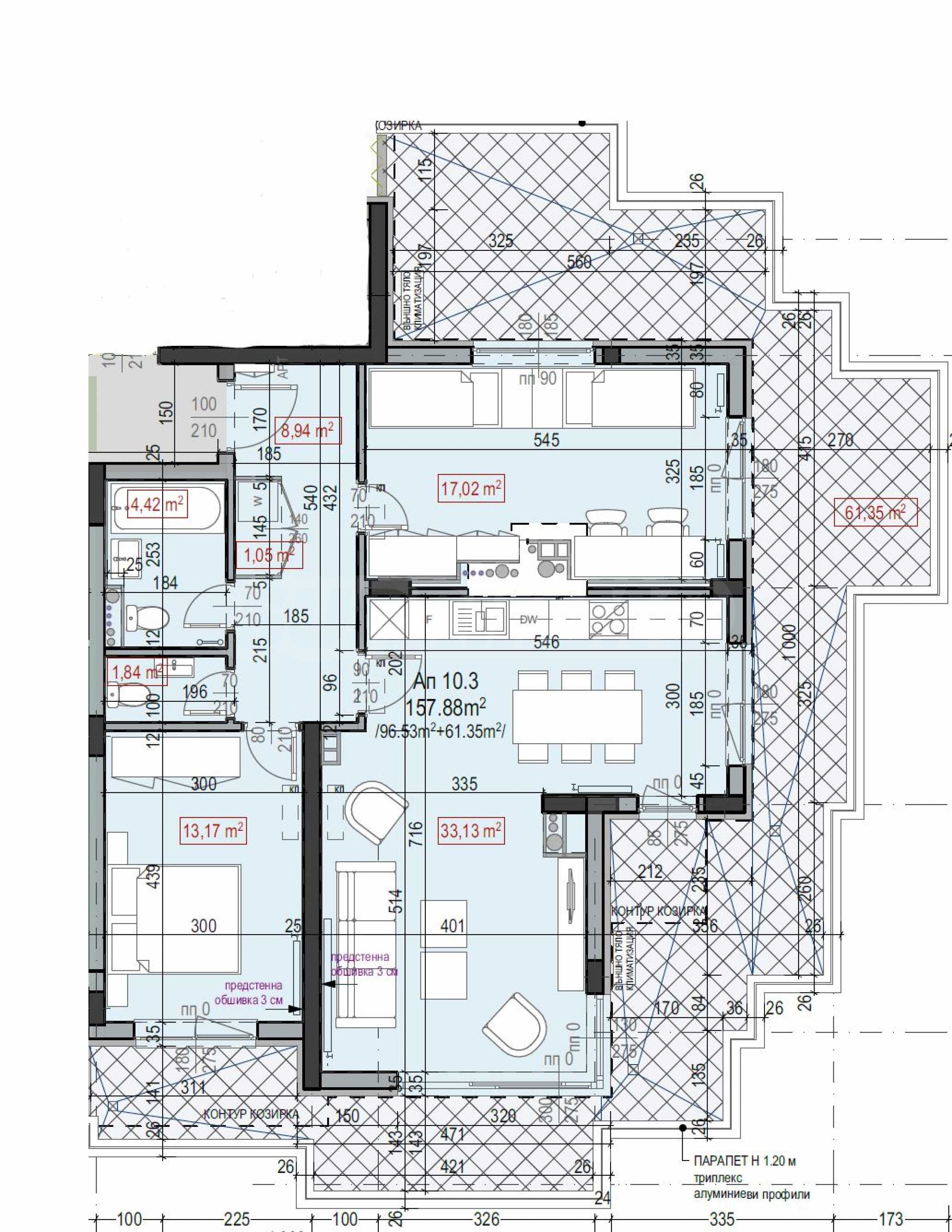 голяма тераса от 61,35 кв.м., която обгражда апартамента и е достъпна от всяка стая.