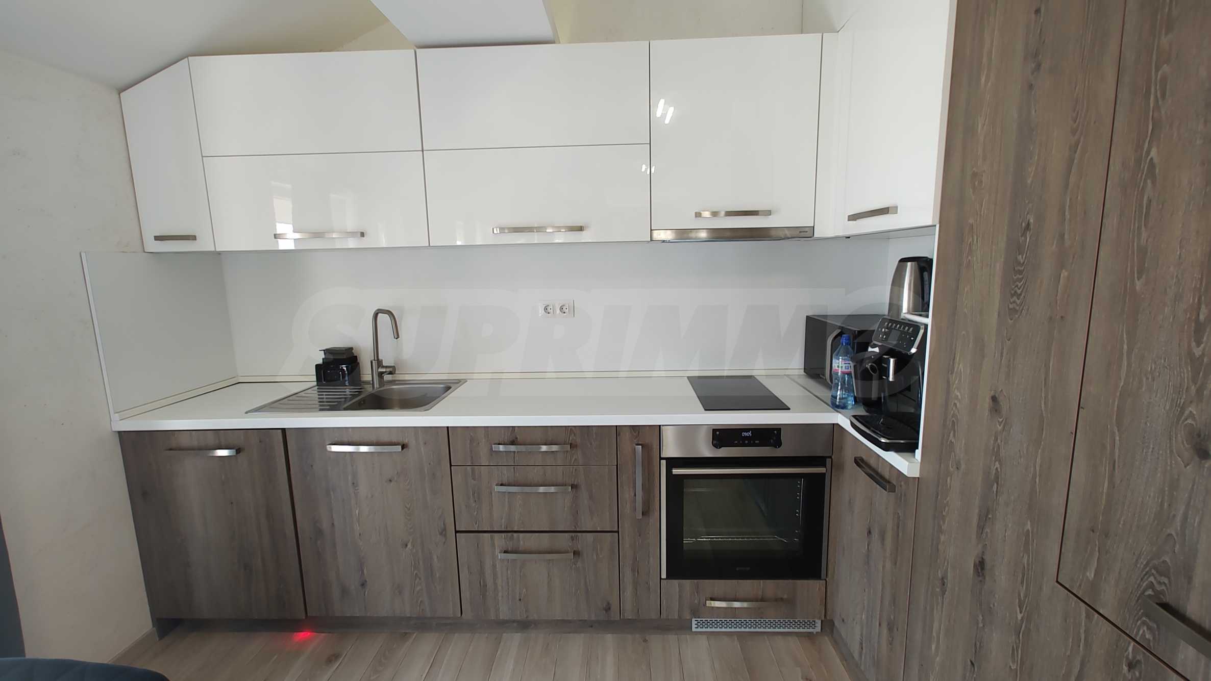 - Кухня с трапезария, напълно оборудвана с вградена кухня, голям хладилник, фурна и съдомиялна;