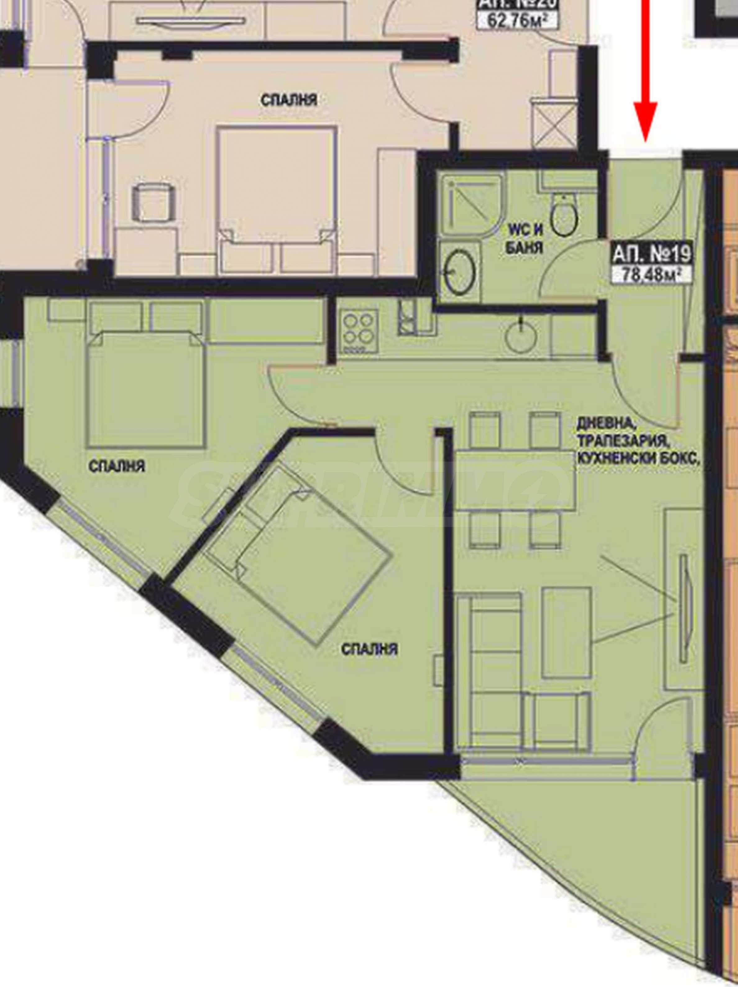Апартаментът е с обща площ 78.48 кв.м, разположен е на 2-ри етаж.