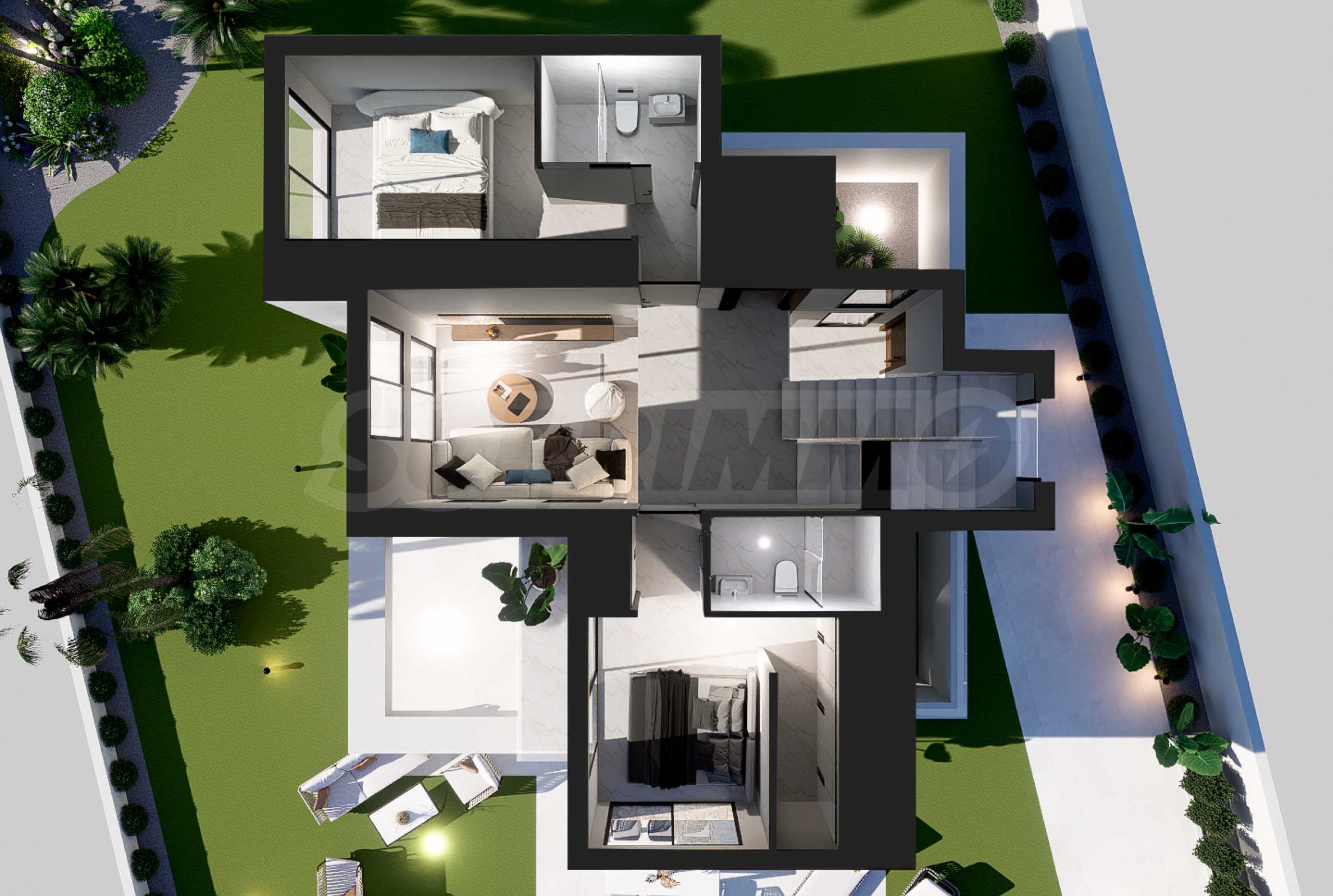 Фасадата съчетава съвременен стил и традиционни елементи – облицовка от дялан камък, характерен за региона. Просторните помещения, големите прозорци и функционалното разпределение създават усещане за светлина, уют и изисканост. PVC дограмата с двоен стъклопакет допринася за отлична енергийна ефективност.