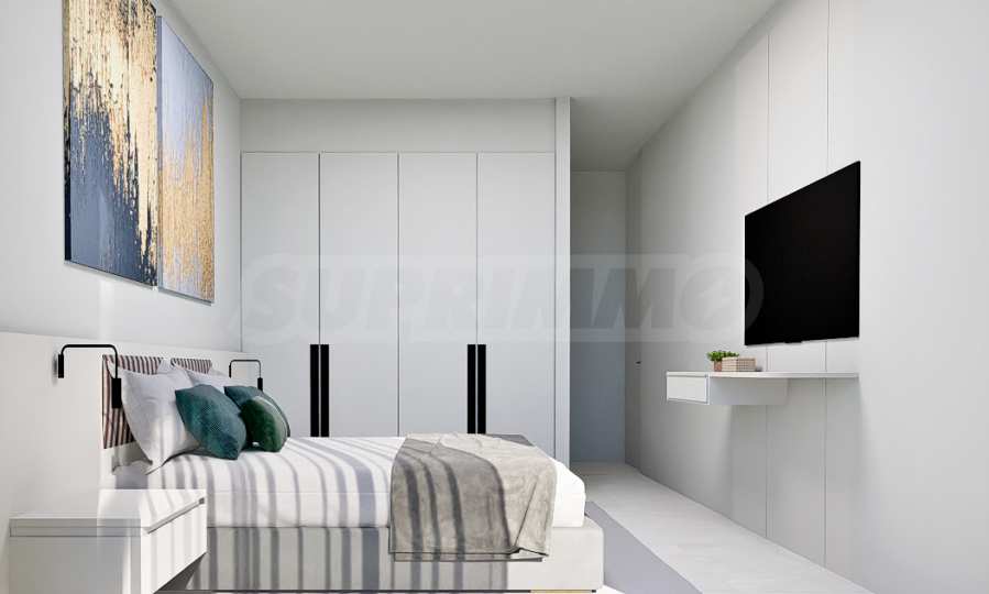 Във вътрешното оформление са използвани висококачествени материали: гранитогрес с дървесен ефект в дневната зона и на верандата, както и естествен паркет в спалните. Кухнята е напълно оборудвана с уреди от най-висок клас, шкафове с изчистен дизайн и скрити дръжки, порцеланови плотове и мивка от неръждаема стомана.