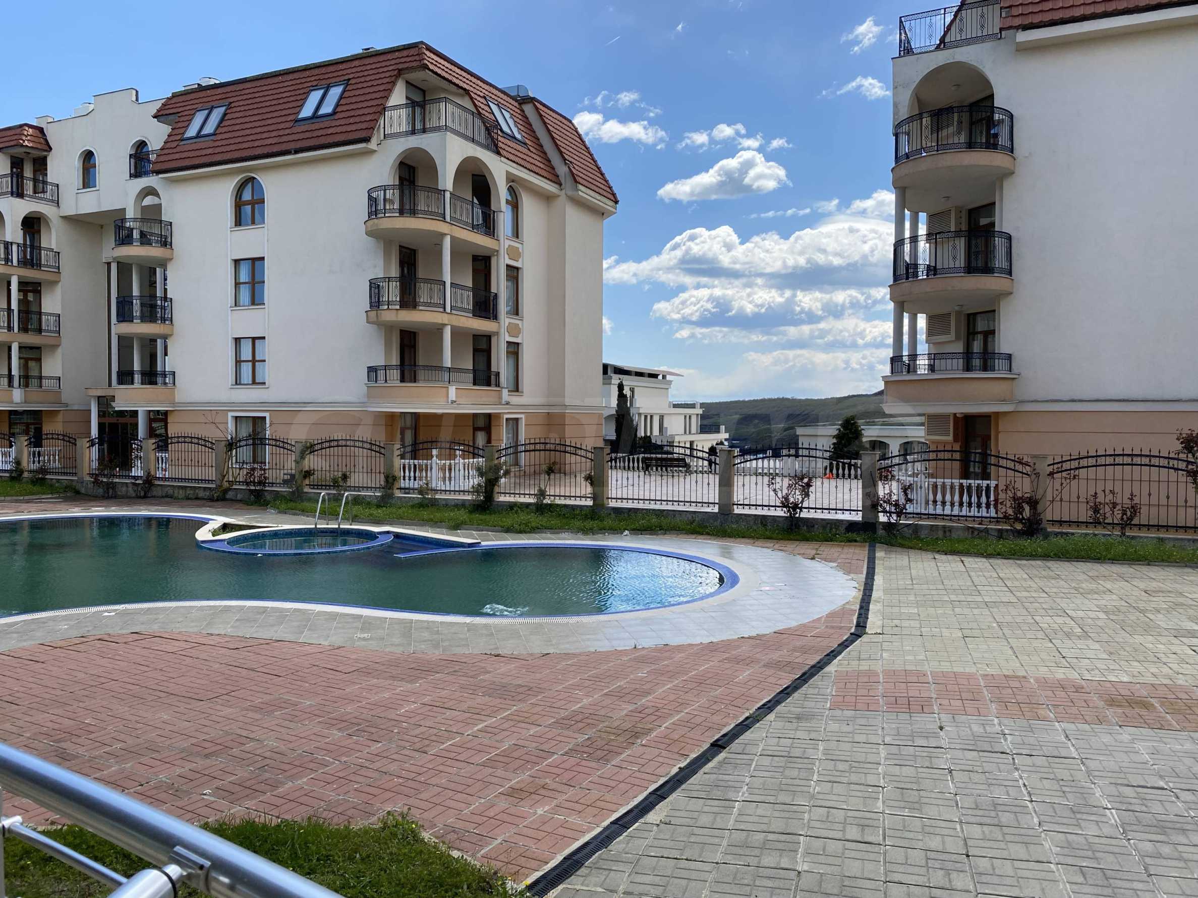 Имотът е с обща площ 80,10 кв.м, разположен на 1-ви етаж и се състои от антре, кухня с трапезария, спален кът, баня с тоалет и тераса с гледка към морето и басейна.