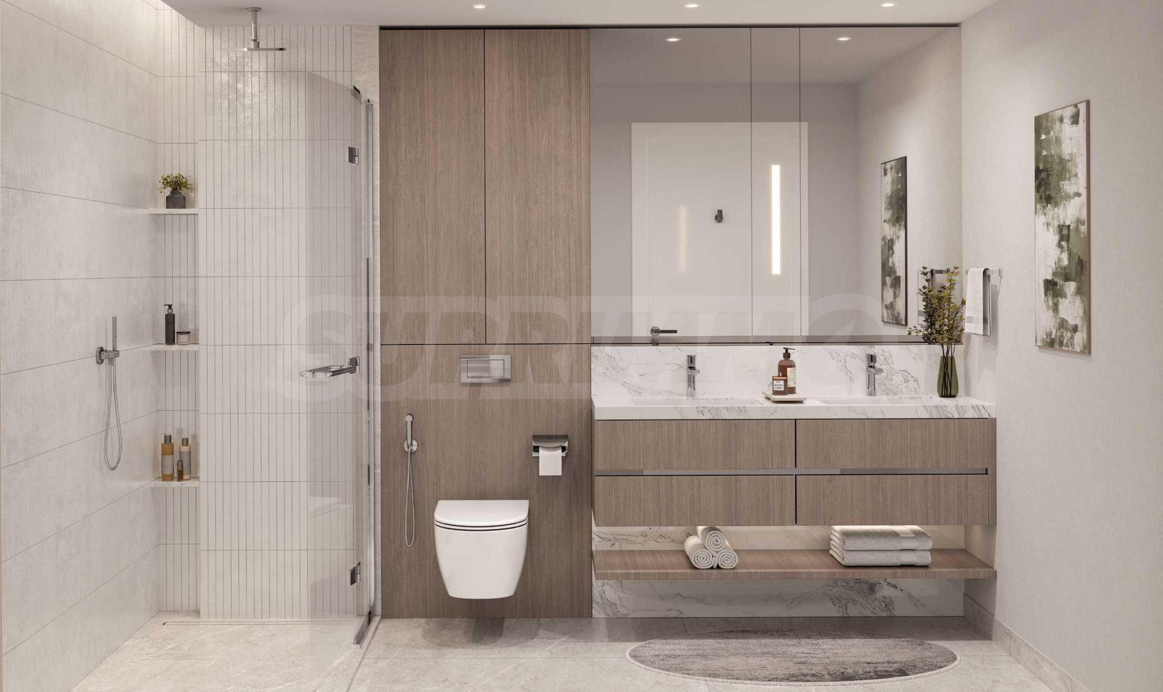 Всяко жилище посреща своите обитатели с врати, по-големи от стандартното, които внасят фин акцент на елегантност. Подовете са покрити с големи порцеланови плочи в светли тонове, придаващи свежест и допълнителна просторност на интериора. Кухните са завършени и оборудвани – с елегантни шкафове, висок клас уреди и каменни плотове, допълнени от вградена мивка от неръждаема стомана. Всички детайли са съчетани така, че да създават перфектната среда за Вашите кулинарни вдъхновения.