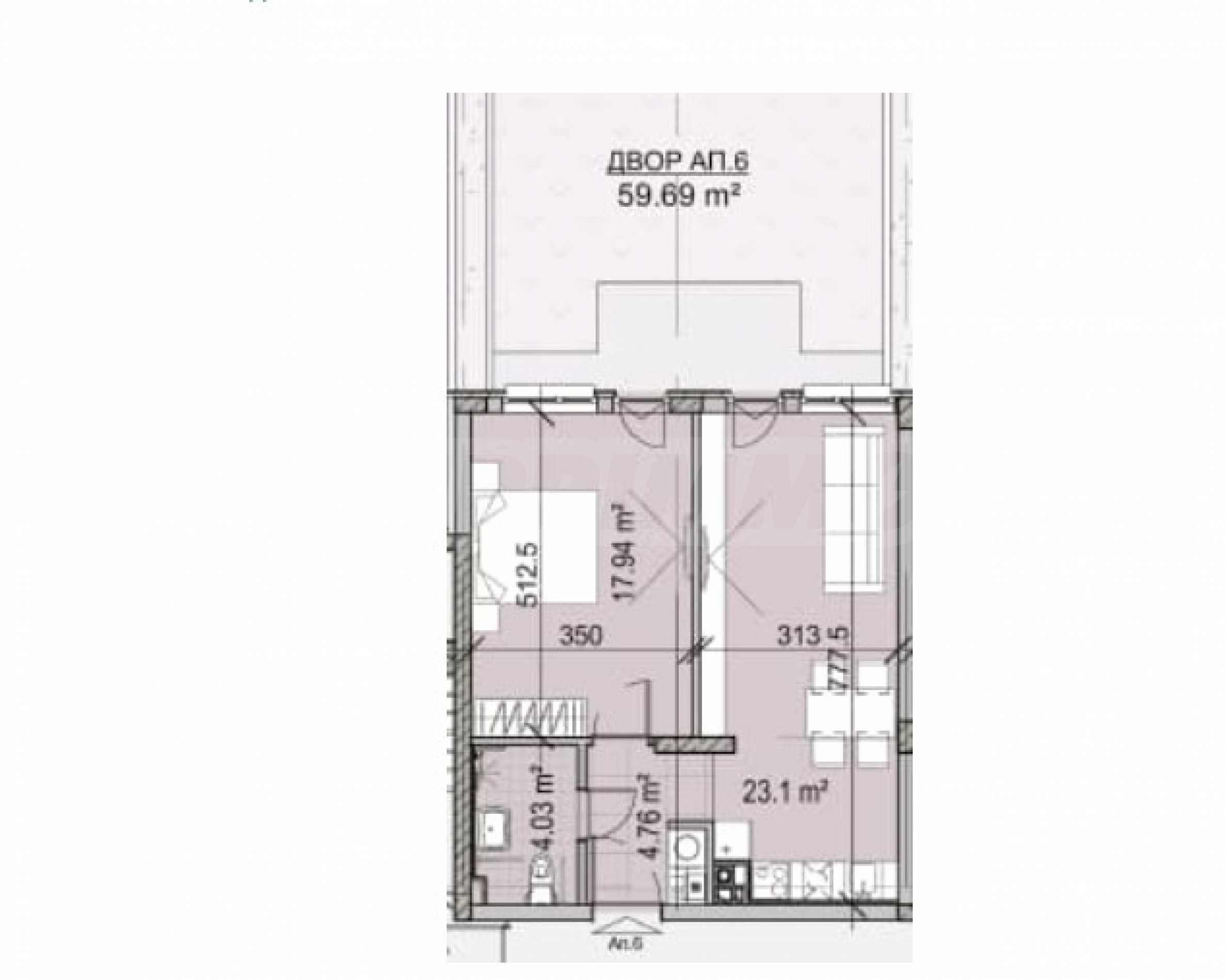 Апартамент №6 е разположен на първи етаж и има обща площ 71.08 кв.м, чиста площ - 58.29 кв.м, двор - 59.69 кв.м, склад - 1.75 кв.м.
