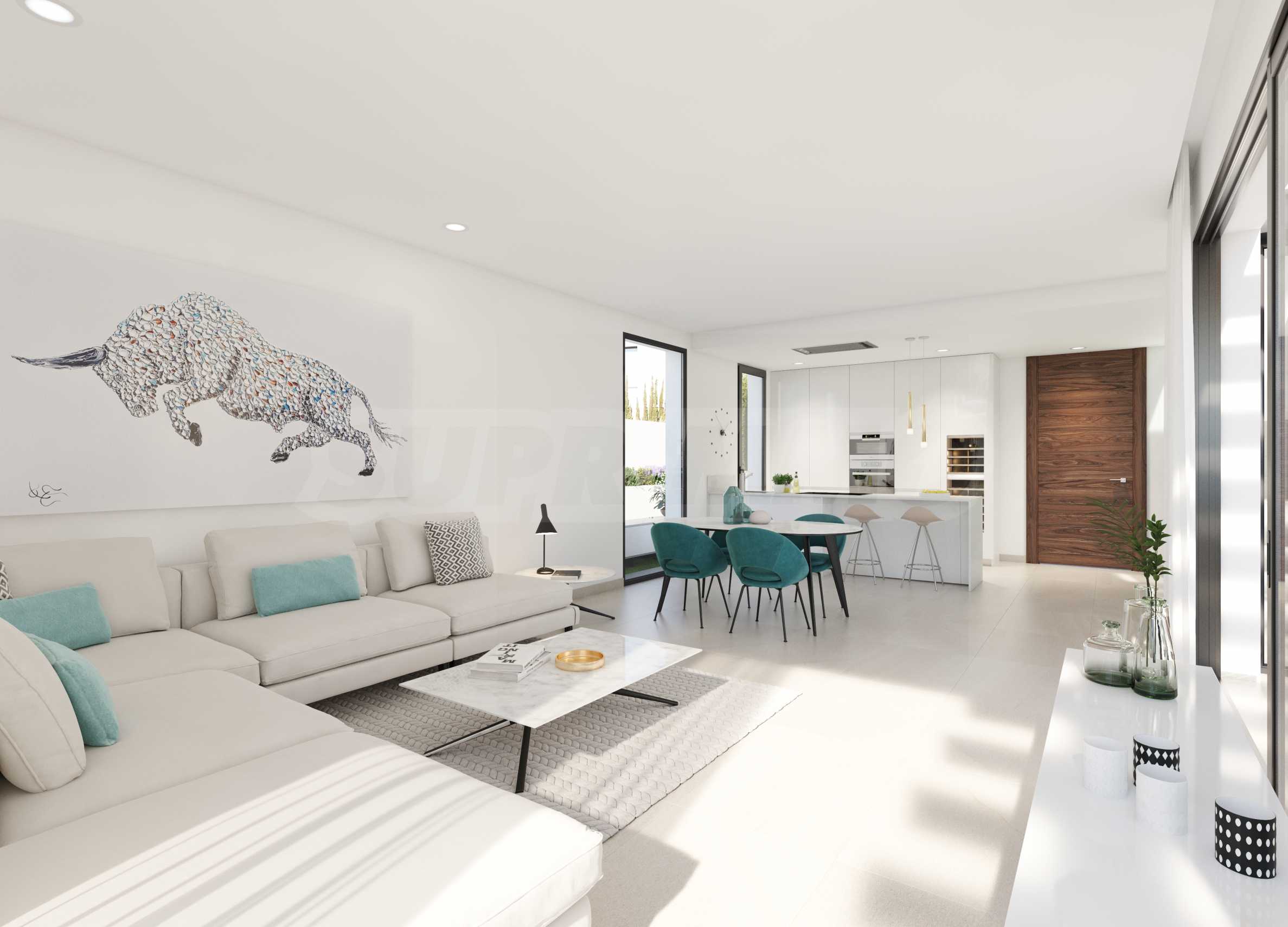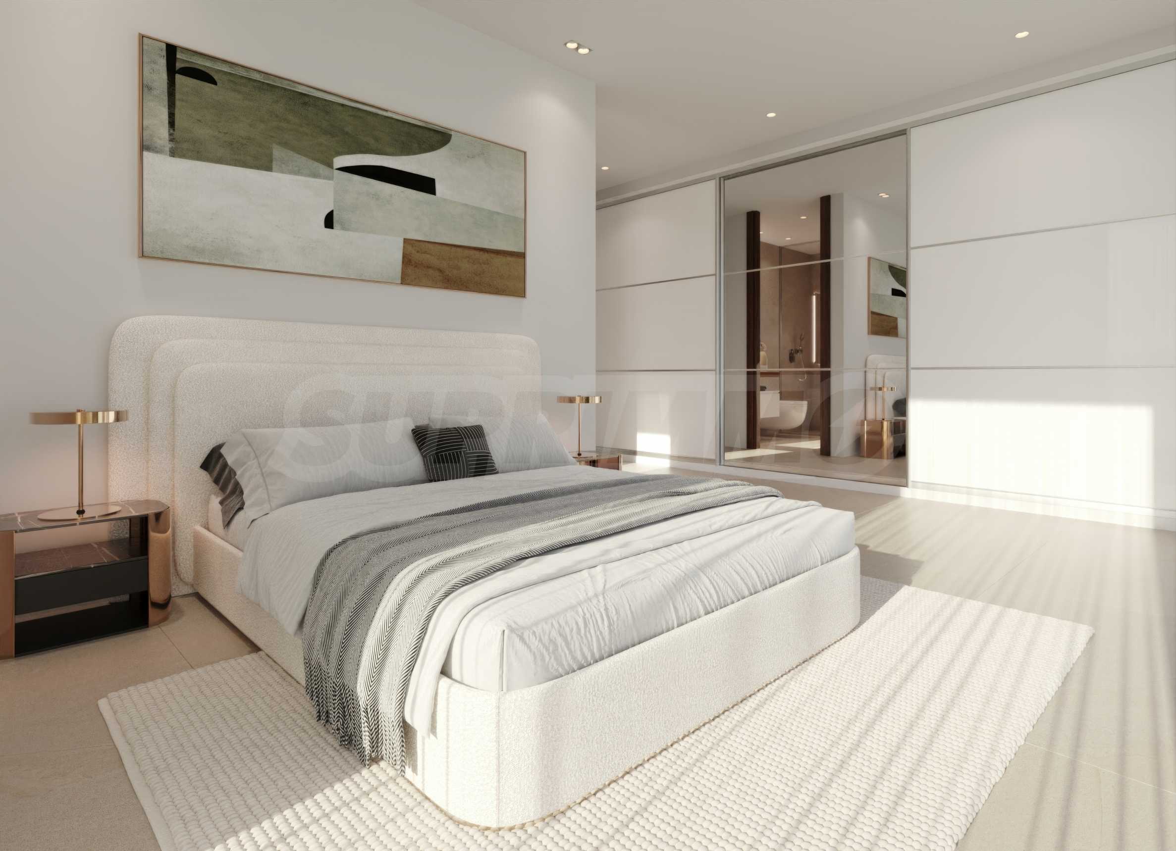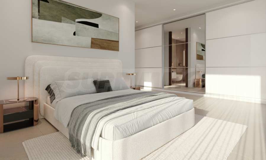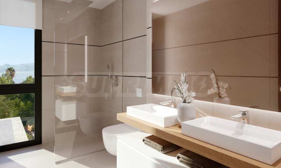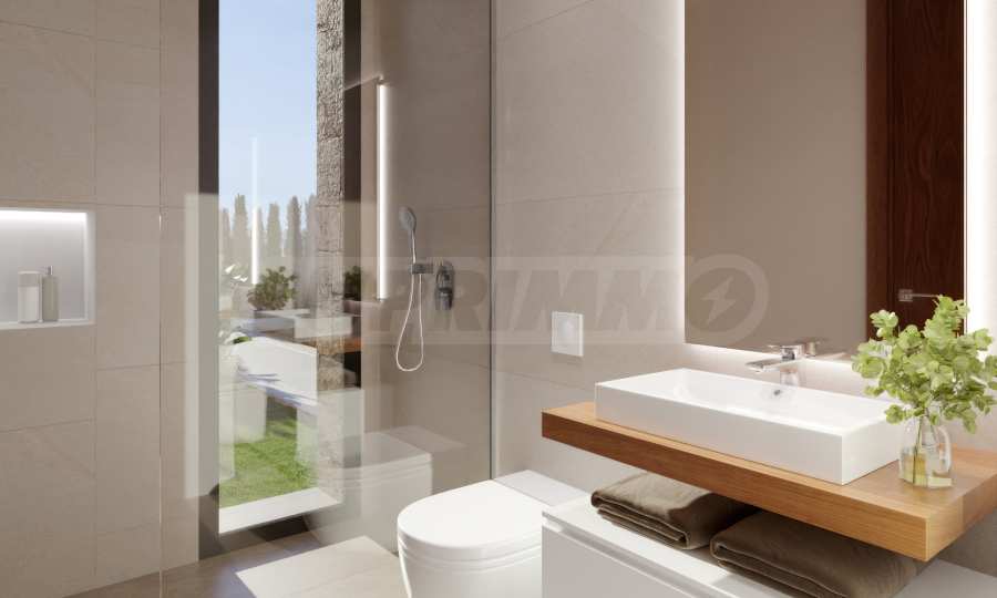 Вилата се предлага със завършена кухня, като за шкафовете е заложено на елегантно бяло, а електроуредите са Bosch или друг бранд, предлагащ същото качество. Баните са просторни и планирани като СПА преживявания.