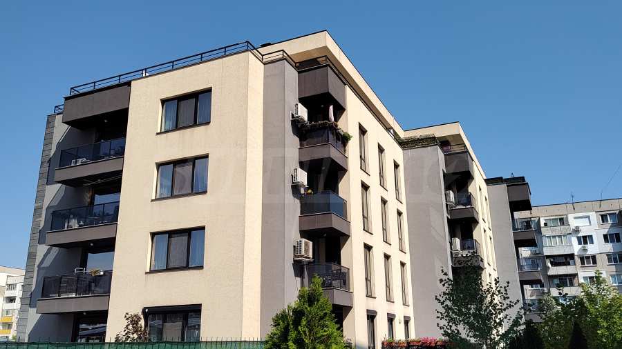Жилището е разположено на последен 6-ти етаж в модерна сграда с асансьор (Акт 16 от 2019 г.), с добре поддържани общи части, видеонаблюдение, контролиран достъп и обособен двор с детска площадка и зелени площи.
