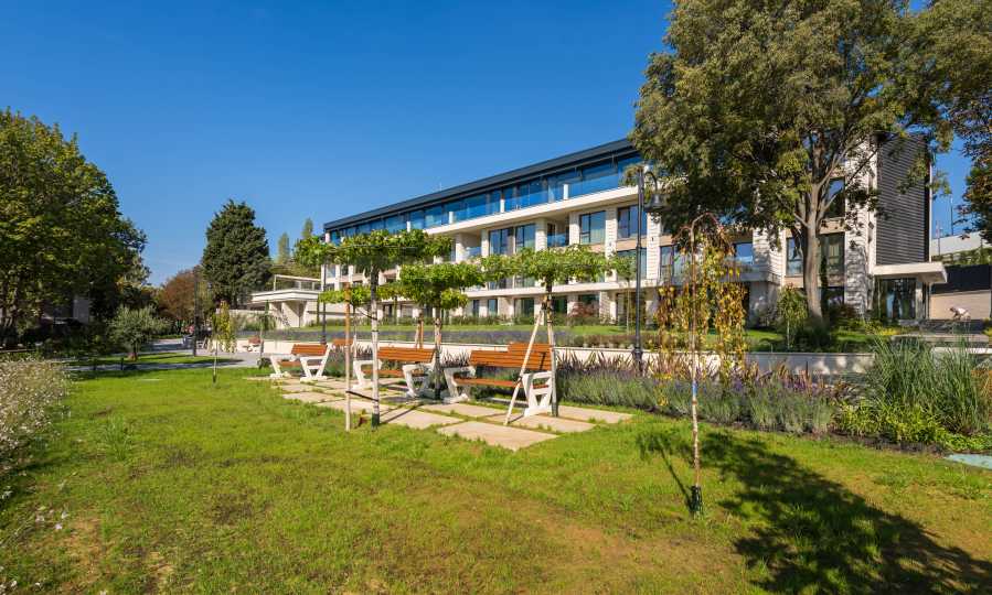 Комплексът е с контролиран достъп, басейн и богато озеленени общи части. Гарантира тишина, сигурност и усещане за уединение, като същевременно е на минути от градските удобства и морето.