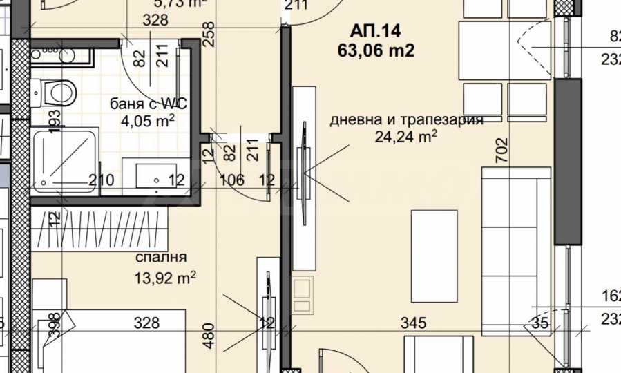 Апартаментът се предлага в степен на завършеност по БДС, което Ви дава свободата да го завършите по свой вкус.