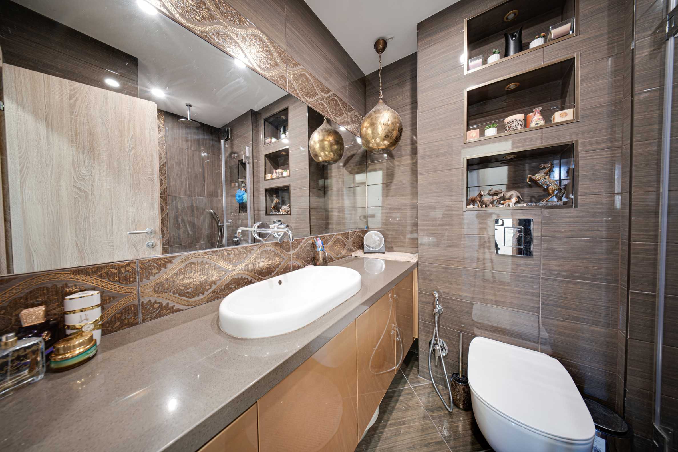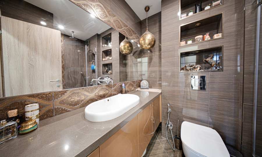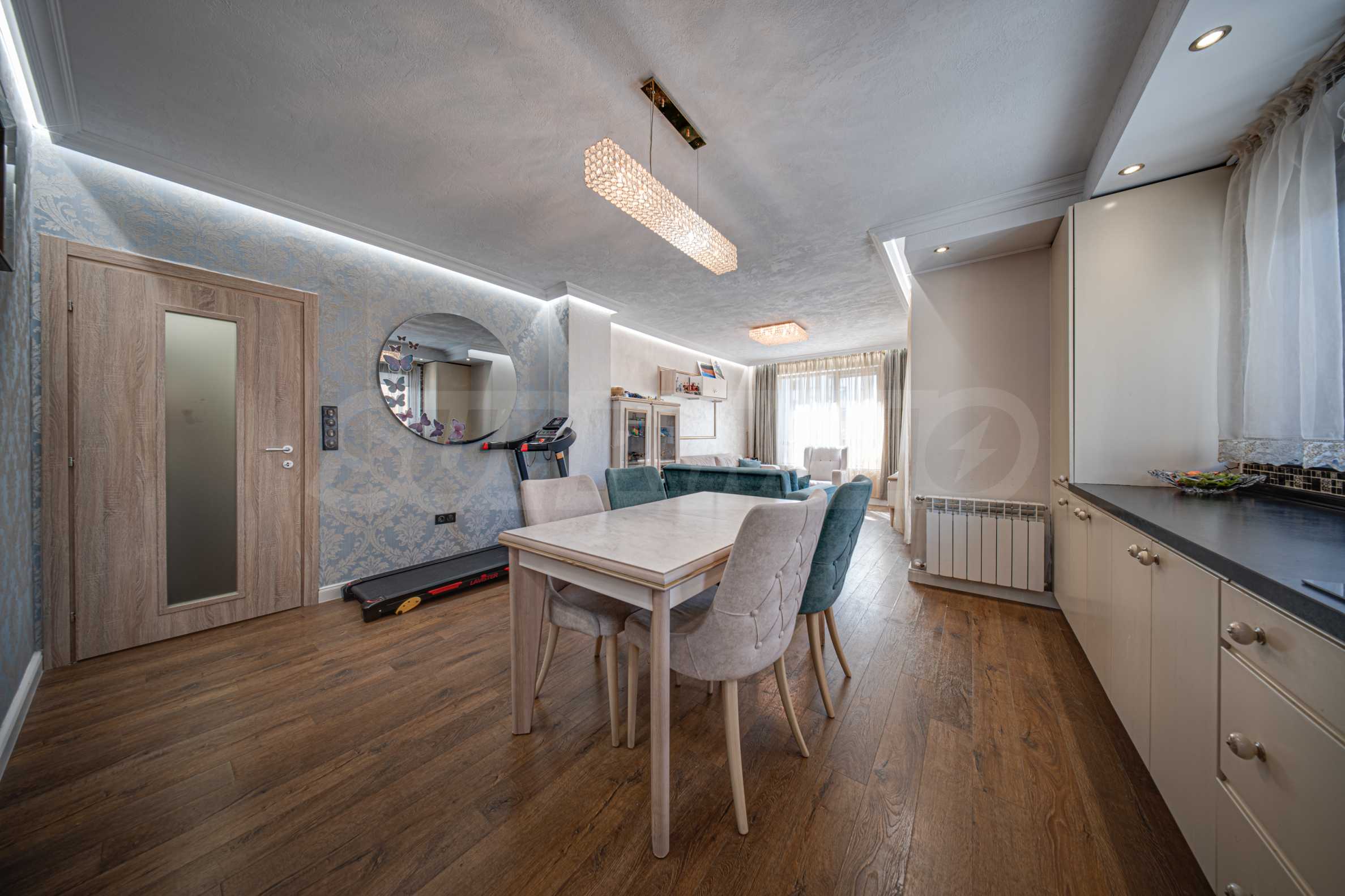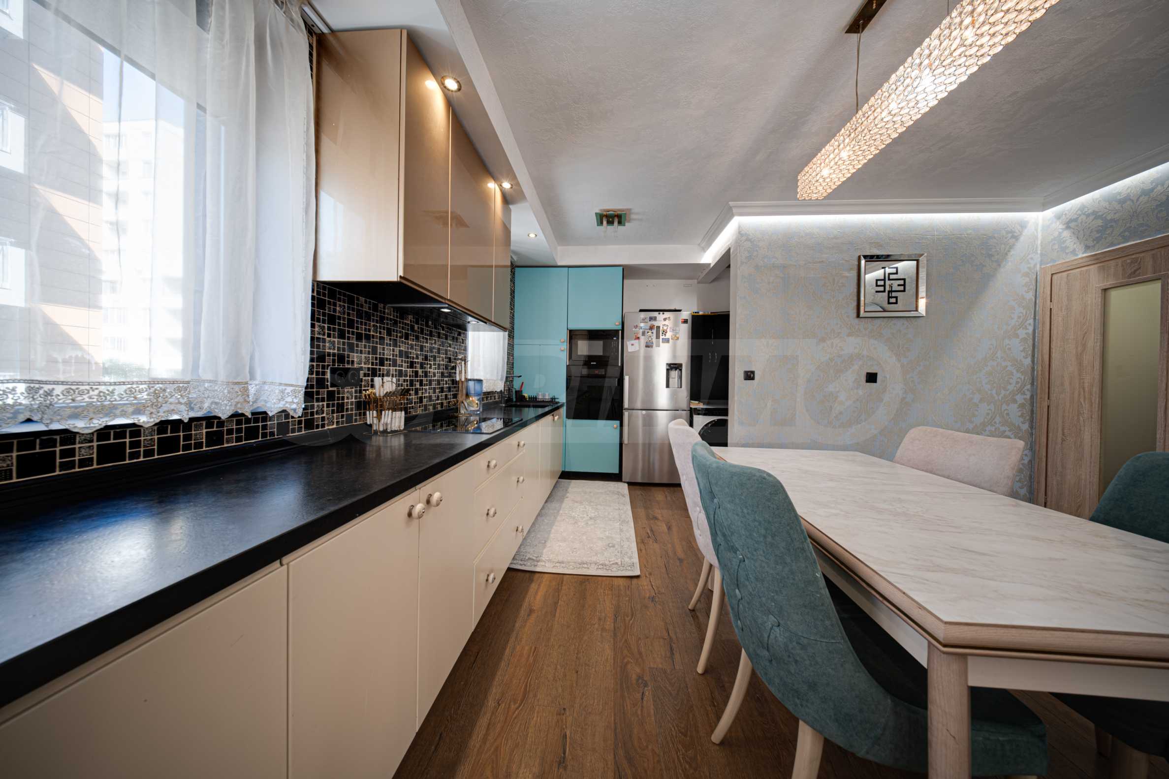 - Просторна дневна с кухненски бокс (над 32 кв.м.), с висок клас уреди и мебели, включително естествен камък на плотовете и первазите;