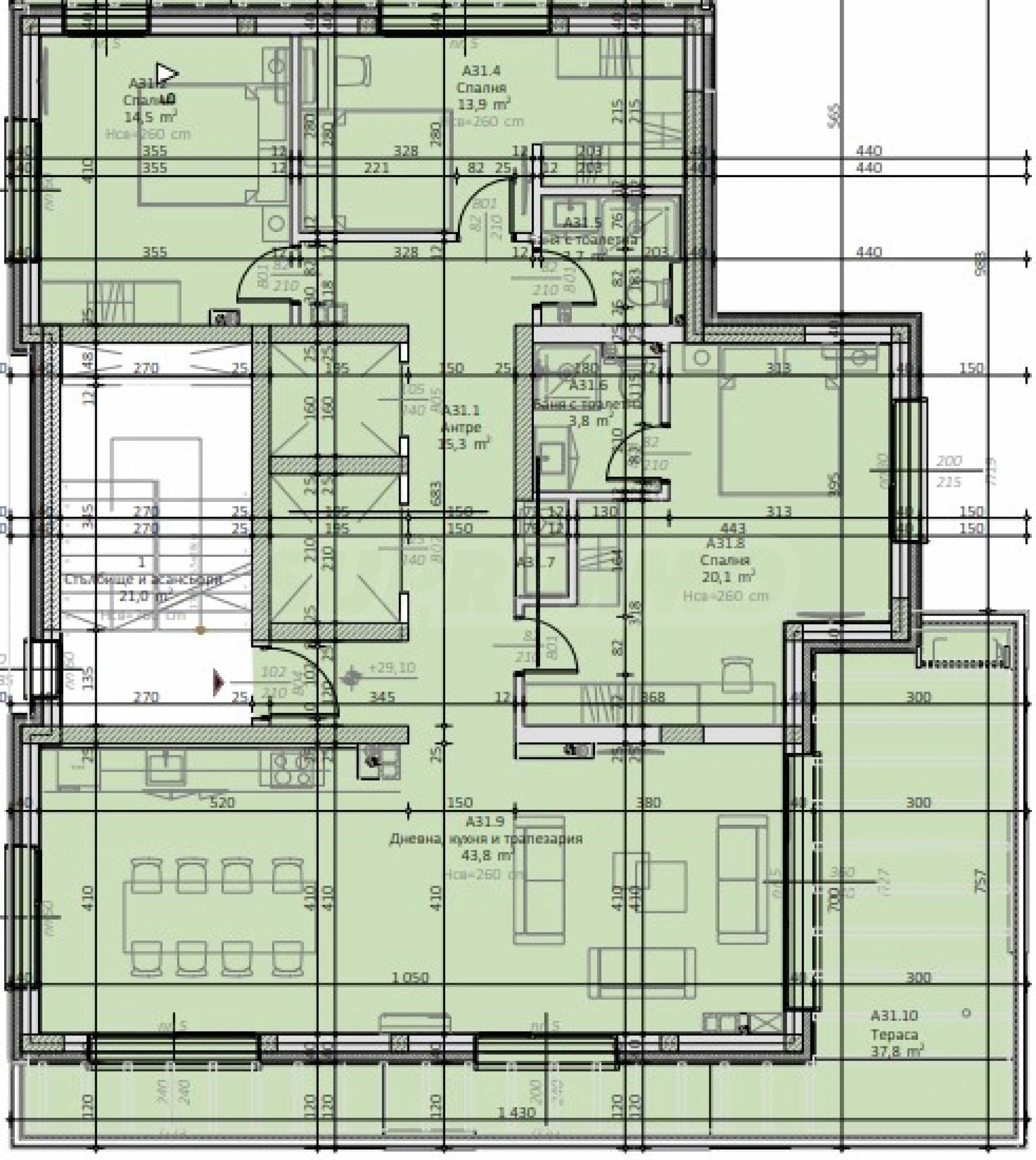 Жилището с обща площ от 219,73 кв.м е разположено на 11-и етаж.