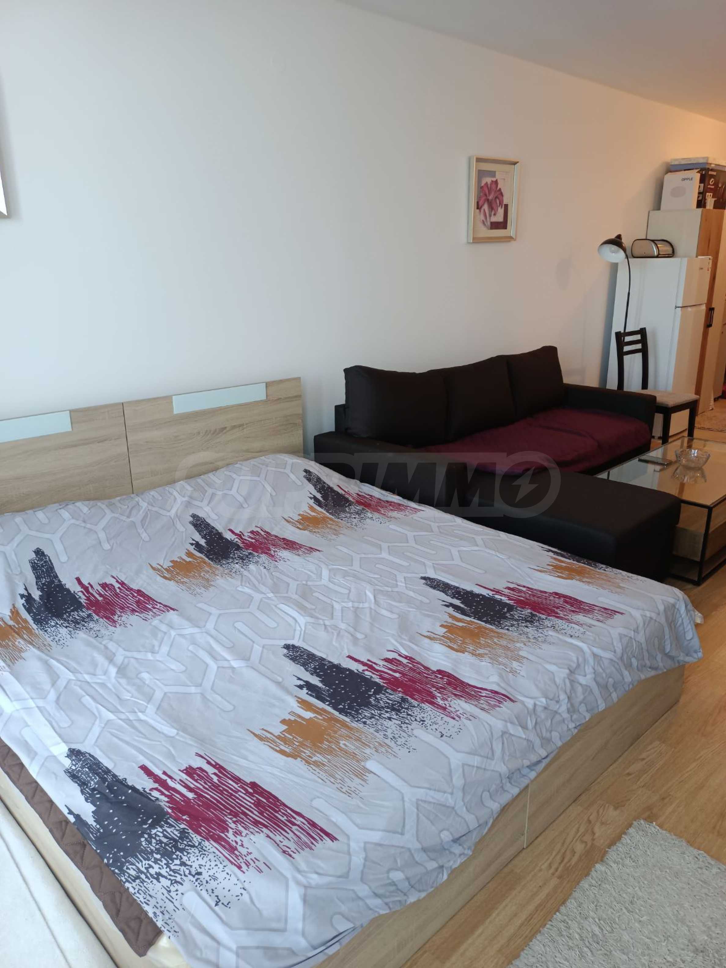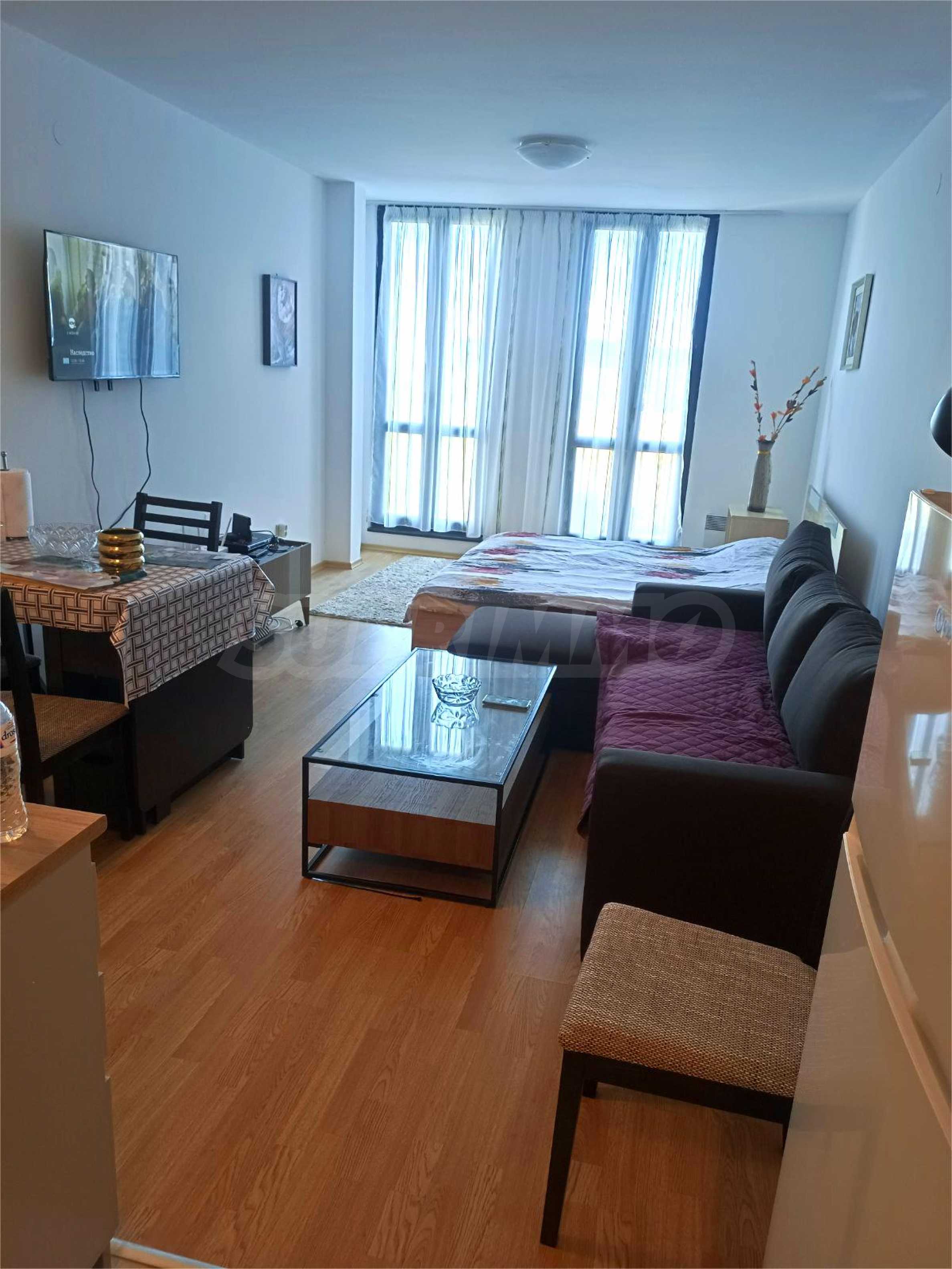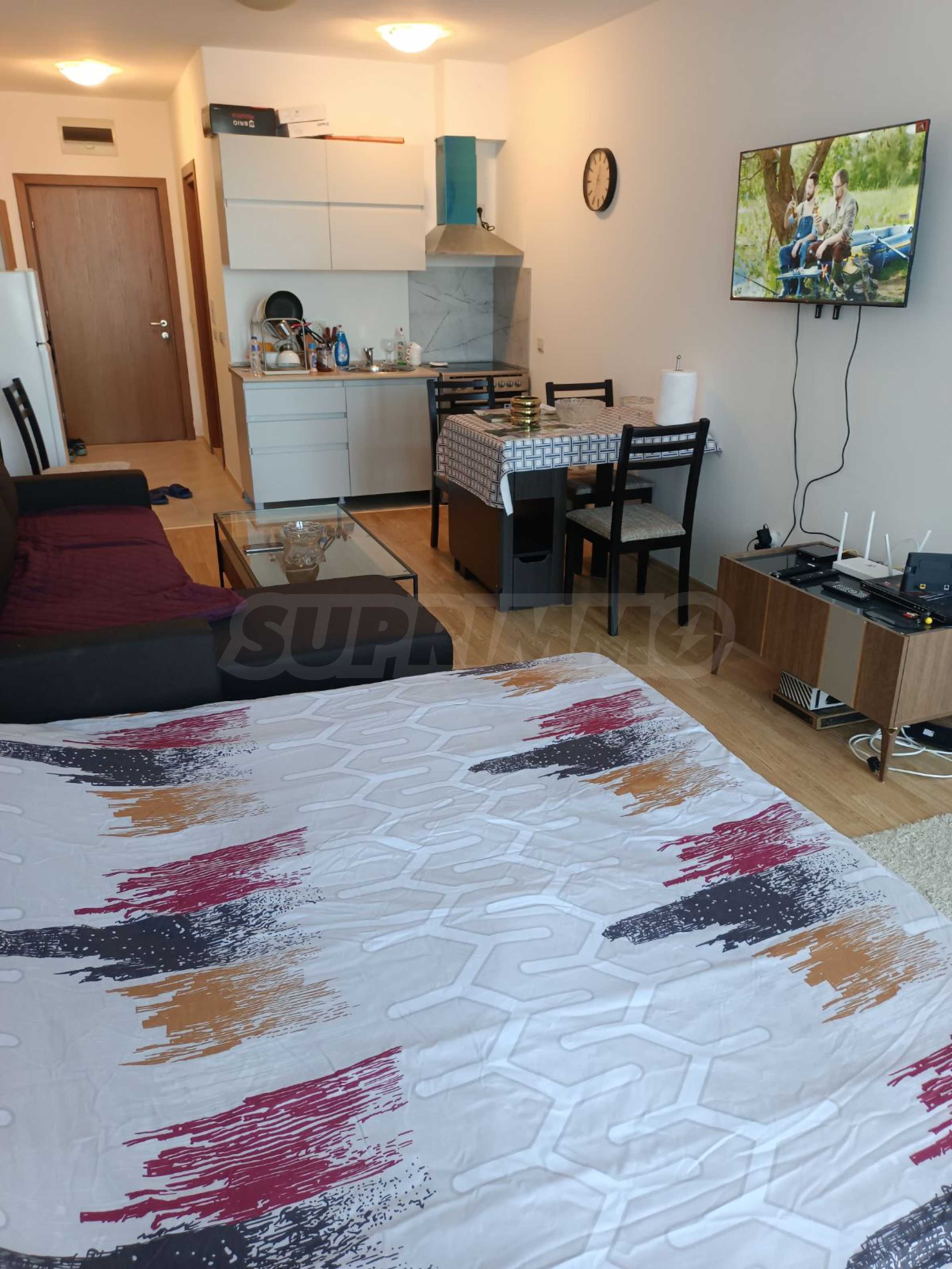 Апартаментът е тип студио и разполага с разтегателен диван, спалня, маса за хранене с два стола, напълно оборудвана кухня, баня с вана и тоалетна.