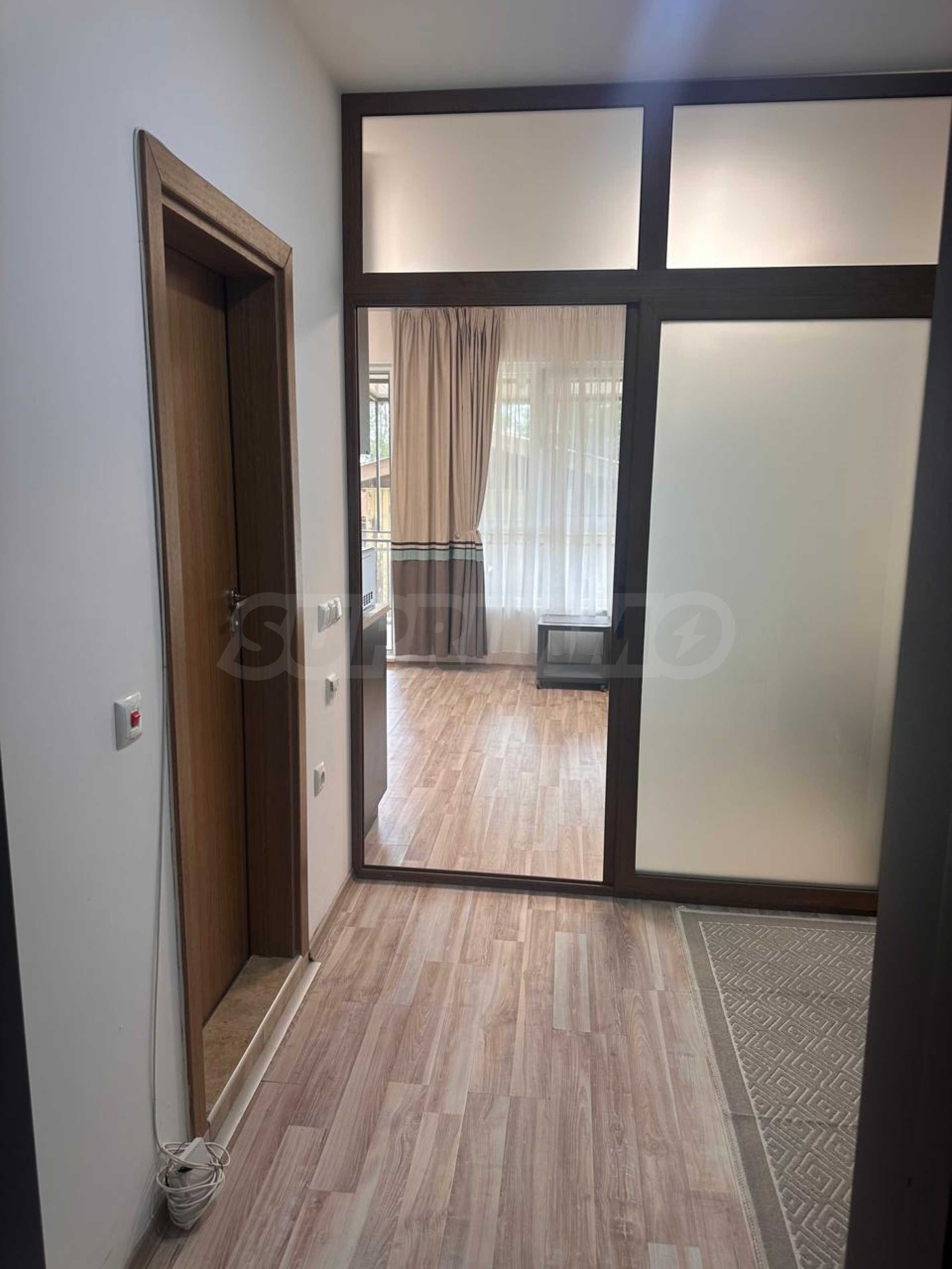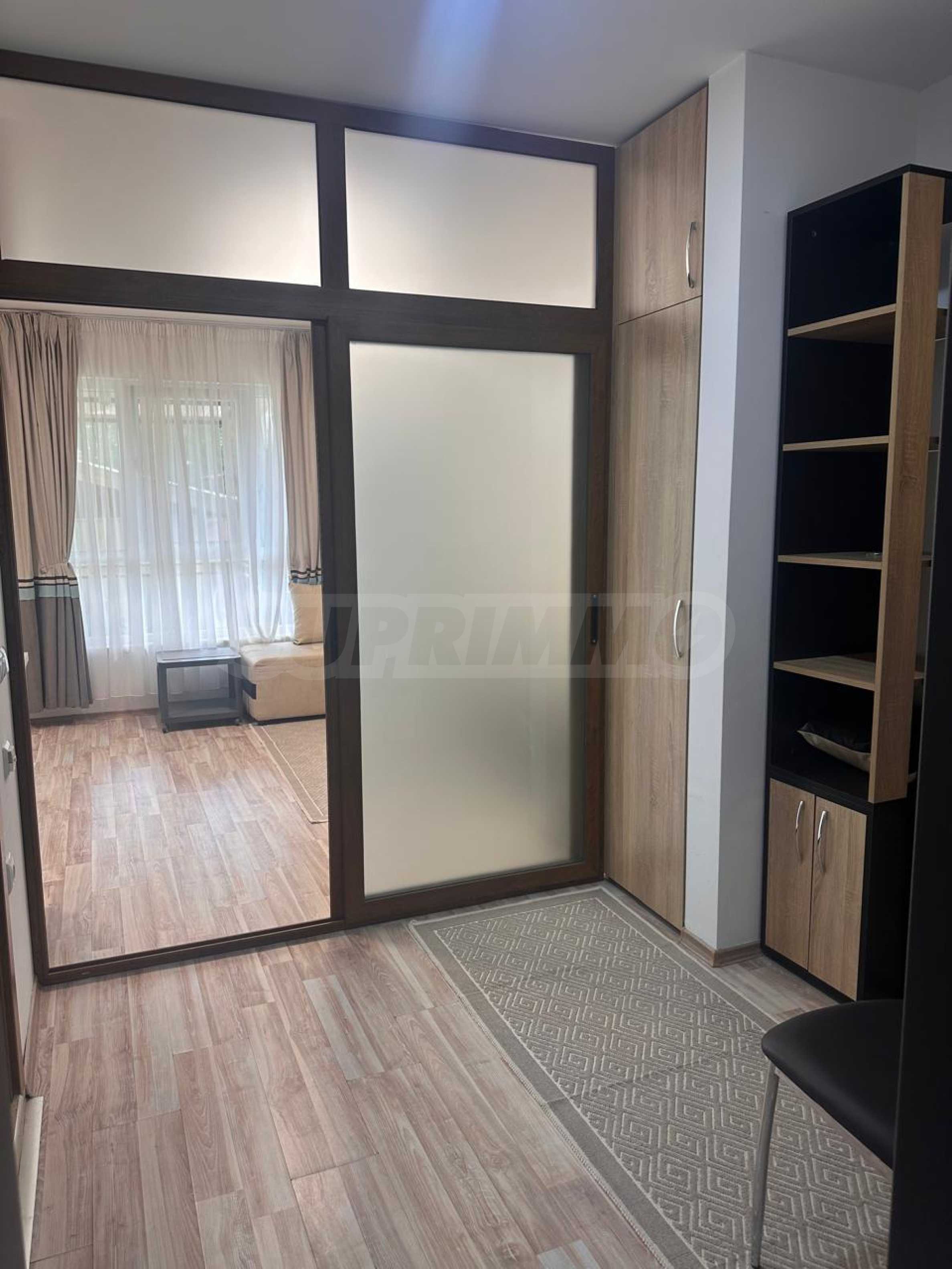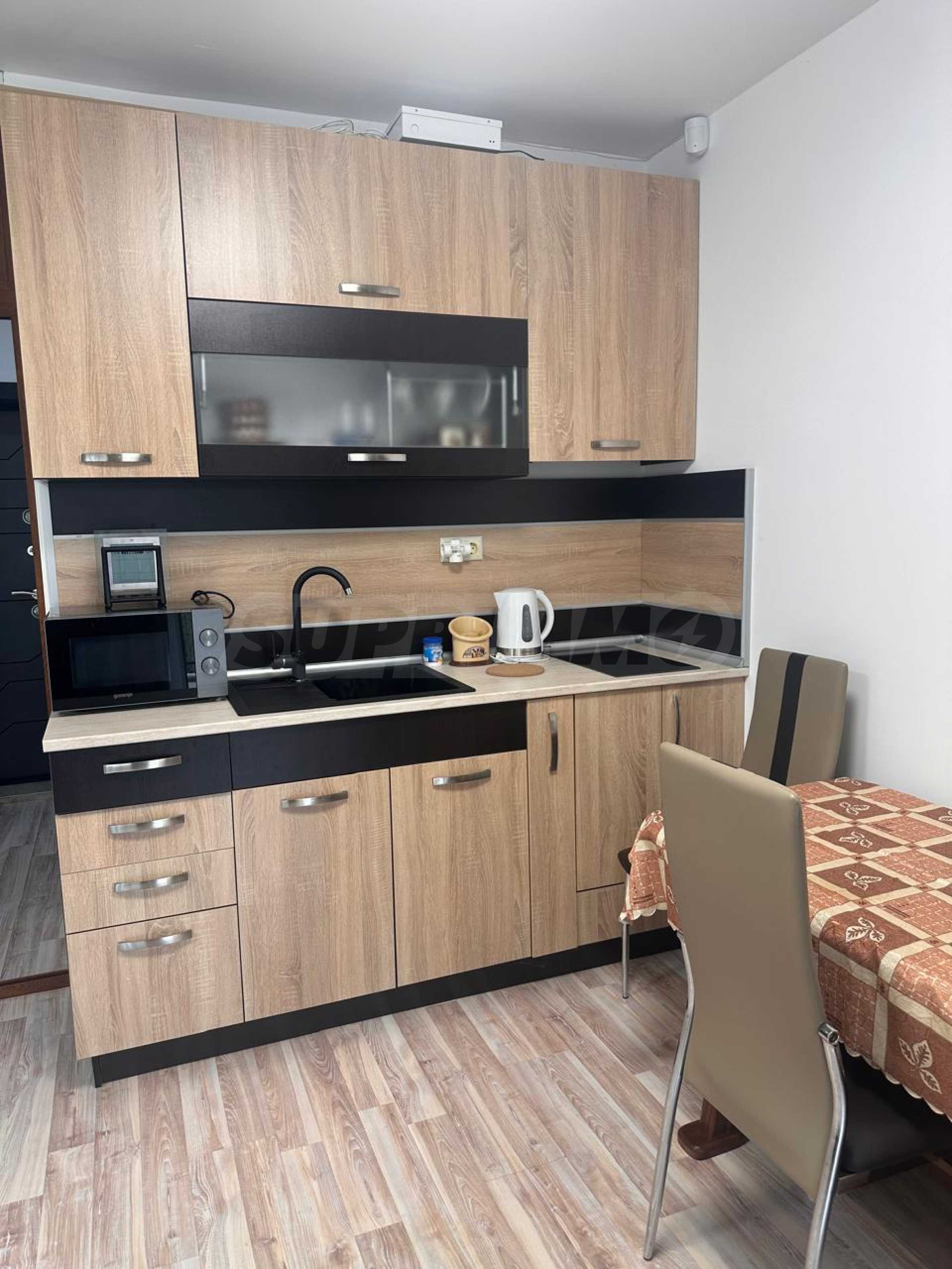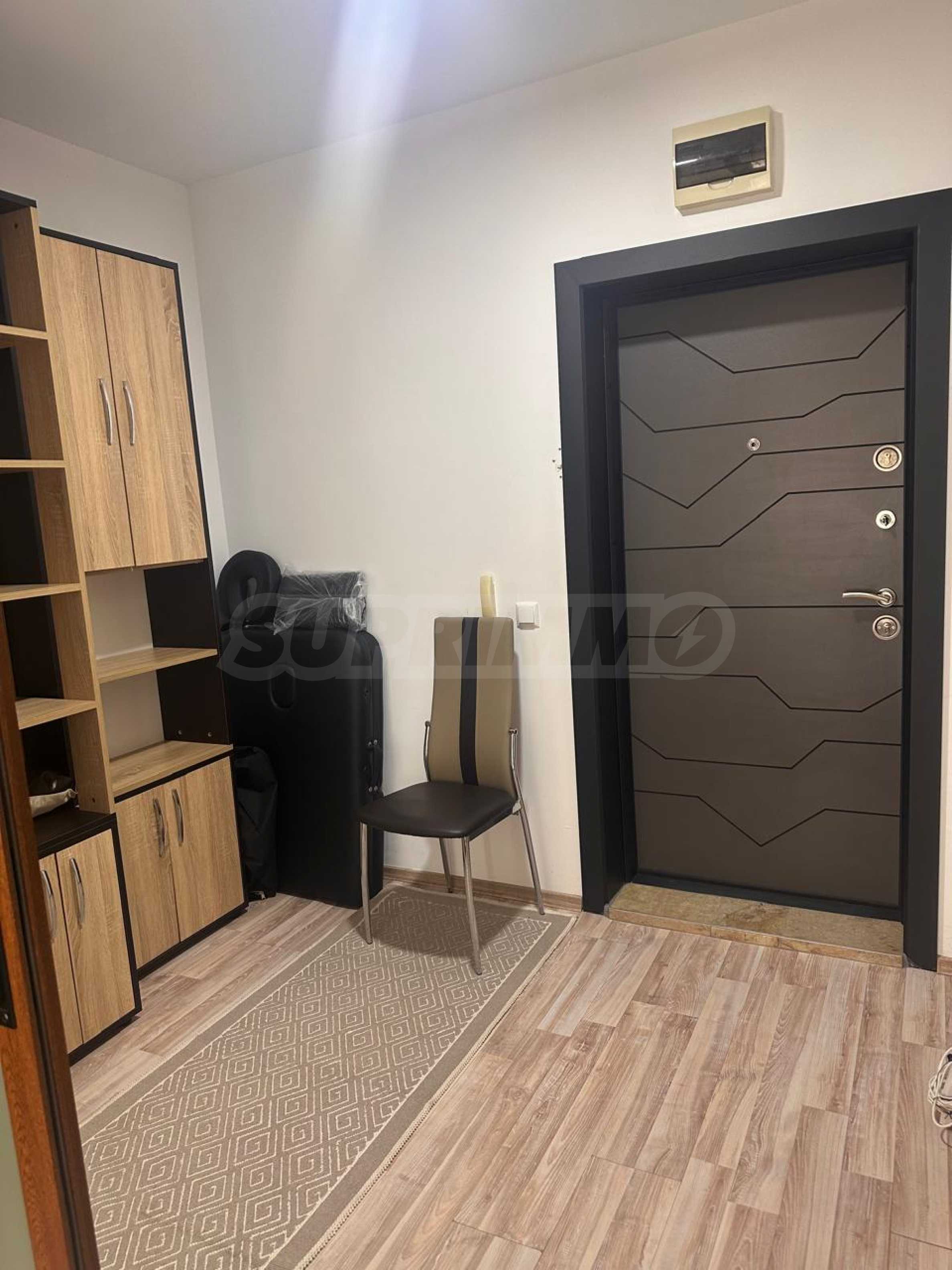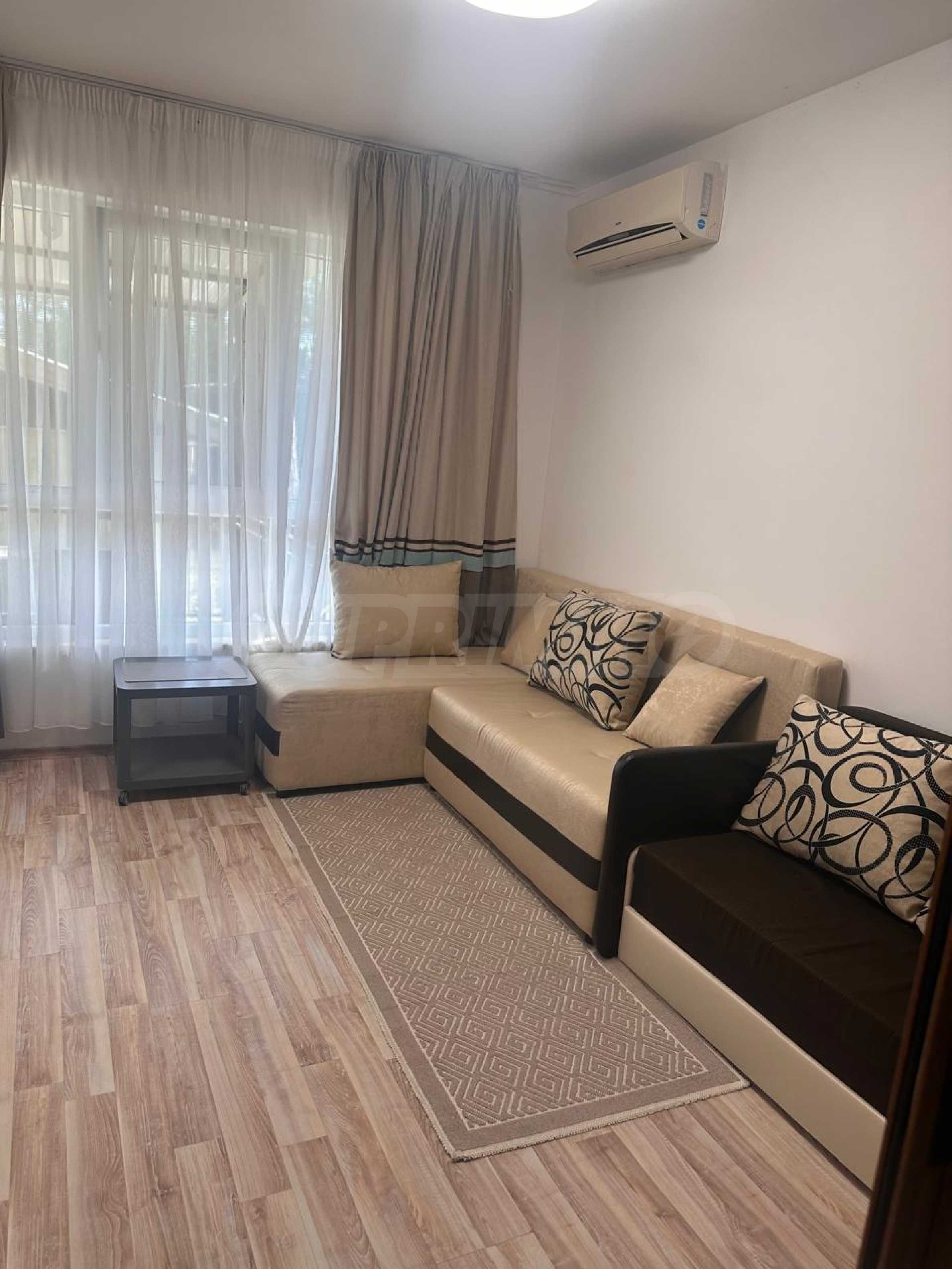Апартаментът е напълно обзаведен и оборудван с всичко необходимо за живеене като мебели и ел. уреди – телевизор, хладилник, климатик и др. Готов е за живеене или отдаване под наем.