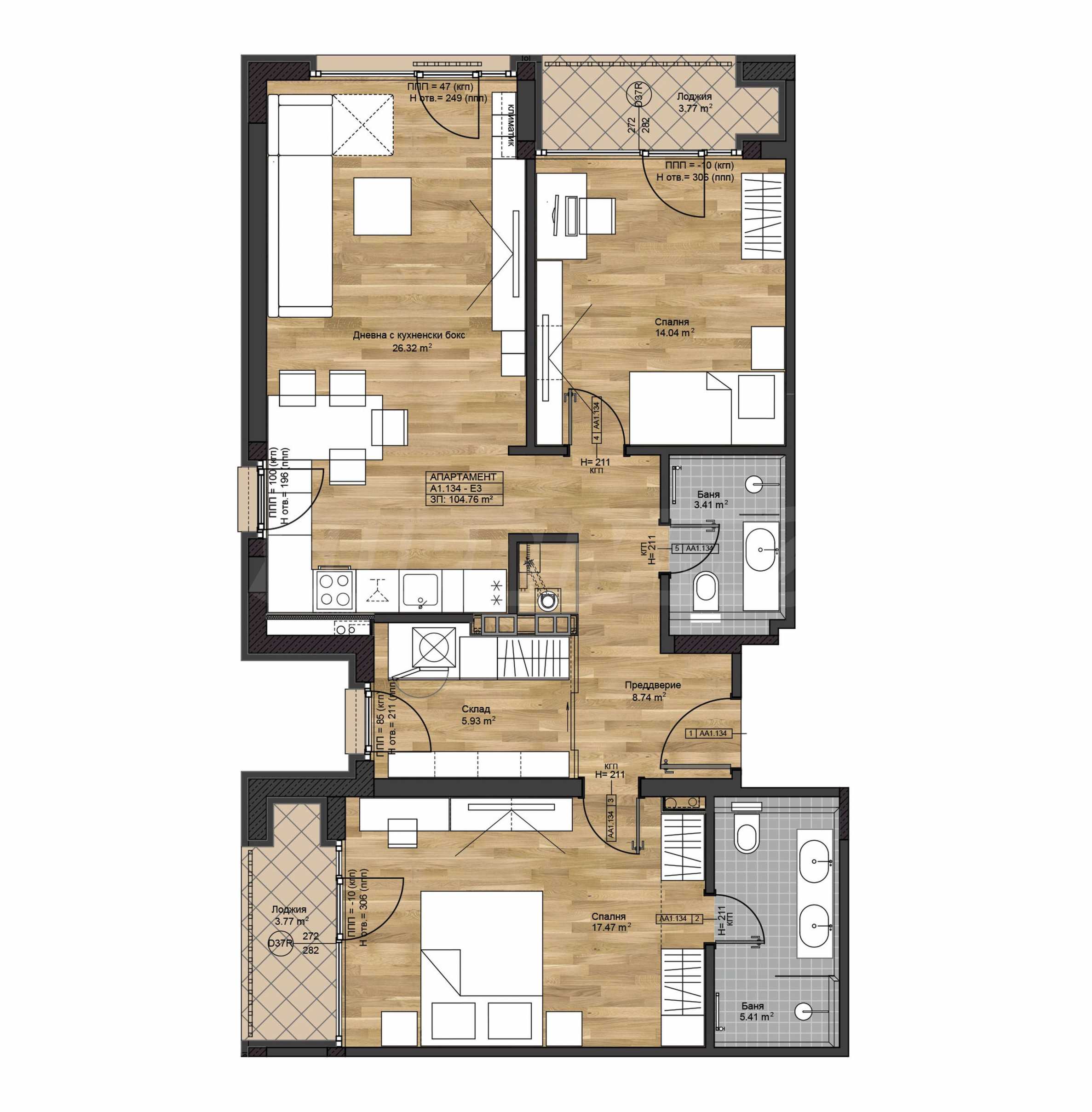 Апартаментът се намира на 4-ти етаж и има обща площ от 135.73 кв.м, 104.76 кв.м - чиста площ. Изложението е юг, югозапад. Разпределението включва входно антре, просторна всекидневна с кухня и трапезария, основна спалня със собствена баня, допълнителна спалня с тераса тип лоджия, баня и складово помещение.