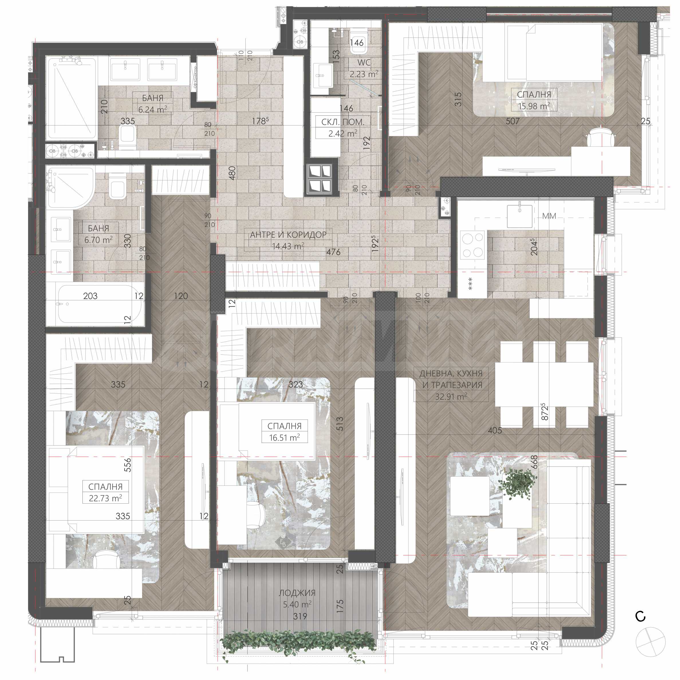 Всеки етаж на Synerga Premium Complex предлага неповторима колекция от 7 различни апартамента, всички с южно изложение и впечатляващи панорамни гледки към Витоша. Разпределенията са проектирани с мисъл за модерния човек – функционални пространства, оптимални площи и естествена светлина във всяко жилище. Тук няма разточителство, но и няма компромиси – всяко жилище е замислено да носи простор и удобство.