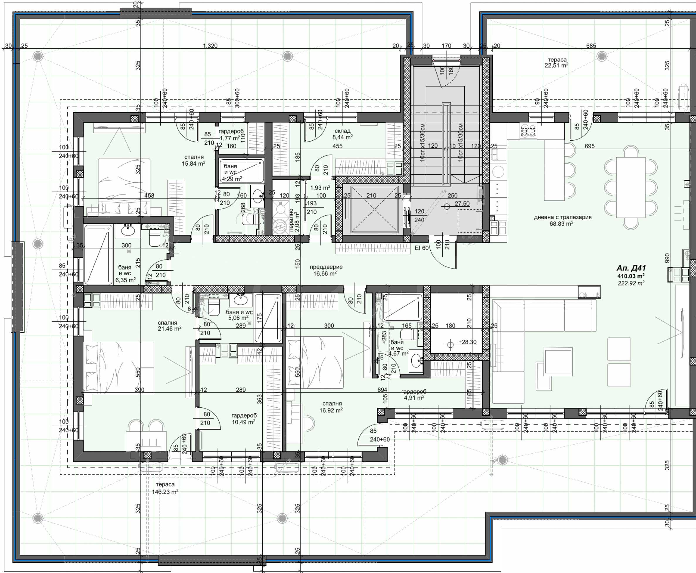 Жилището с обща площ от 450,72 кв.м е разположен на 10-и етаж от 10.