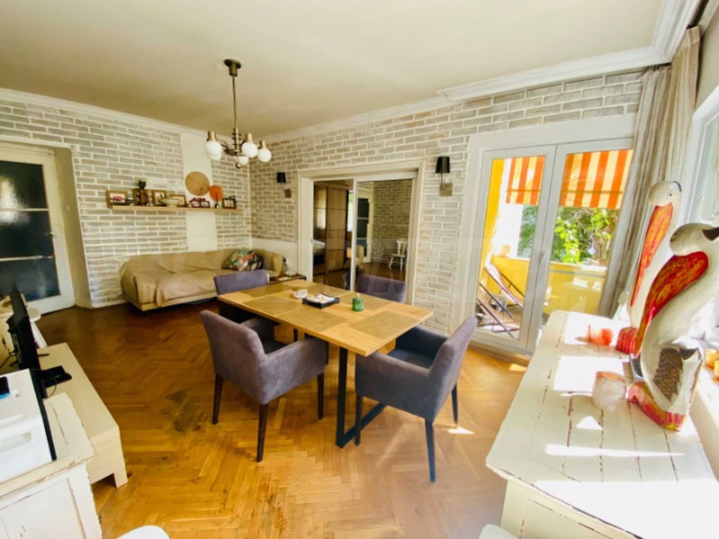 Апартаментът е разположен на втори етаж в добре поддържана сграда и впечатлява с усещане за простор, светлина и домашен уют. Жилището се предлага напълно обзаведено с всичко необходимо за комфортен и спокоен живот – елегантна дневна зона с мека мебел, функционална кухня, оборудвана с висок клас електроуреди, две удобни спални и модерна баня. В дневната и спалните настилките са от естествен паркет, а в кухнята и санитарните помещения е положен гранитогрес, осигуряващ стил и практичност.