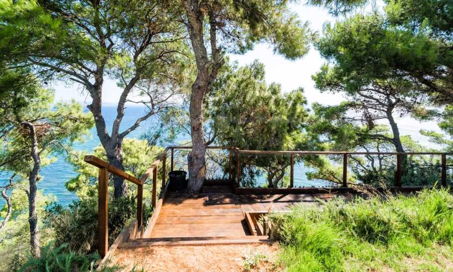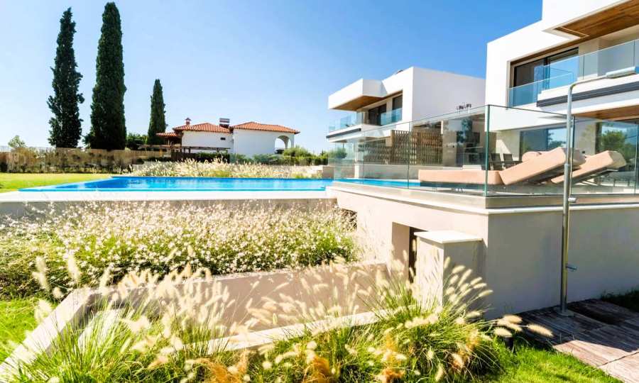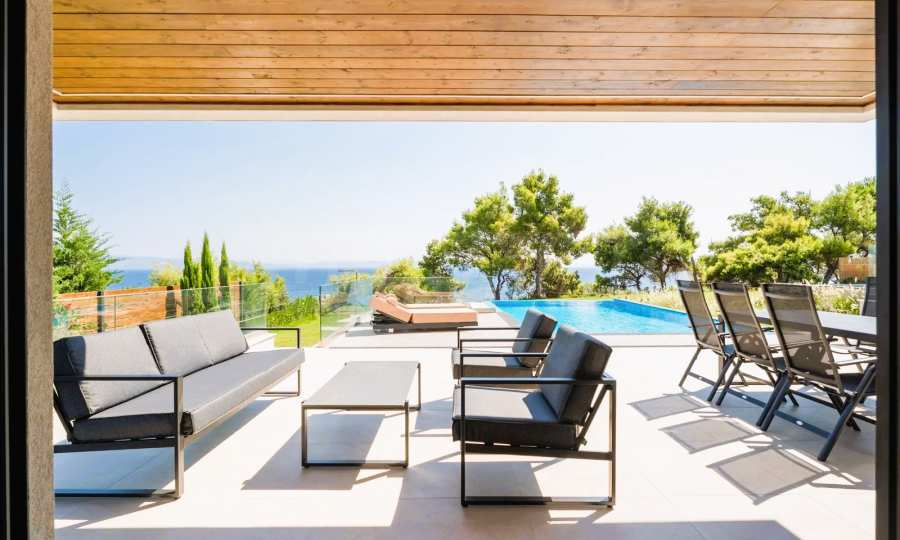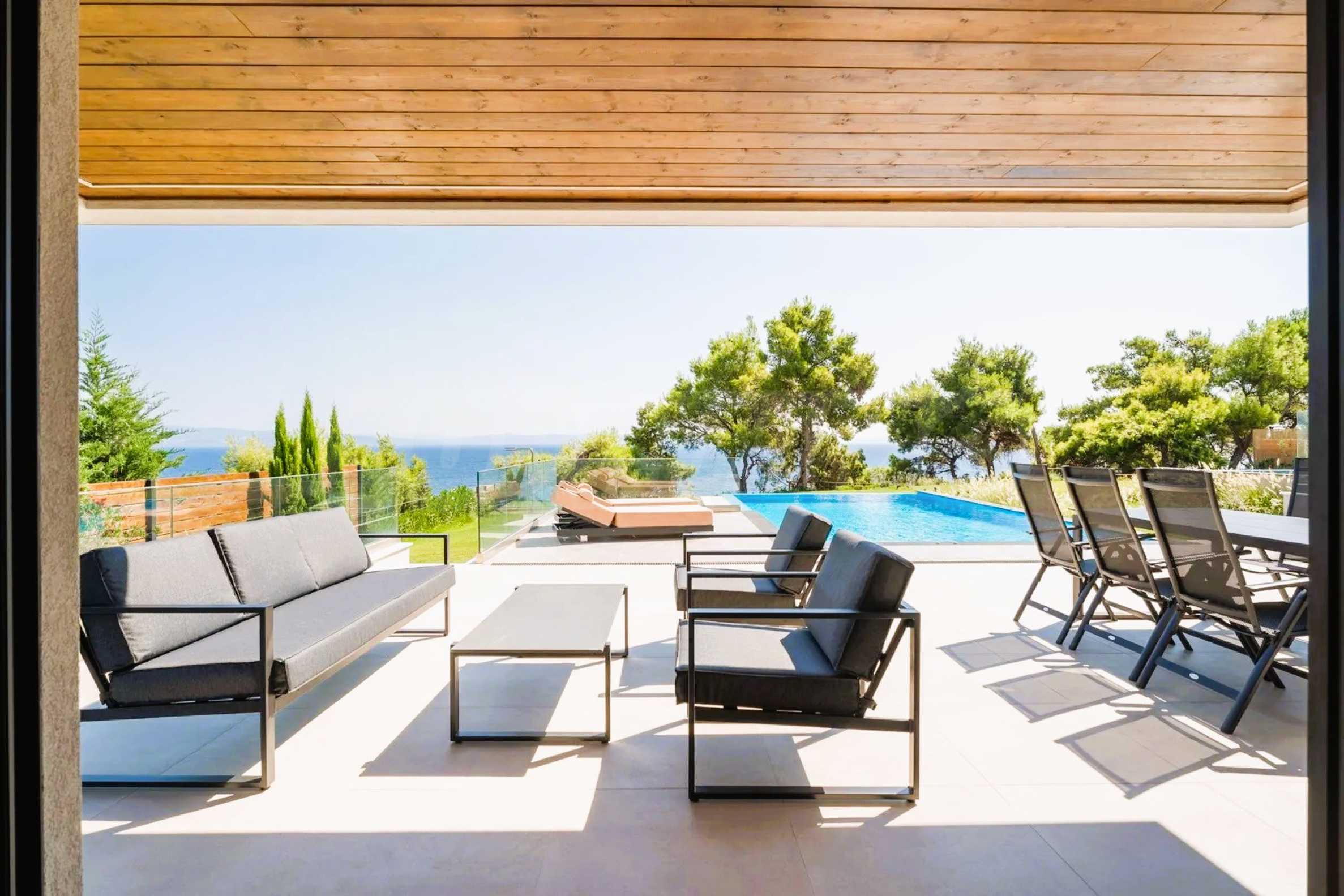 АКЦЕНТИ: Частен басейн с обширна зона за слънчеви бани, откъдето се разкрива спираща дъха гледка към сините води на Егейско море.