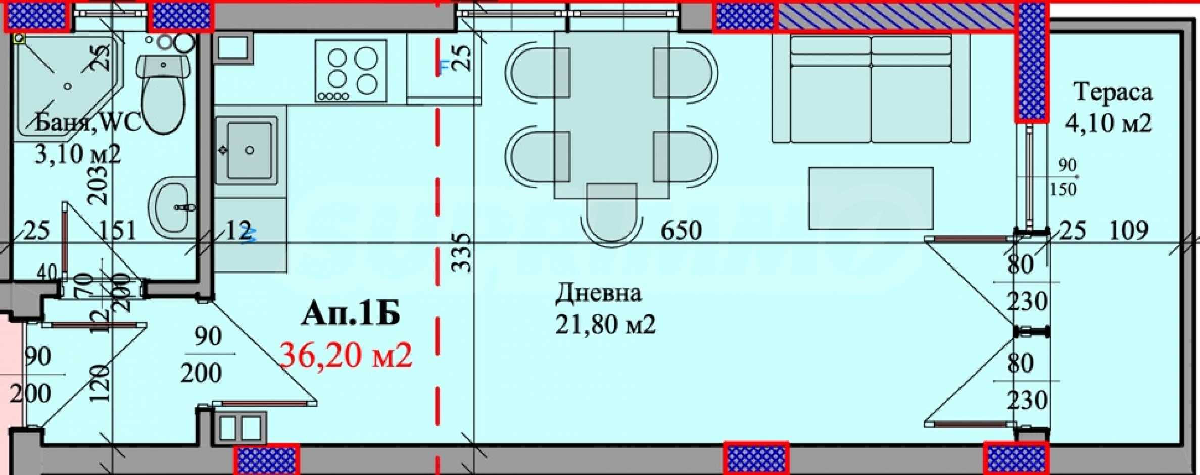• Разпределението включва комфортна всекидневна с кухня и трапезария, баня с тоалетна и тераса.