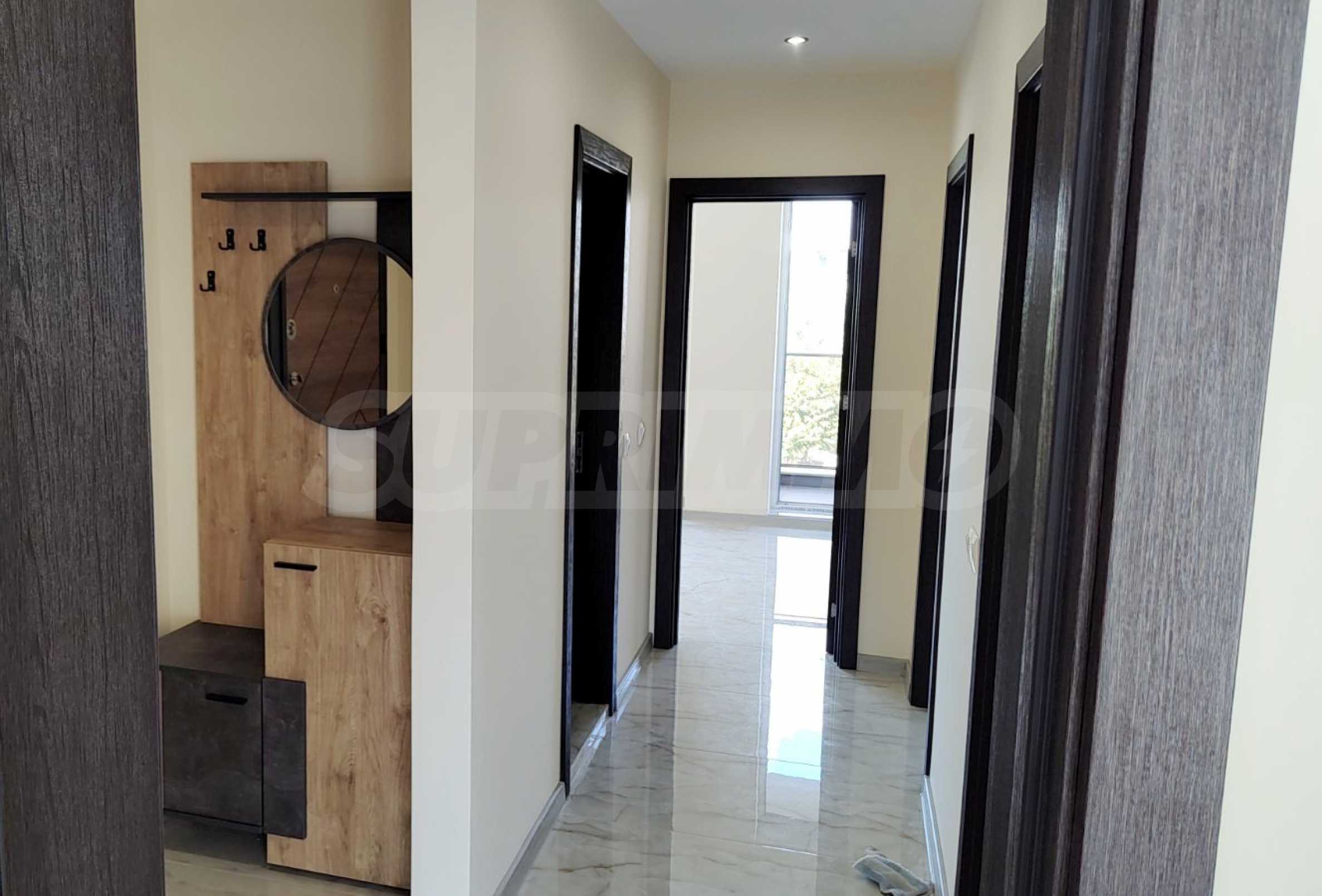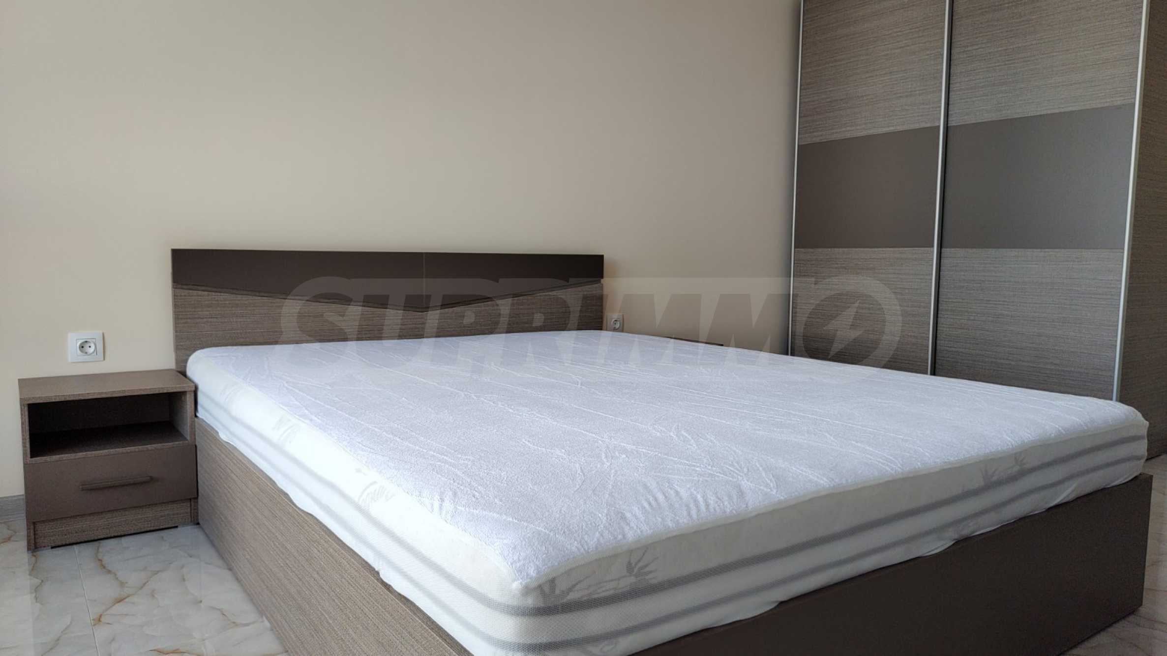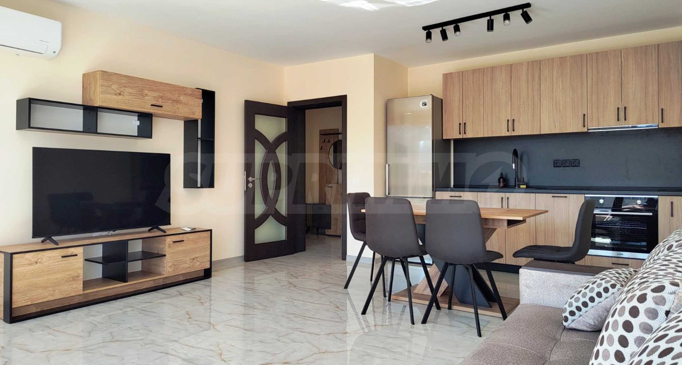 Апартаментът е напълно обзаведен и оборудван с всичко необходимо, с мебели и електроуреди в гаранция и с висок енергиен клас, включително и съдомиялна. Разполага със smart TV, както и оптичен интернет. Отоплението и охлаждането са решени с инверторни климатици във всяка стая.