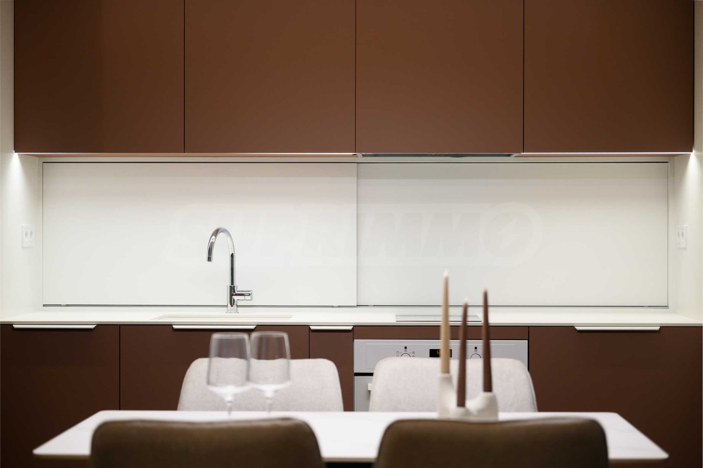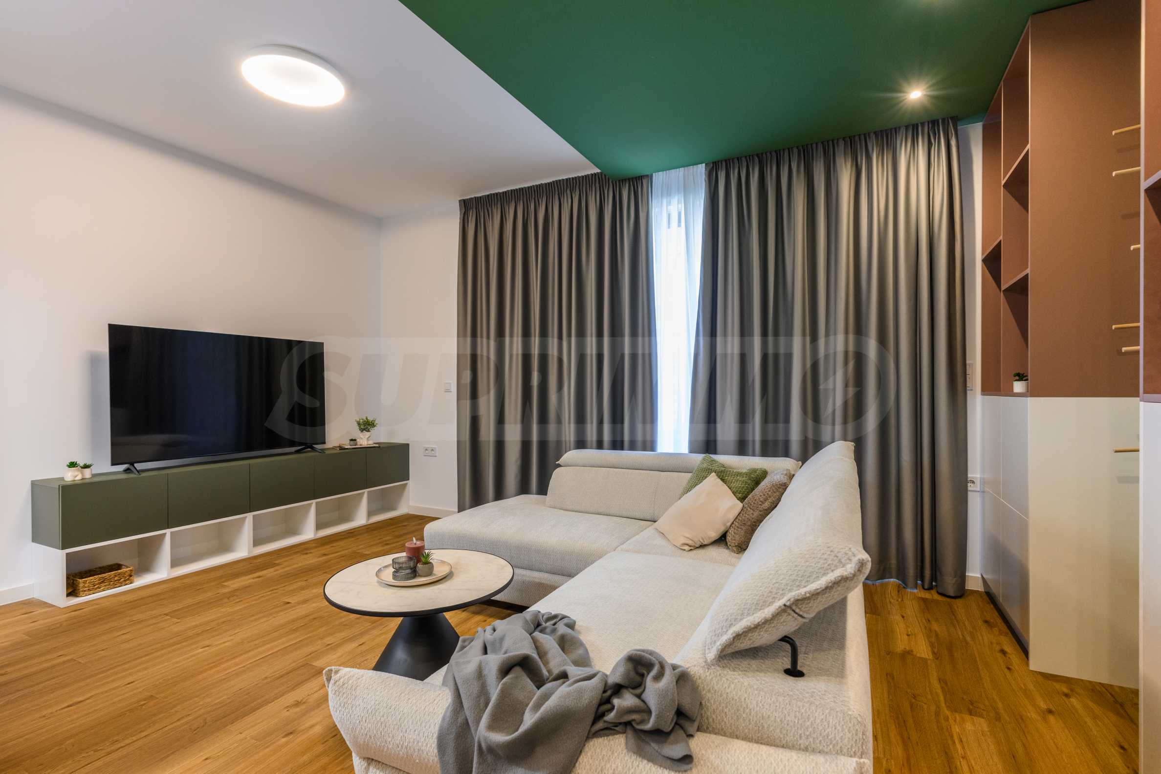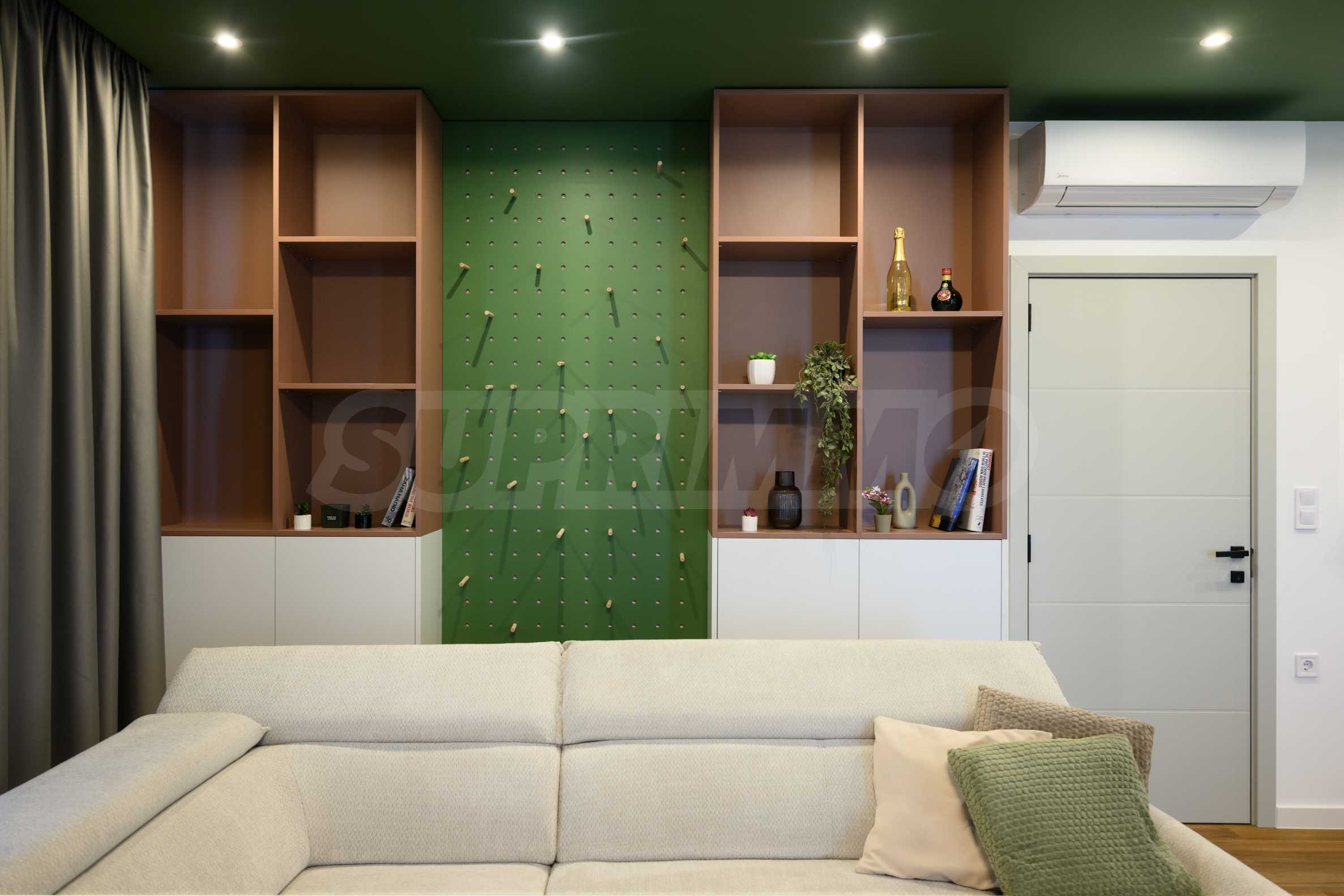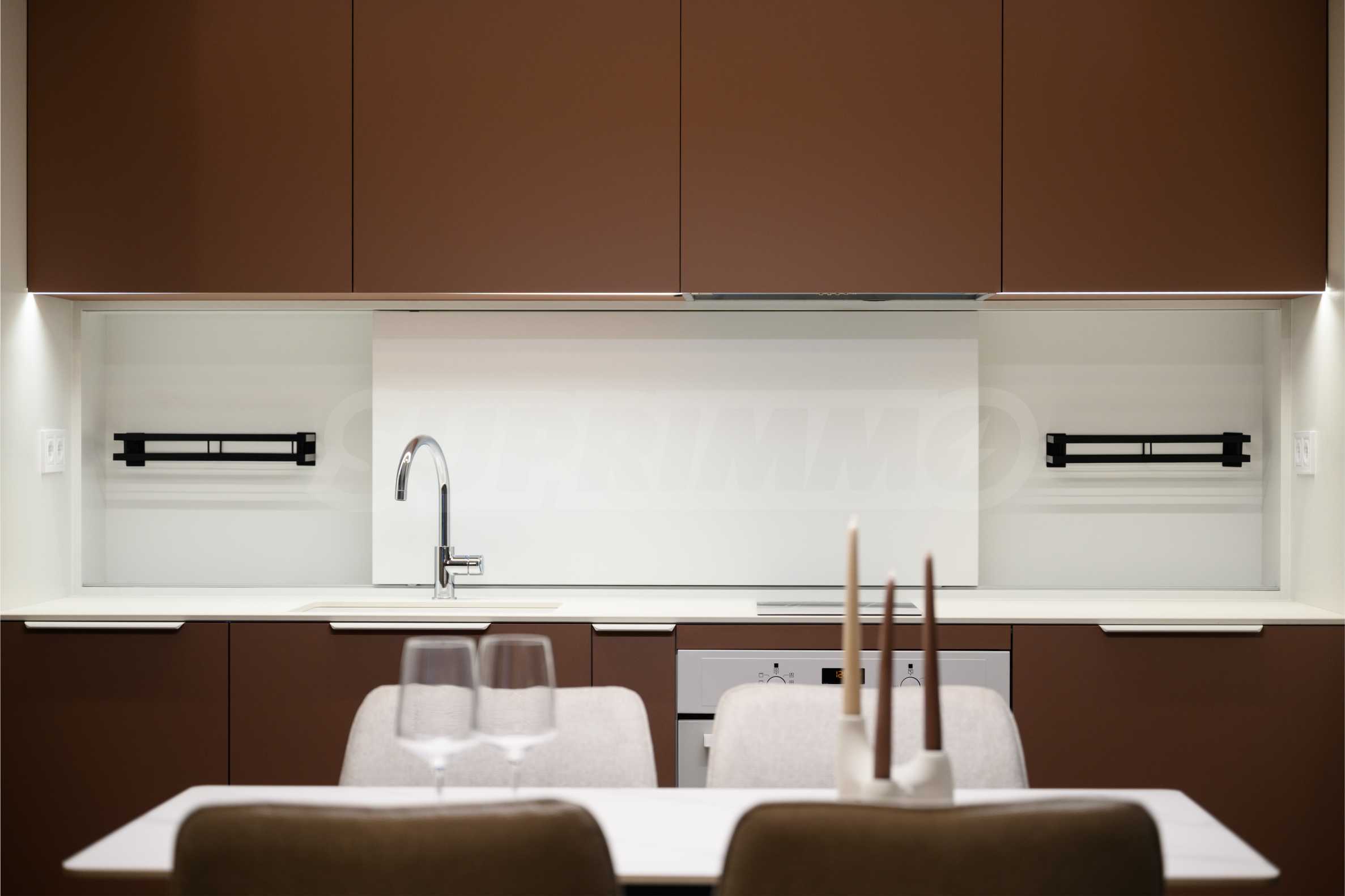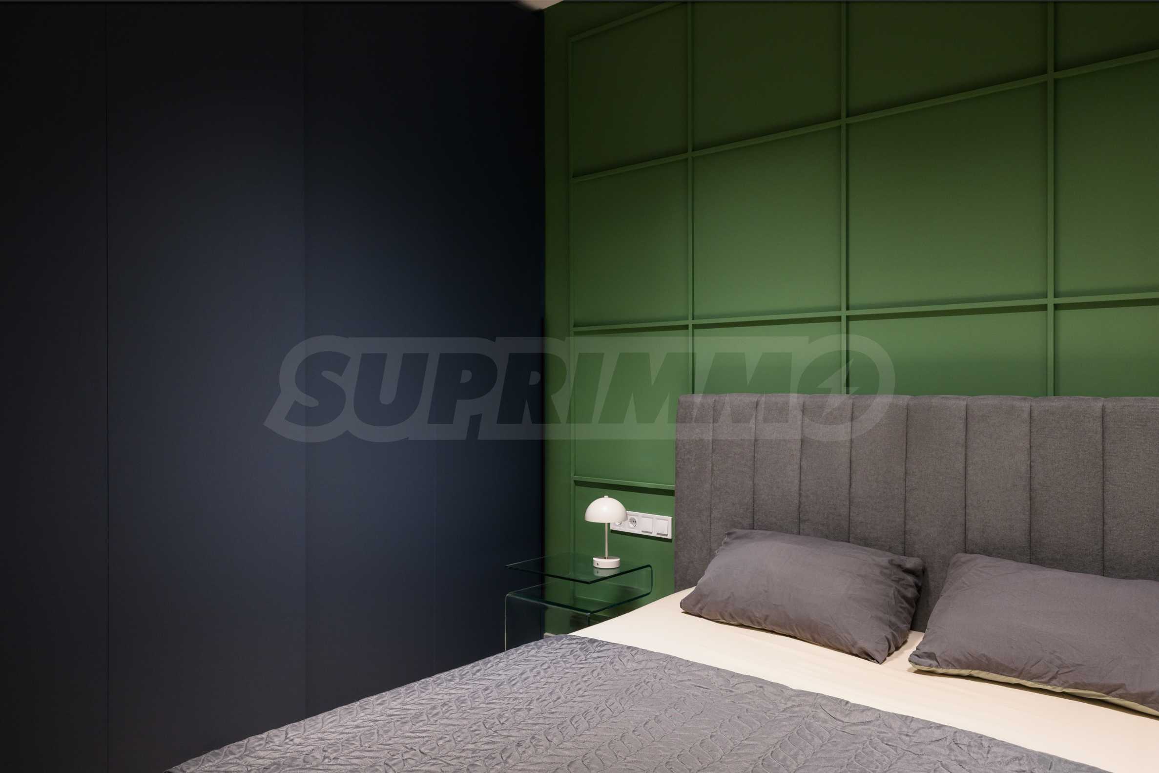 Апартаментът е оборудван с всичко необходимо за пълноценен ежедневен живот и е готов за нанасяне веднага. Впечатлява с изчистен и модерен интериор, изискан и смел в цветовите си решения, с балансирано осветление и приятни текстури, които придават усещане за уют и завършеност, изпълнен с внимание към всеки детайл. Подбраните материали и мебелите по индивидуален проект създават атмосфера на функционален лукс и спокойна елегантност.