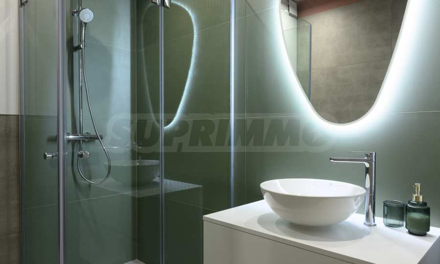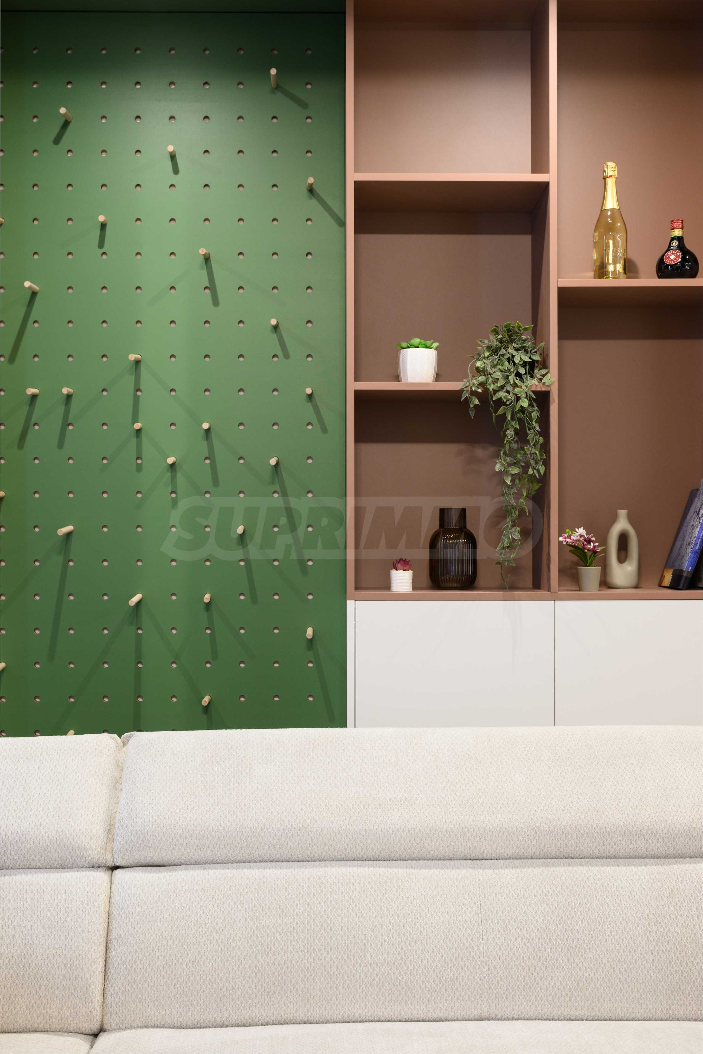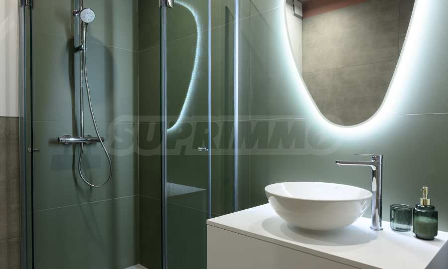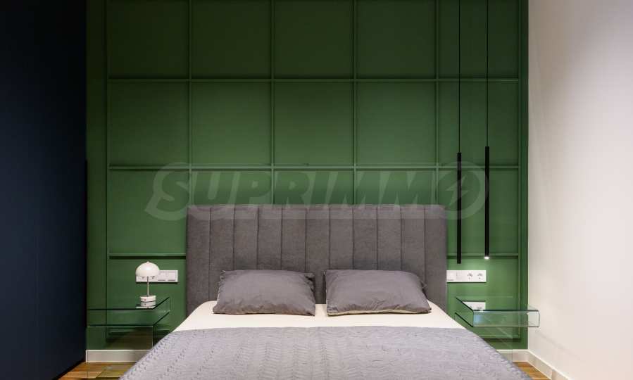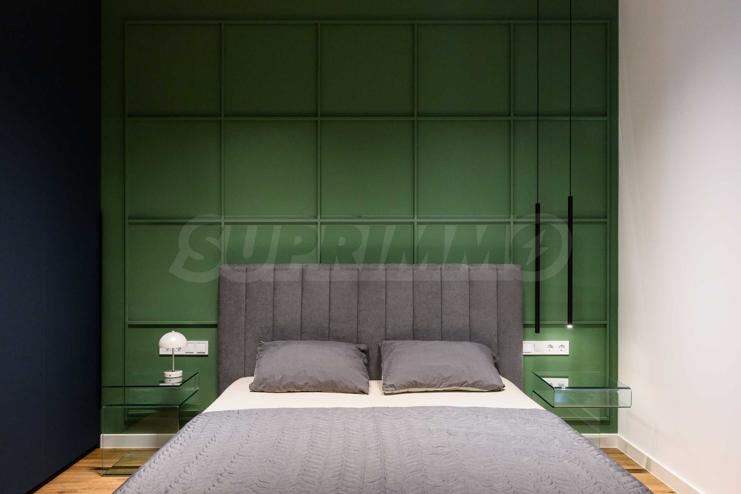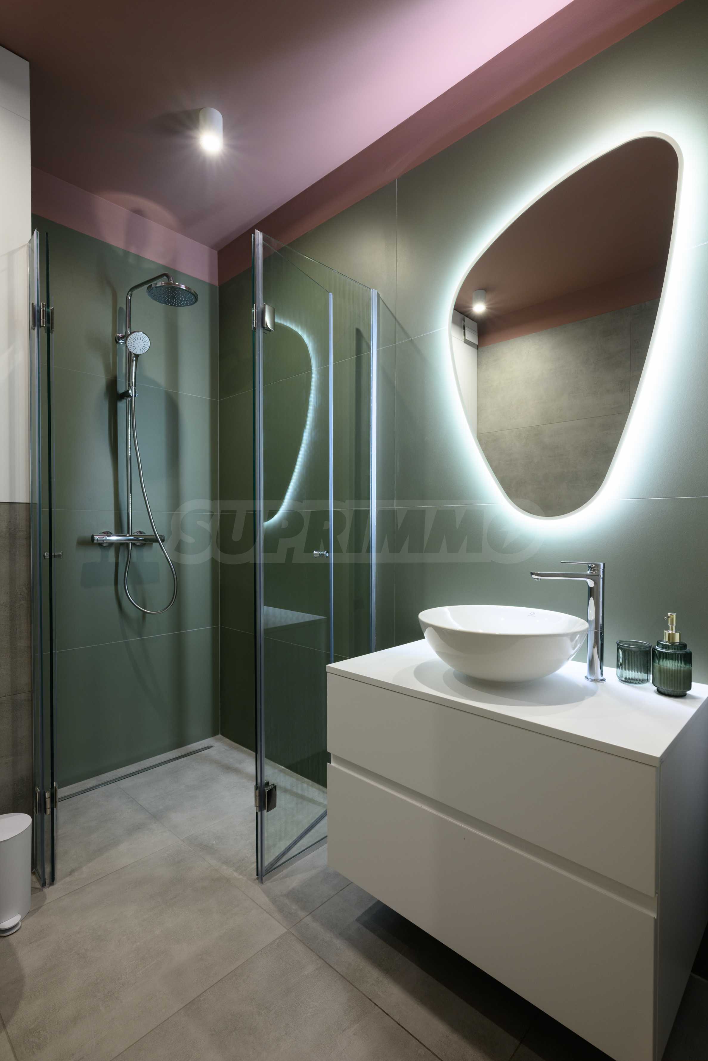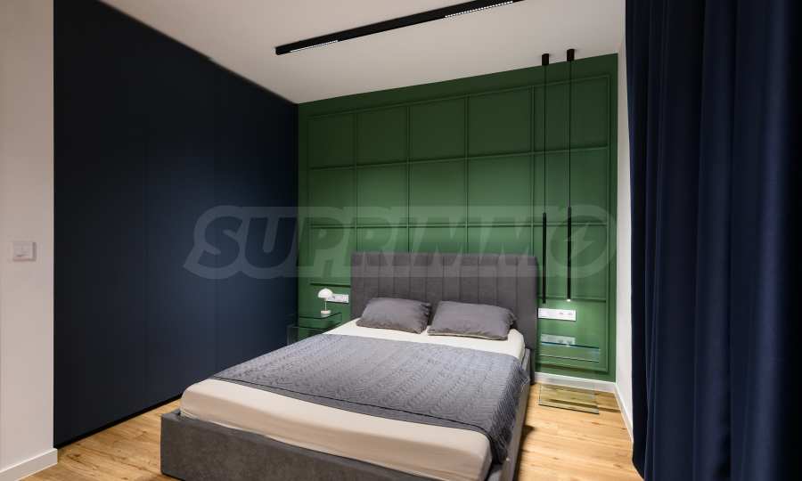 Апартаментът е оборудван с всичко необходимо за пълноценен ежедневен живот и е готов за нанасяне веднага. Впечатлява с изчистен и модерен интериор, изискан и смел в цветовите си решения, с балансирано осветление и приятни текстури, които придават усещане за уют и завършеност, изпълнен с внимание към всеки детайл. Подбраните материали и мебелите по индивидуален проект създават атмосфера на функционален лукс и спокойна елегантност.