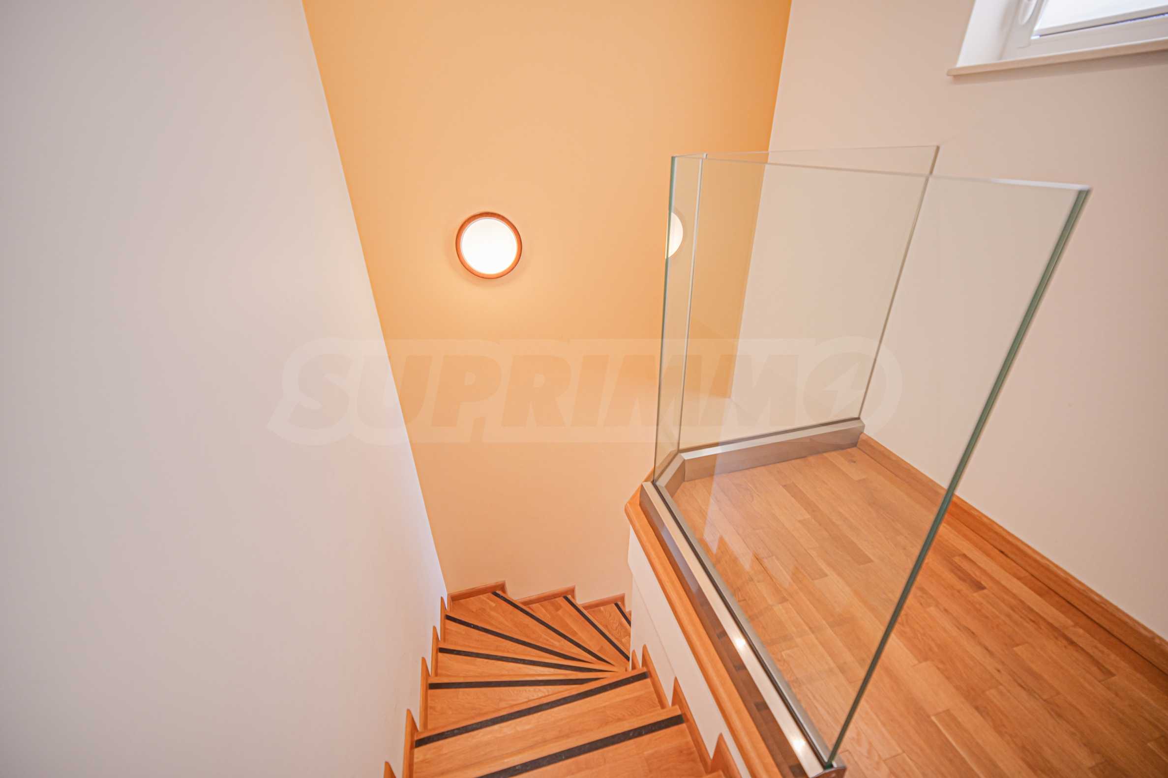 • първо ниво предлага просторен и светъл хол с кухня от отворен тип с кухненски остров, множество прозорци и достъп до просторна ъглова тераса, от която се разкриват нескриваеми гледки към Витоша, както и 2 спални с 2 бани с тоалетна (една за гости, втората в главната спалня);