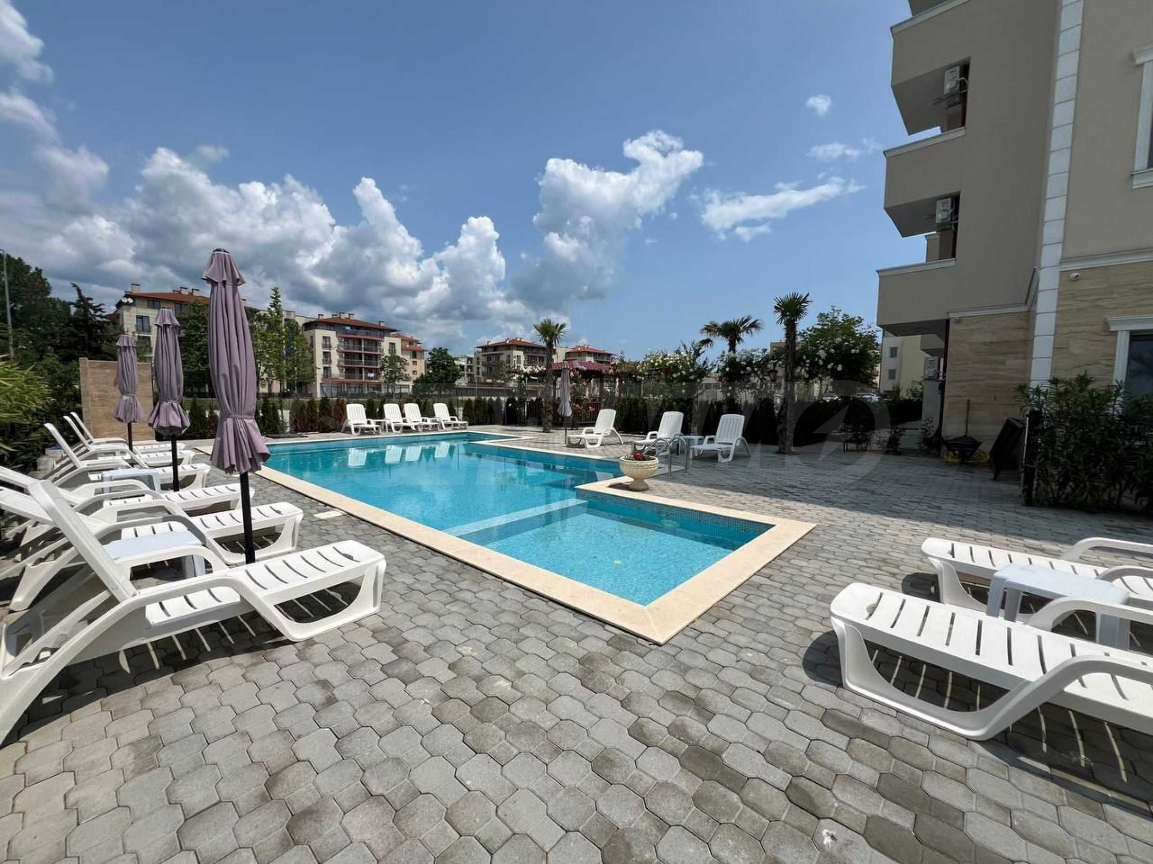 Имотът с площ от 41 кв.м е разположен на 5-и етаж от 5. Състои се от дневна, баня/тоалетна и тераса с гледка към басейна.
