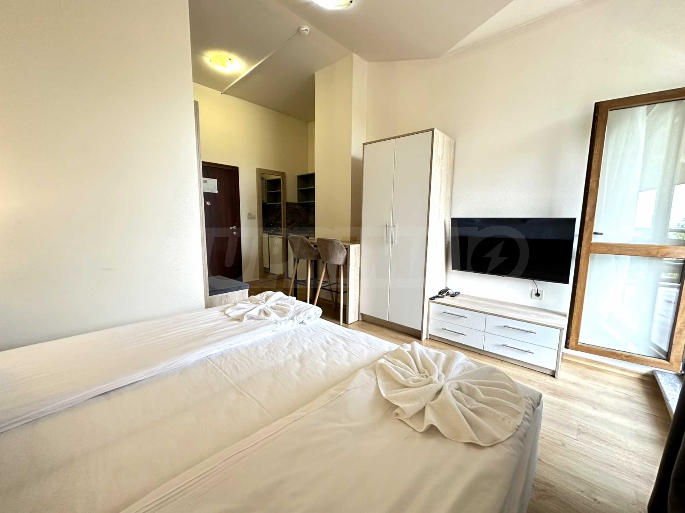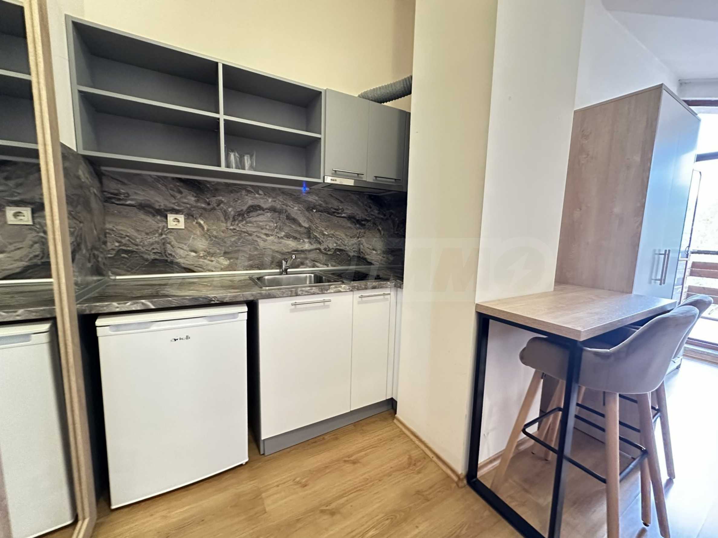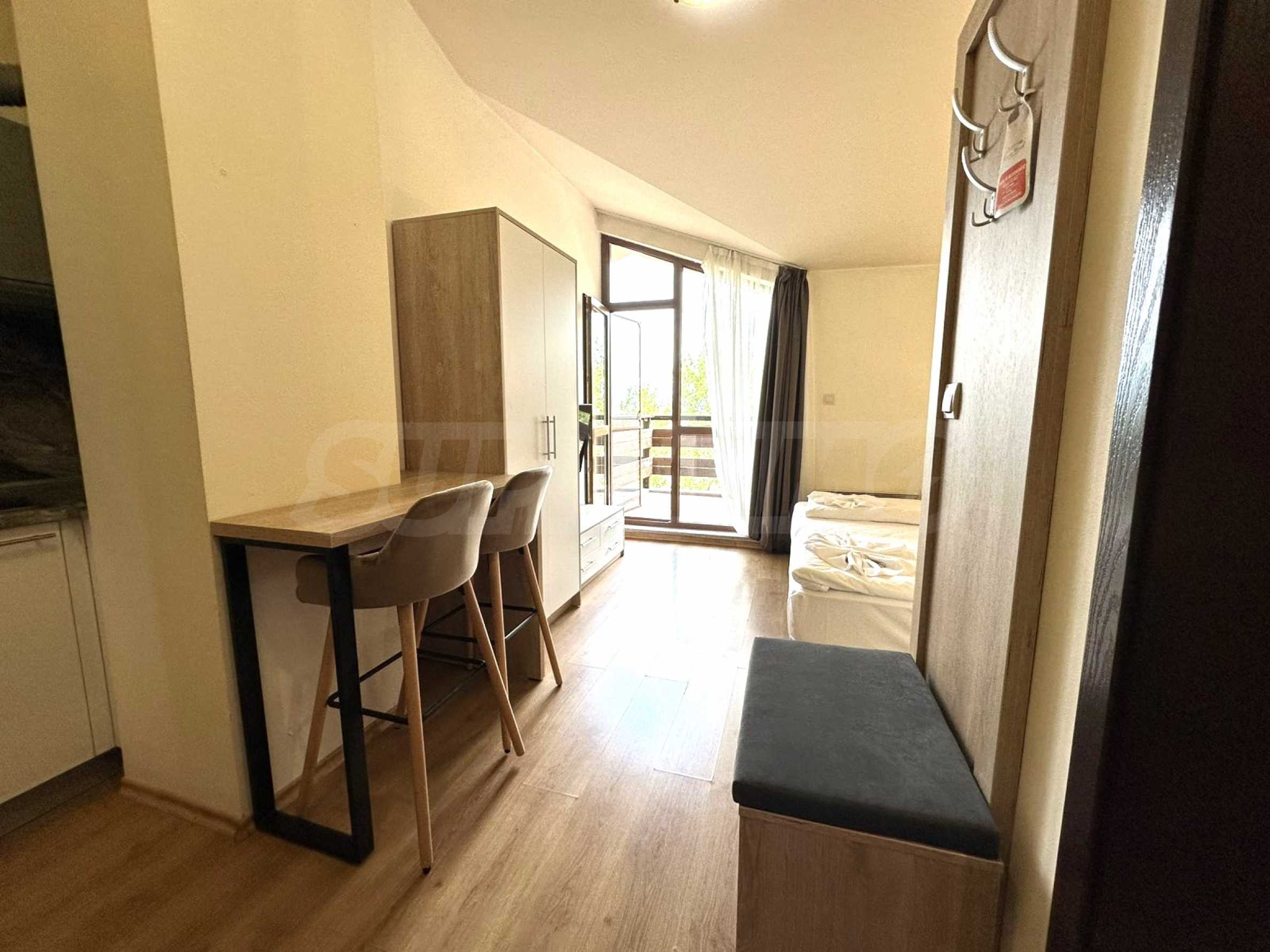 Апартаментът е тип студио и разполага със спалня, гардероб, барплот, напълно оборудвана кухня с 2 котлони, хладилник, тераса, баня с душ кабина и тоалетна.