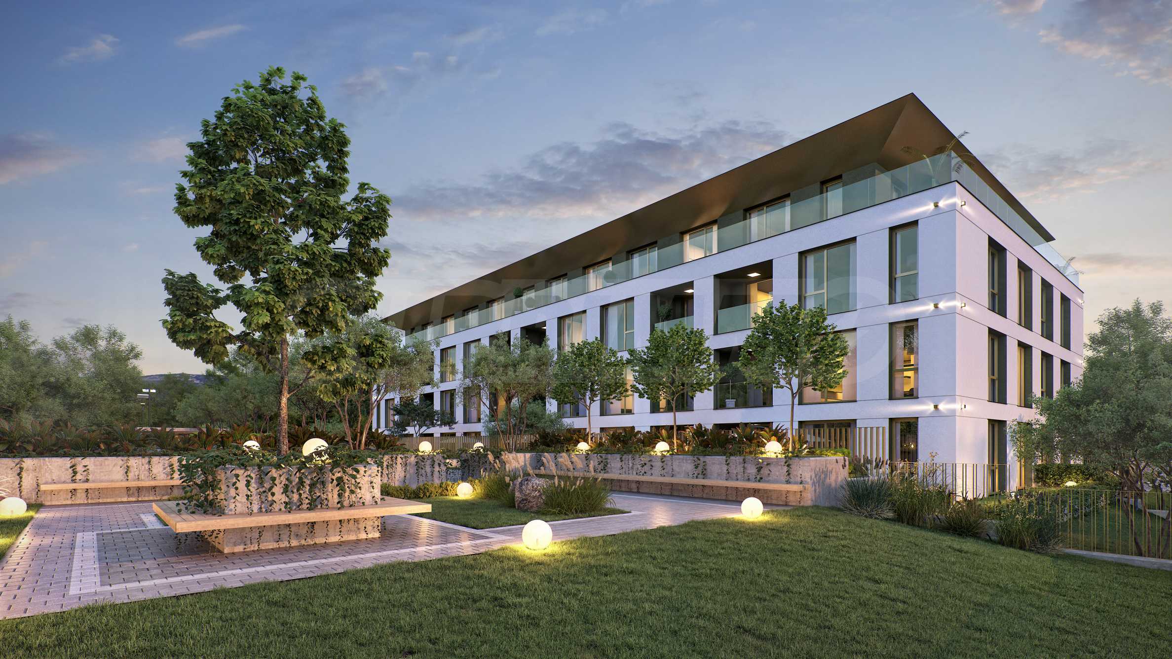 Ландшафтното оформление е ключов елемент в цялостния дизайн на комплекса. Пространствата около сградата включват богата растителност, декоративни дървета, храсти и тревни площи, които създават усещане за хармония и природна среда. Специално внимание е отделено на зелените площи с интегрирани кътове за отдих пешеходни алеи, облицовани с декоративни настилки и външно LED осветление, което подчертава архитектурните детайли през нощта.