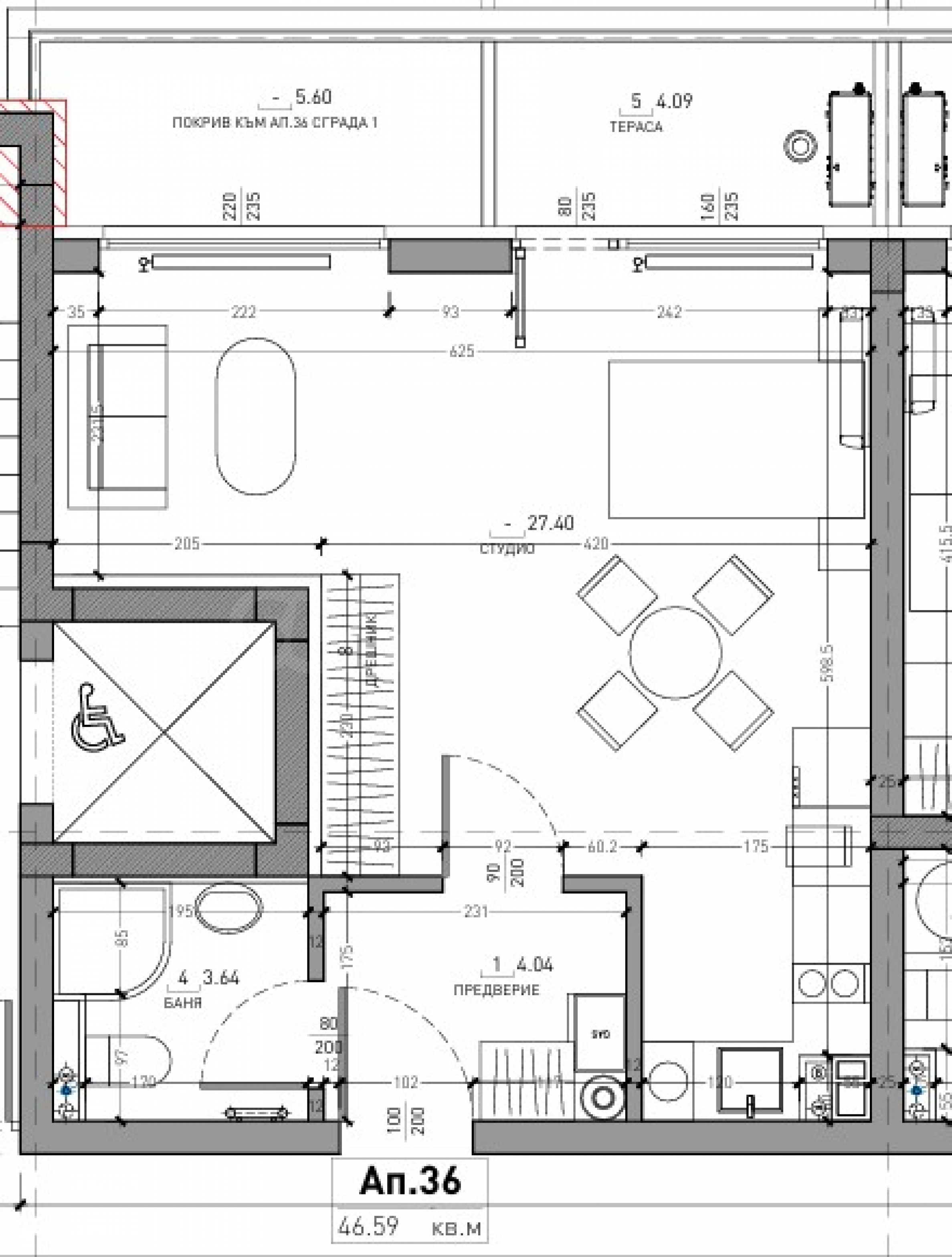 Апартаментът е разположен в Сграда 1, на 4-ти етаж и има обща площ 55.10 кв.м, чиста площ - 46.59 кв.м. Жилището се състои от антре, баня/тоалетна, дневна с кухня и тераса. Продава се в степен на завършеност по БДС.