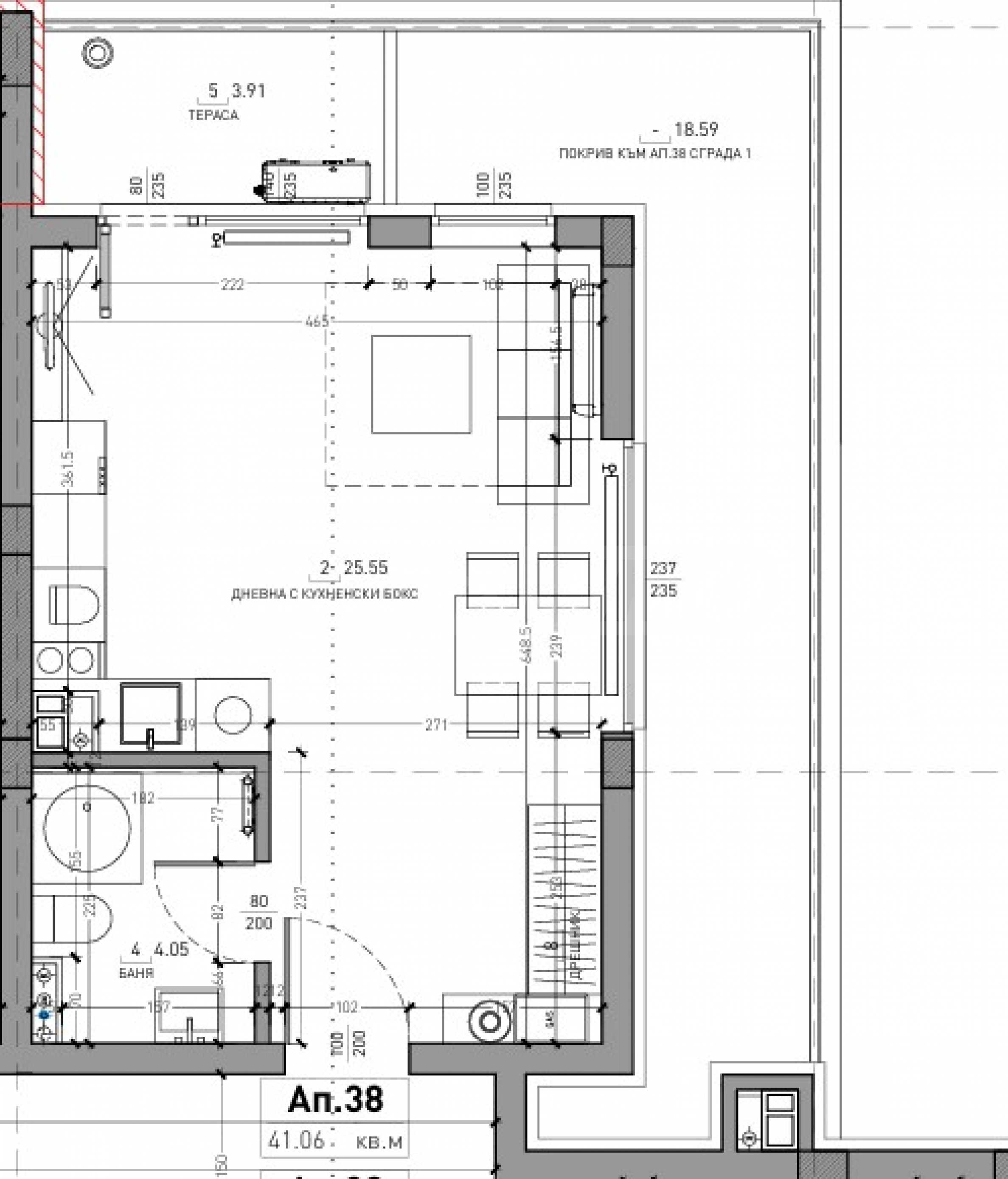 Апартаментът е разположен в Сграда 1, на 4-ти етаж и има обща площ 49.02 кв.м, чиста площ - 41.06 кв.м. Жилището се състои от антре, баня/тоалетна, дневна с кухня и тераса. Към имота има прилежащо покривно пространство от 18.59 кв.м.