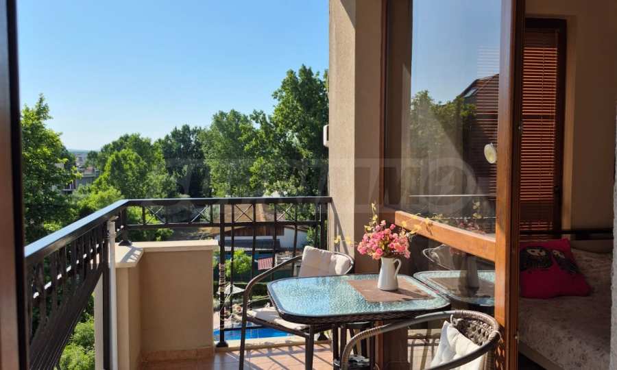 Имотът е с обща площ от 56 кв.м е разположен на 4-ти етаж с гледка към басейна и градината на комплекса.