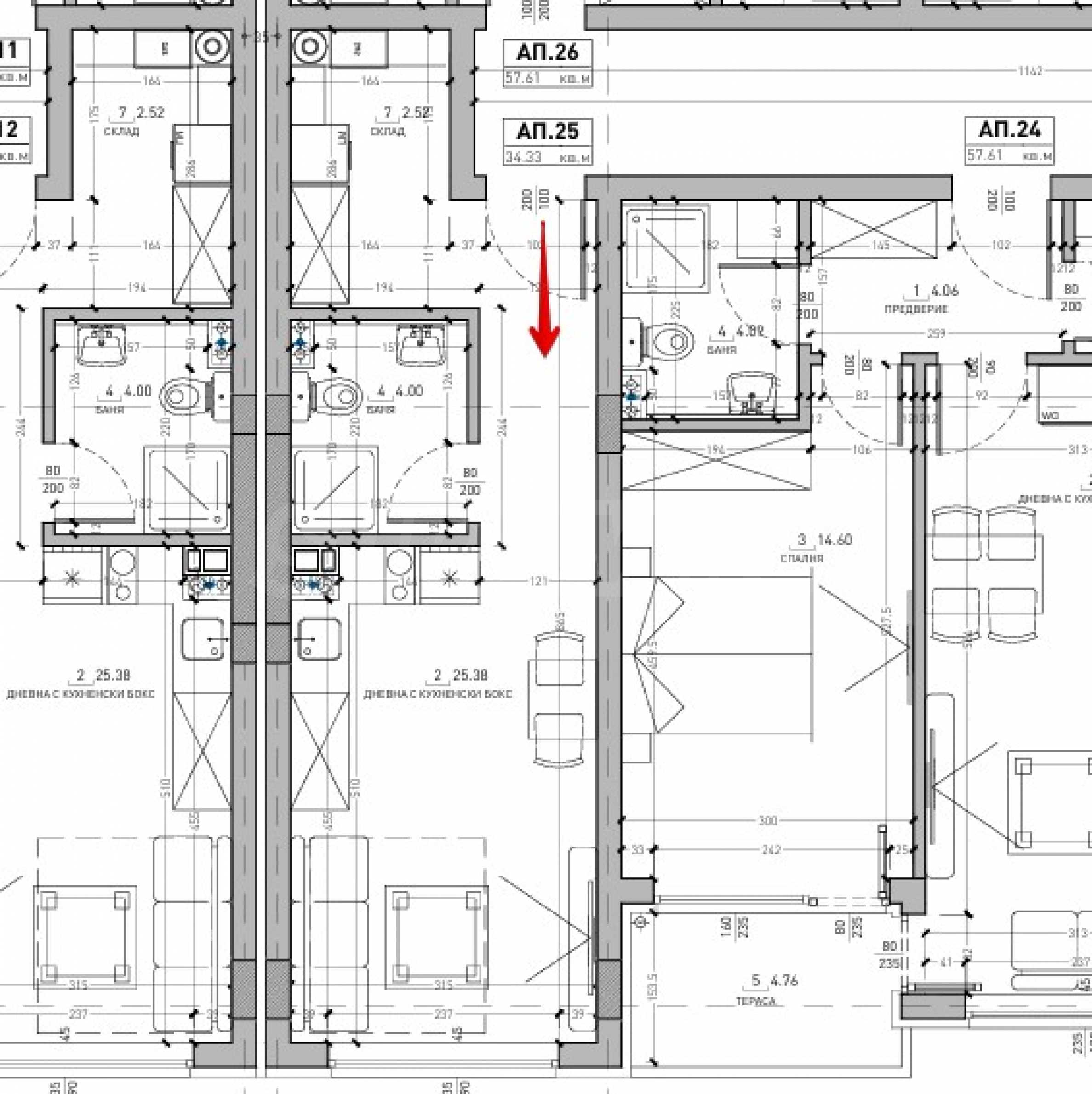 Апартаментът е разположен на 3-ти етаж и има обща площ 40.26 кв.м, чиста площ 34.33 кв.м. Състои се от антре, удобен склад, баня/тоалетна, дневна с кухня. Предлага се в степен на завършеност по БДС (на шпакловка и замазка).