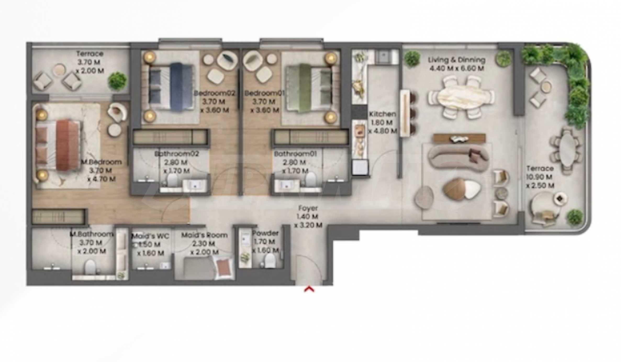 Апартаментът се предлага завършен "до ключ" , което включва поставени подови настилки, осветление, обзавеждане и оборудване в банята и кухнята.