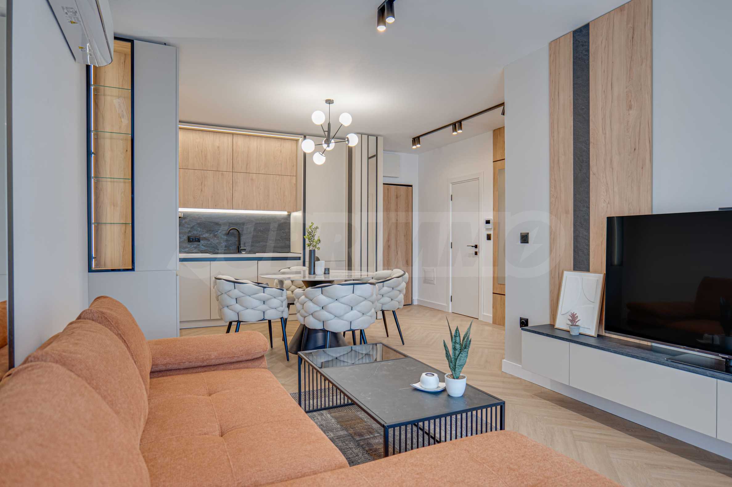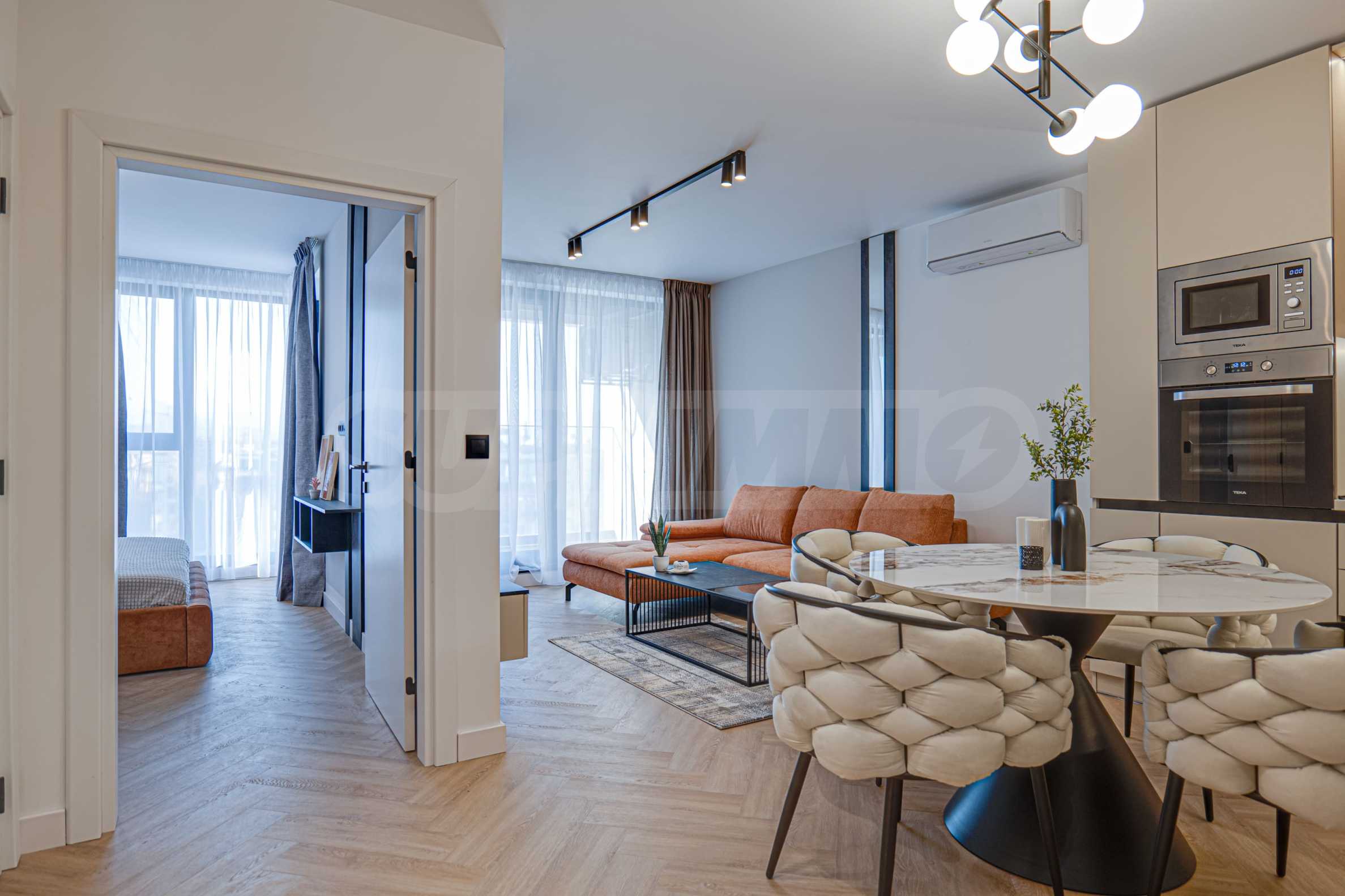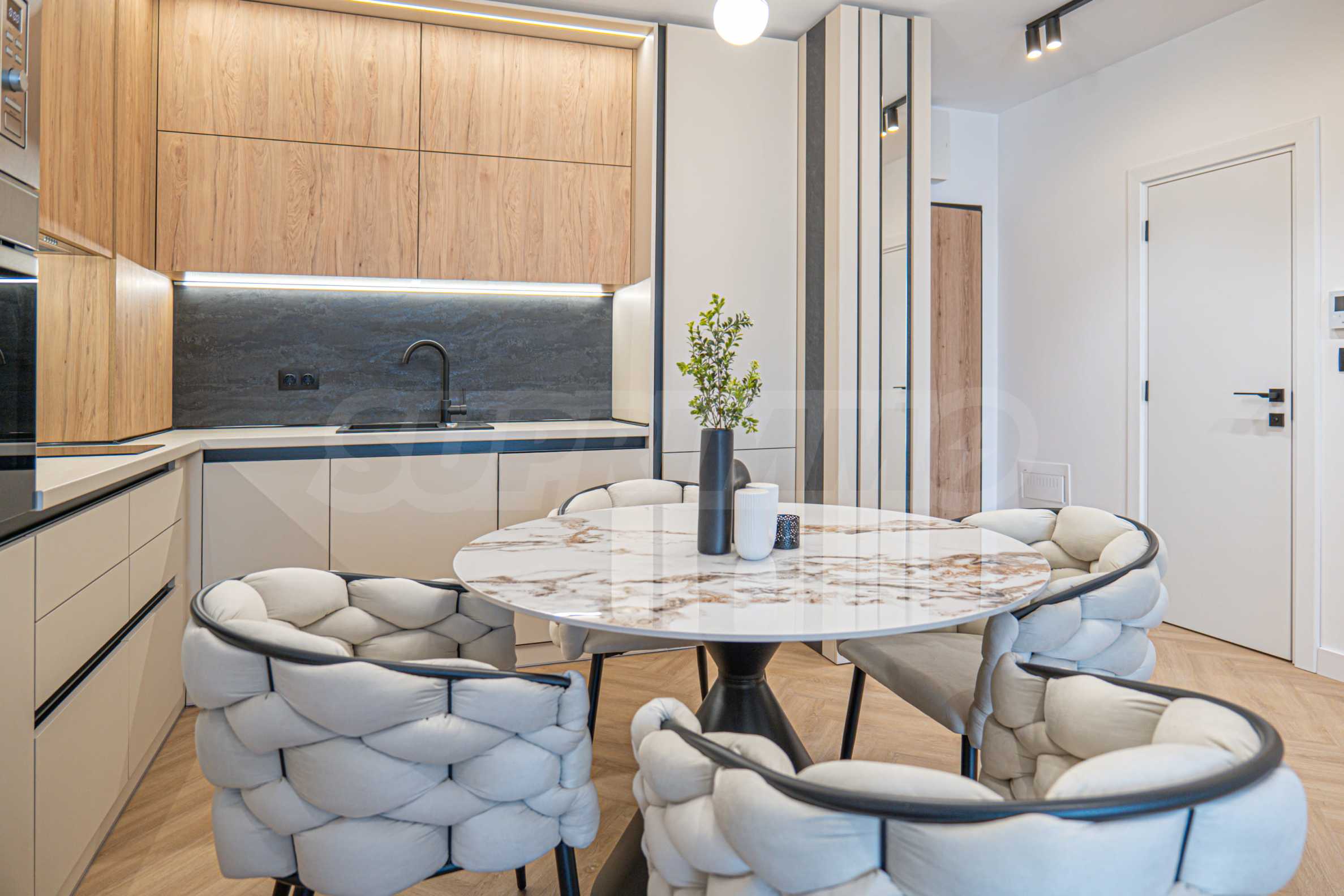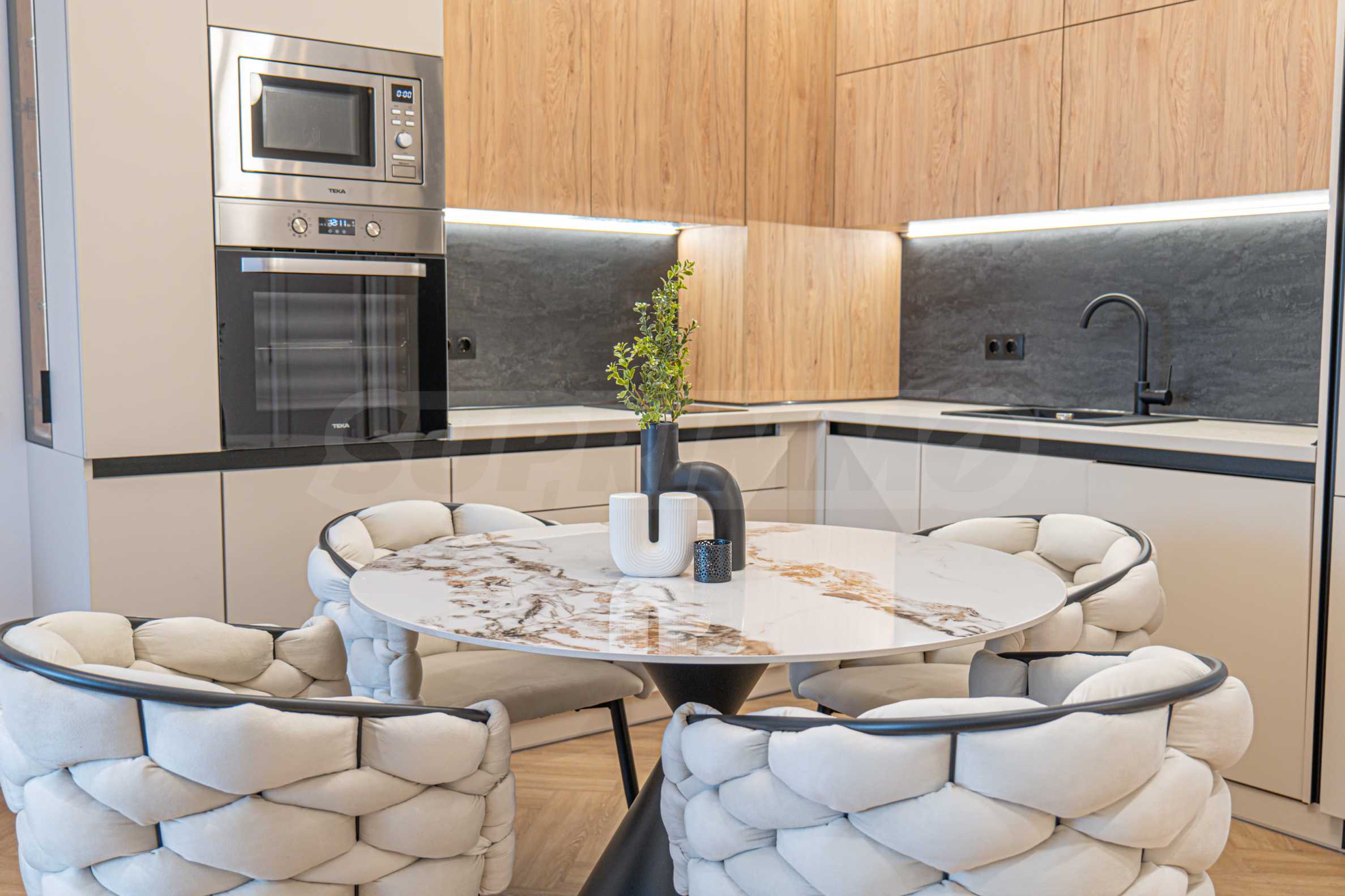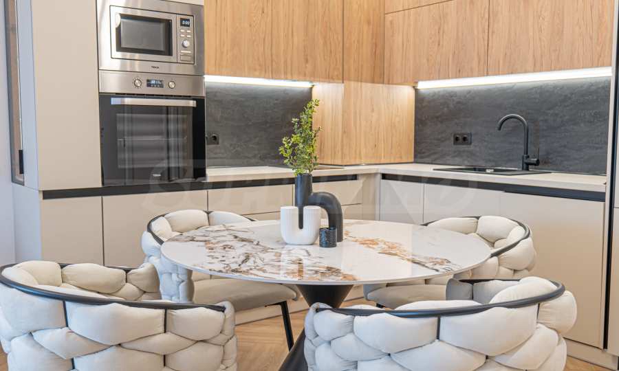 • кухня по поръчка и облицовки стени от МДФ - Egger с обкови Blum; всички вградени електроуреди - ТЕКА;