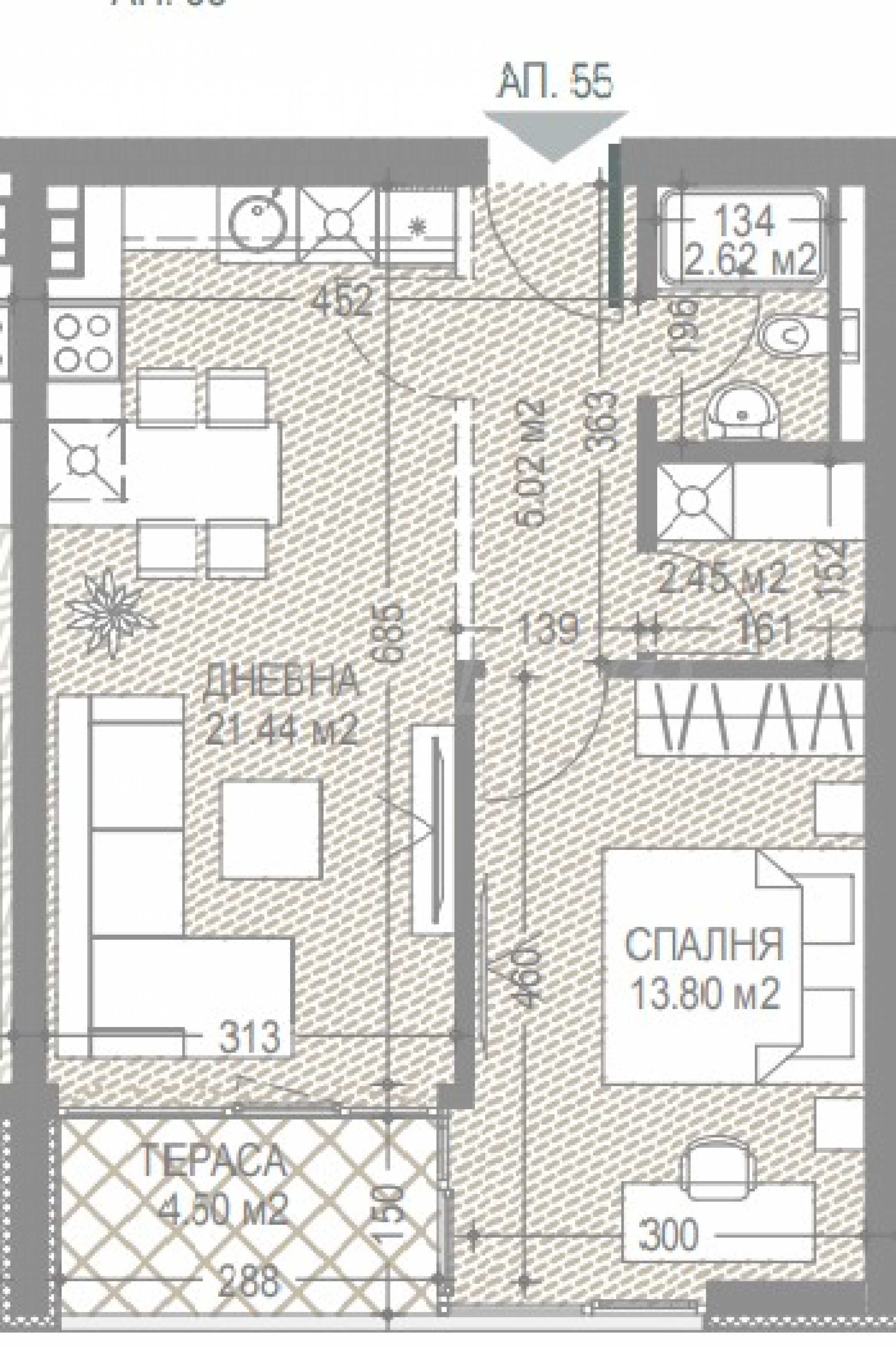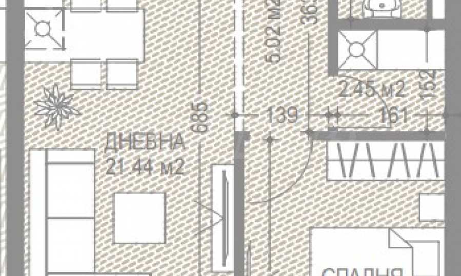 РЗП на имота: 76.54 кв.м. Жилището е разположено на 5-и жилищен етаж от 8 за сградата. Върху застроена площ от 57.85 кв.м са разпределени: дневна с кухня и трапезария, спалня, обща за двете стаи тераса, баня и мокро помещение.