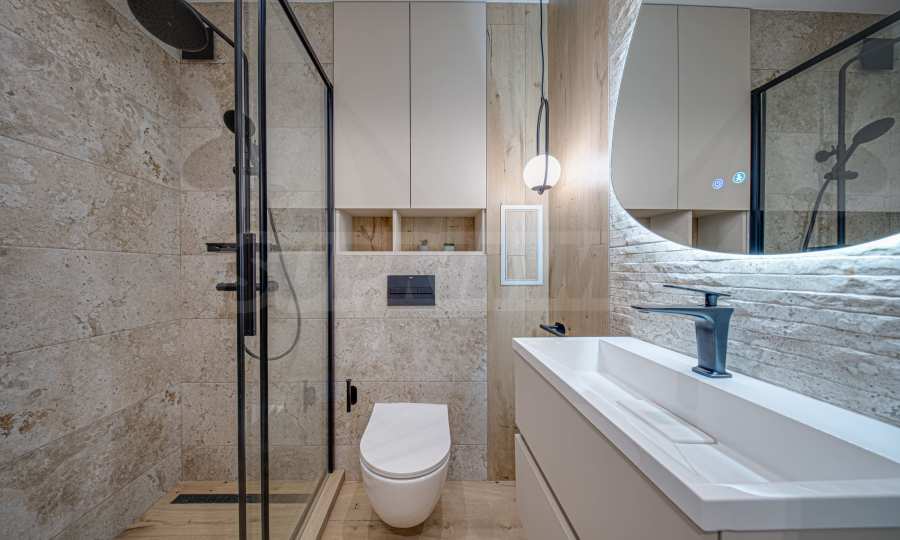• баня – испански гранитогрес от Roca и Porcelanite Dos, 1-во качество; структури за вграждане Roca, шкафове Roca и по поръчка от МДФ;