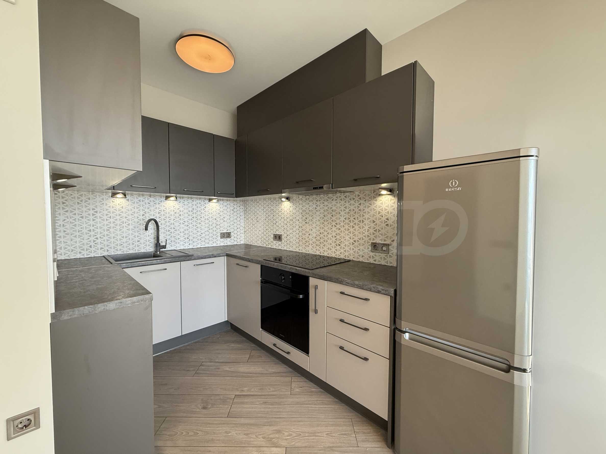 • Кухнята е вградена и напълно оборудвана с бяла техника както следва: фурна, керамични котлони, абсорбатор, съдомиялна машина, хладилник с фризер.