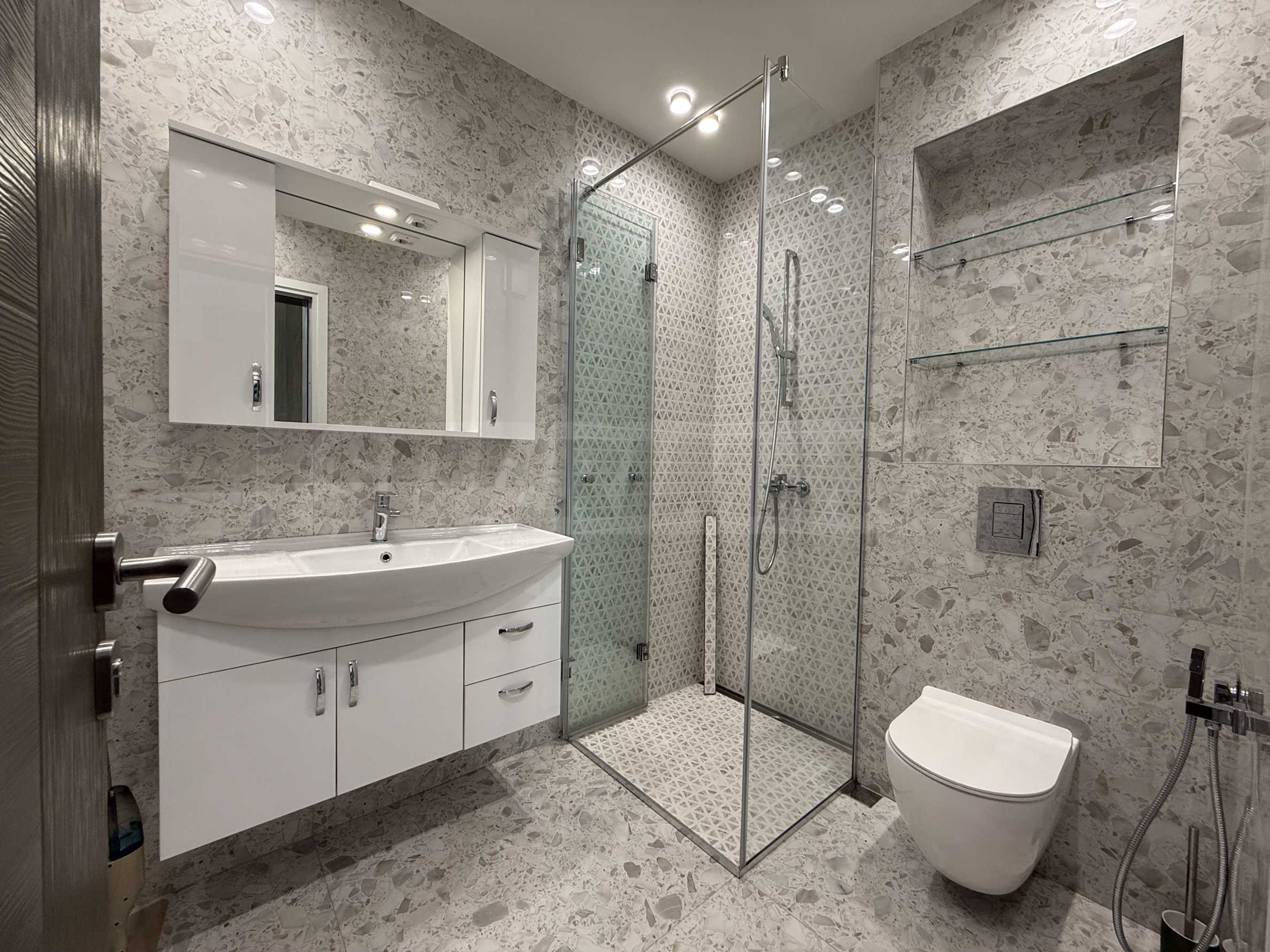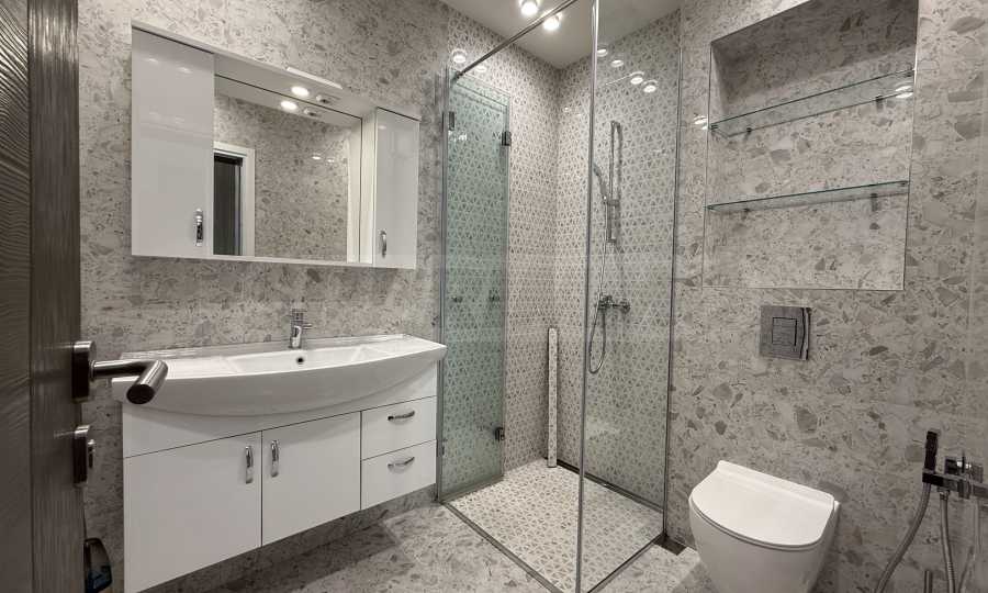 • Банята е оборудвана с висок клас стилна санитария, вкл. тоалетна, мивка и душ кабина.