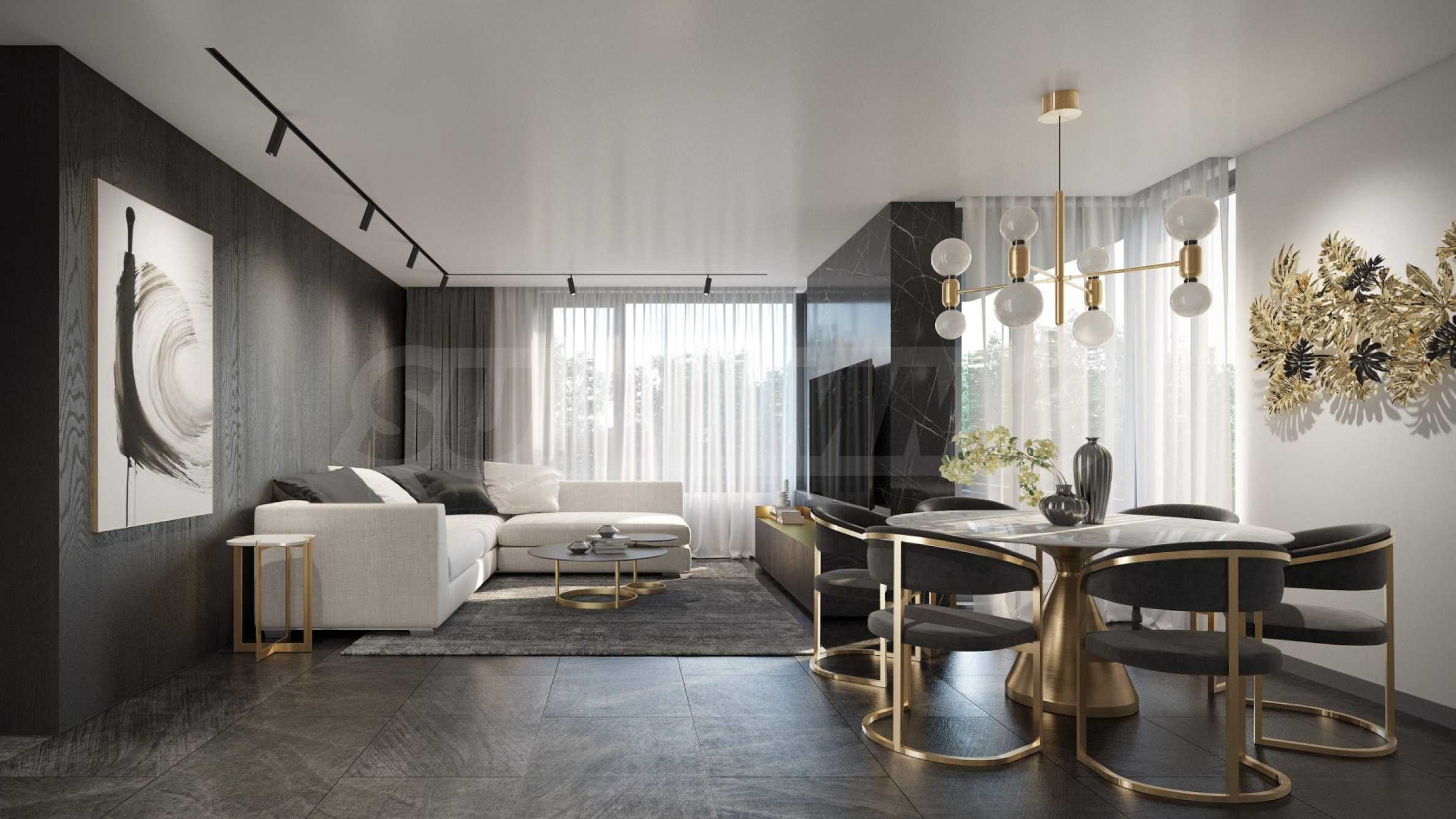 • Общи части: луксозна и съвременна визия с декоративно осветление, подови настилки от камък и стенни облицовки – по интериорен проект.
