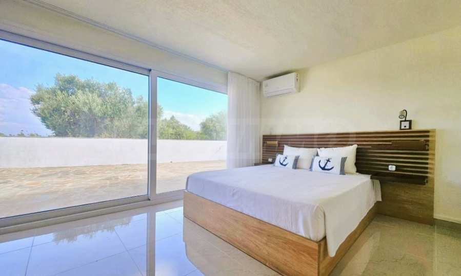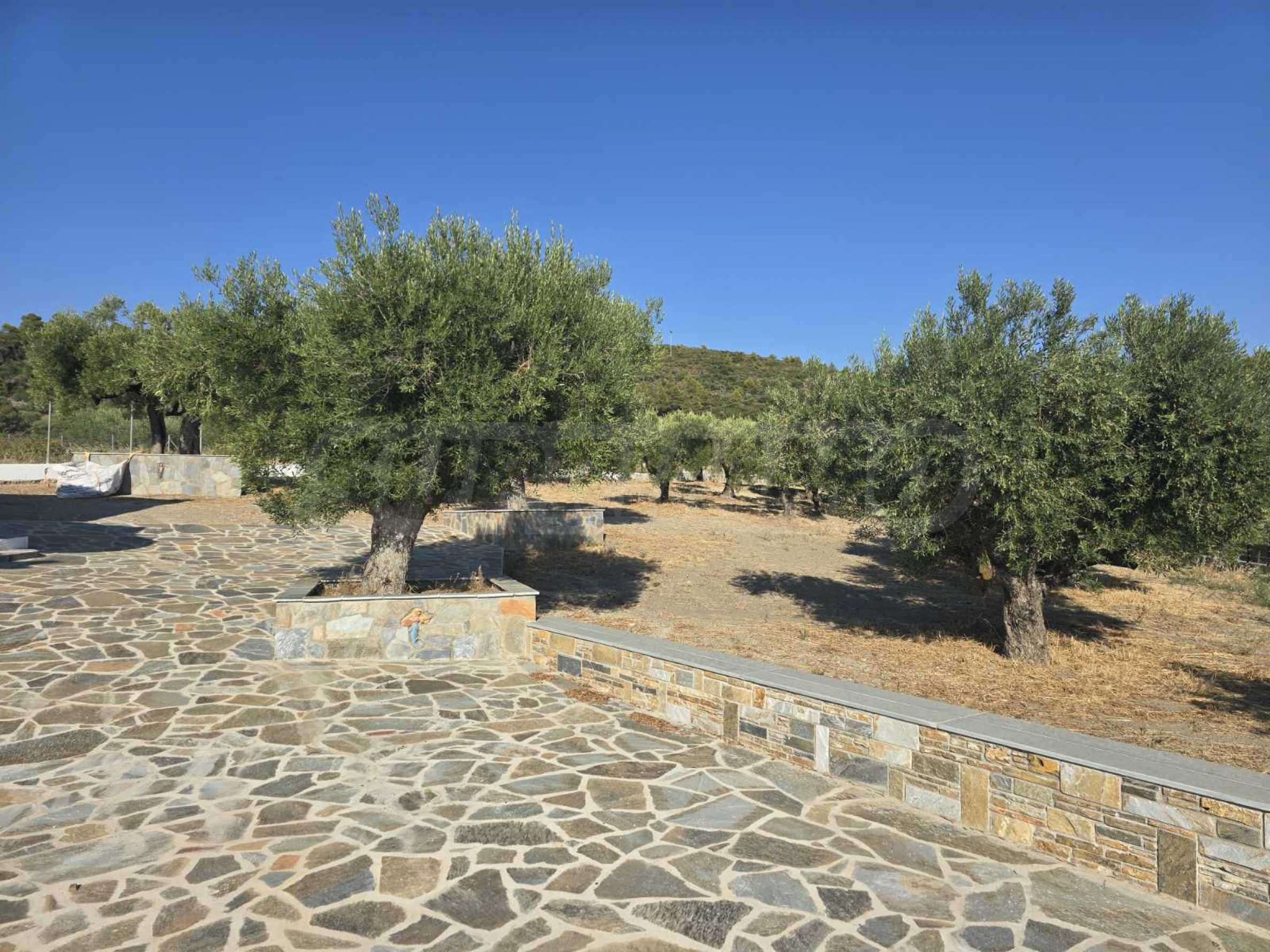Огромният парцел (3,4 дка) е идеален за ландшафтен дизайн, BBQ зона, детски кът или просто спокойна почивка под сянката на маслиновите дръвчета.