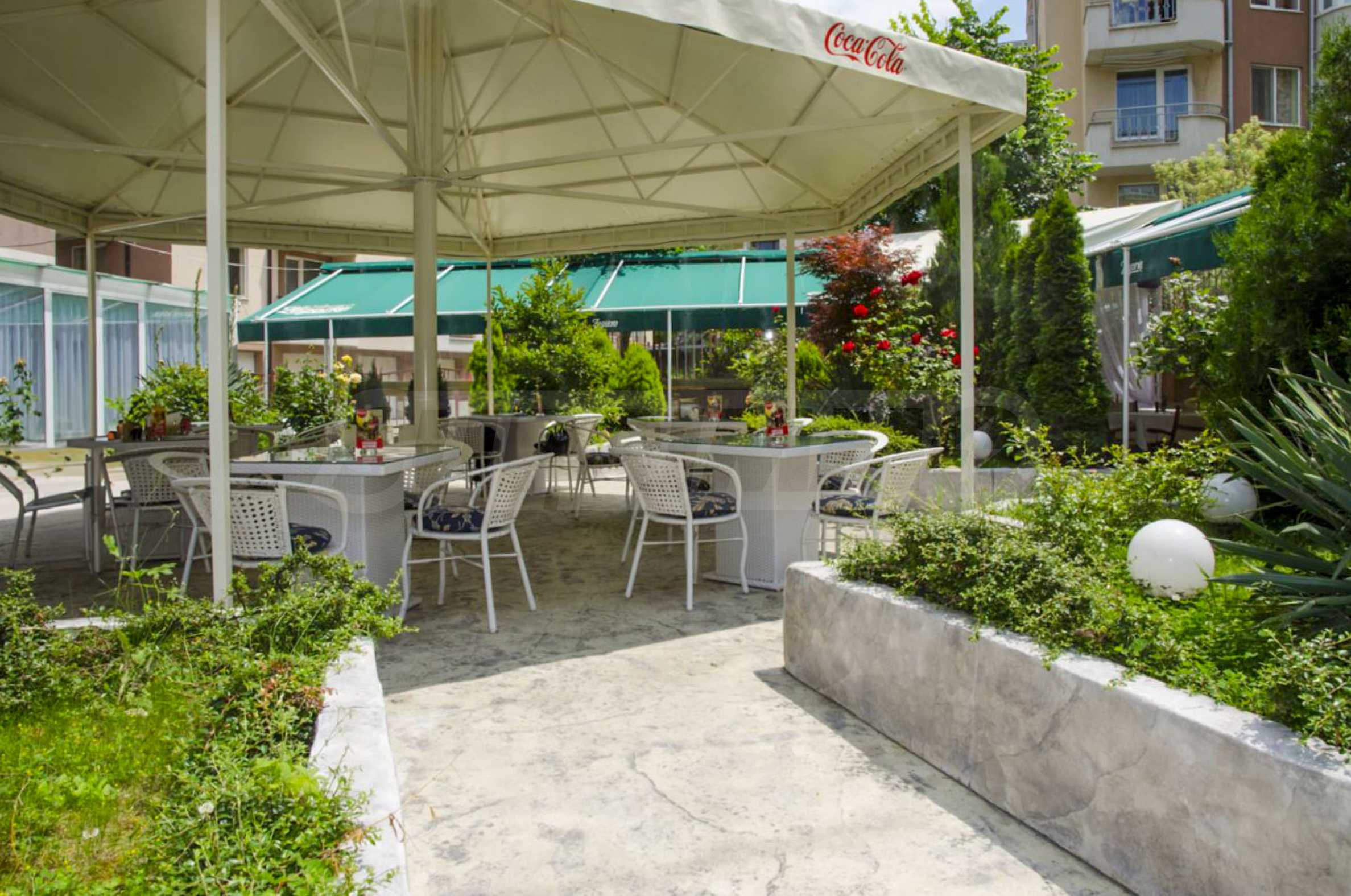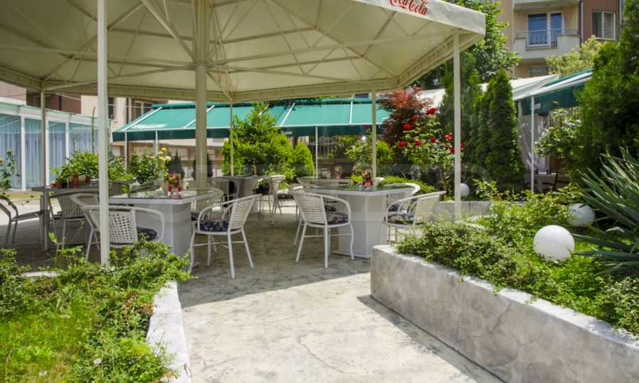 Допълнително предимство на имота е огромната градина, която се ползва безвъзмездно като идеална част от парцела на сградата. Тя е красиво озеленена, с поддържани цветя и зелени площи, предоставяща възможност за разполагане на маси и столове на открито, с което капацитетът на заведението се увеличава на 140 човека.