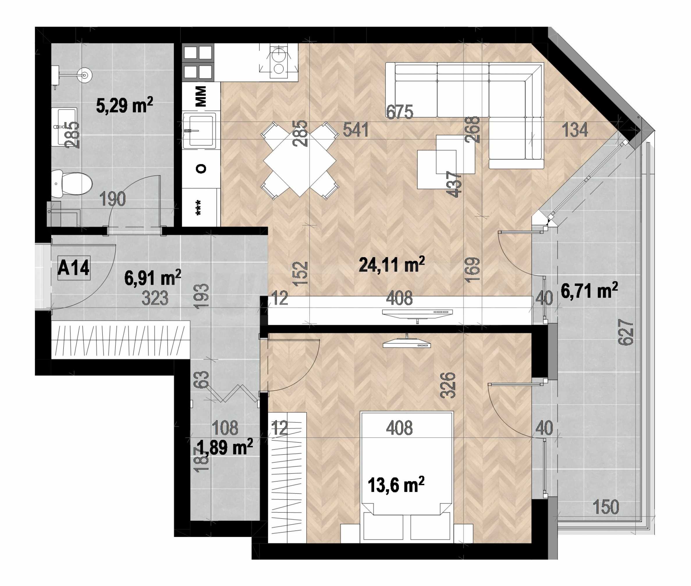 Жилищната площ е 67.16 кв.м, общите части са 9.69 кв.м и има следното разпределение: