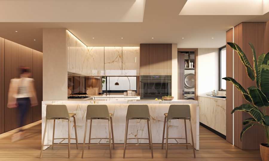 Кухните са оборудвани с плотове от естествен камък (конкретният вид предстои да бъде уточнен), шкафове от MDF с покритие от меламин или термозалепваща Formica, както и плоски вратички в цветове, които тепърва ще бъдат избрани. Ще бъдат инсталирани смесители от неръждаема стомана, газов котлон и вграден фурна, съчетаващи функционалност, издръжливост и съвременен дизайн.