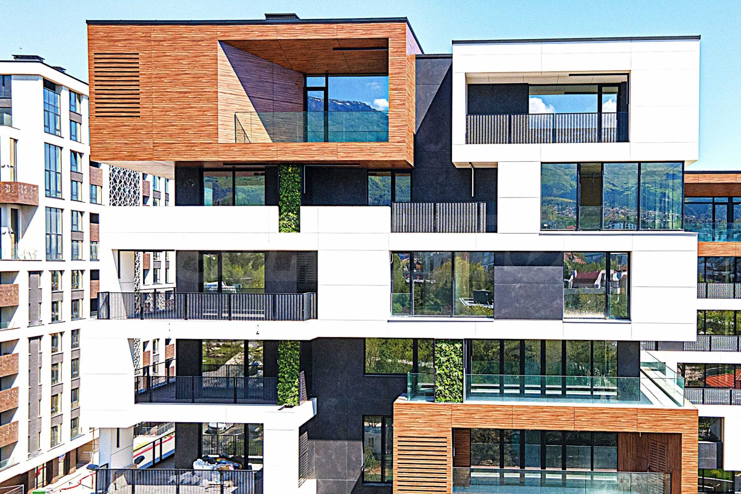 • Oкачена вентилируема фасада от Laminam и HPL плоскости.