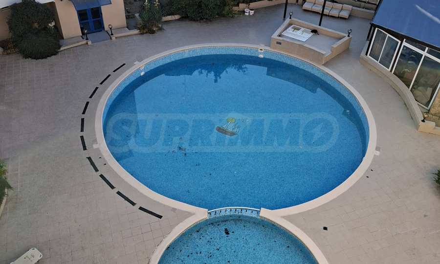 Имотът е с обща площ от 47,66 кв.м, разположен на 4-ти етаж и разполага с антре, помещение със спален кът, оборудвана баня и тераса с гледка към басейна.