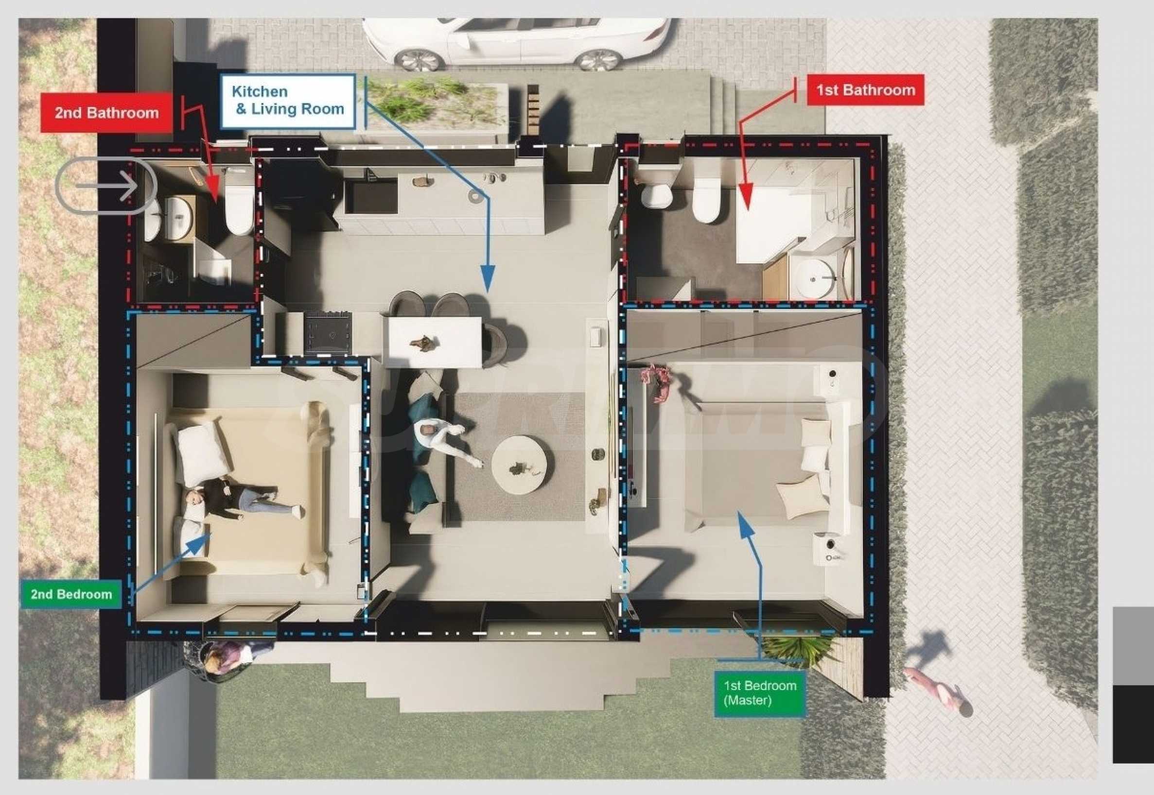 Прегърнете природата: Къщата е заобиколена от очарователна 180 кв.м градина, зелен оазис, който е естествено продължение на вътрешното пространство. Тук можете да се насладите на кафето си под сутрешното слънце, да организирате незабравими барбекюта с приятели или просто да се отпуснете в уюта на откритата всекидневна, усещайки морския бриз.