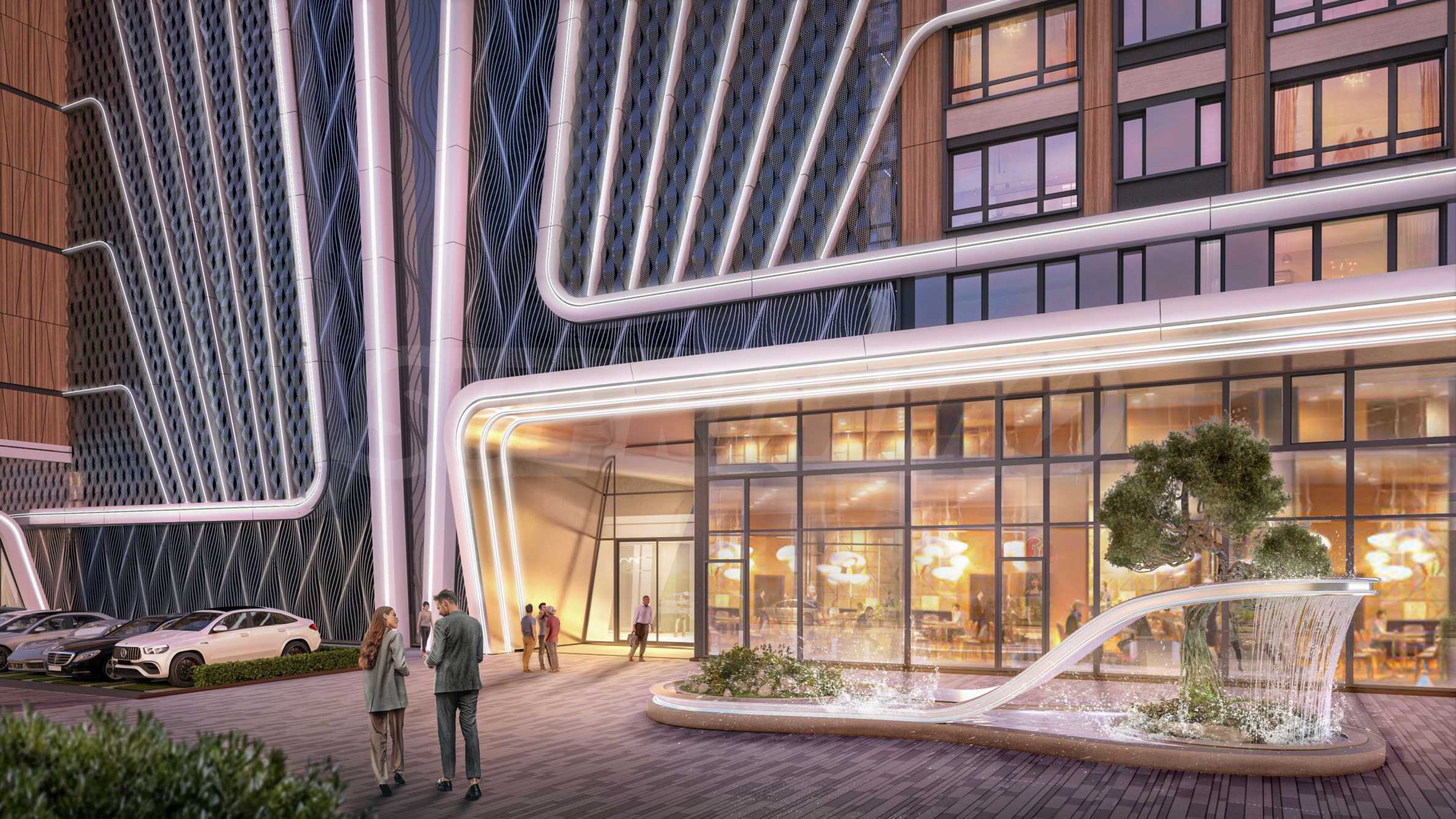 Проектирана е с динамични вертикални и диагонални линии, които създават усещане за движение и енергия. Това придава изключително съвременен и "жив" характер на сградата. Комбинацията от материалите носи хармония между футуристична визия и естествена топлина. Входът е внушителен, с големи витрини и светлинни акценти, а интегрираното LED осветление по контурите на фасадата не само подчертава архитектурната форма, но и създава ефект на блясък и престиж, особено през нощта. То превръща сградата в своеобразен градски ориентир.